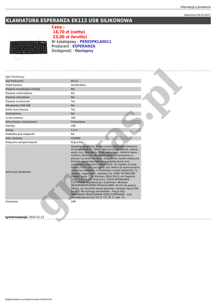 Informacje o produkcie Utworzono 04-03-2017 KLAWIATURA ESPERANZA EK113 USB SILIKONOWA Cena : 18,70 zł (netto) 23,00 zł (brutto) Nr katalogowy : PERESPKLA0011 Producent : ESPERANZA Dostępność : Dostępny Opis Techniczny: EK113 Układ klawiszy Standardowy Klawisze zarządzające energią Nie Klawisze multimedialne Nie Klawisze internetowe Nie Klawisze numeryczne Tak Wbudowany HUB USB Nie Krótki skok klawisza Tak Podświetlenie Nie Liczba klawiszy 108 Komunikacja z komputerem Przewodowa Interfejs USB Zasięg 1,5 m Podkładka pod nadgarstki Nie Kolor obudowy CZARNA Dołączone oprogramowanie Plug & Play Informacje dodatkowe Wygodna, bezgłośna, bardzo cienka, silikonowa klawiatura do komputerów PC i MAC. Odporna na zabrudzenia, zalanie wodą, kurz, detergenty, środki odkażające, niektóre kwasy i roztwory alkaliczne. Niezwykle łatwa w przenoszeniu w plecaku czy torbie na noteb, ooka. Niskie, bardzo elastyczne klawisze zapewniają najwyższą wygodę pisania oraz zapobiegają zmęczeniu nadgarstków. Ze względu na dużą łatwość mycia oraz szczelność jest idealna do wykorzystania na wolnym powietrzu, w środowisku o dużej wilgotności, fa, brykach, magazynach, szpitalach itp. DANE TECHNICZNE Długość kabla: 1.5m Wymiary:380x130x10 mm Napięcie pracy: 5,0+/-0,25V Prąd pracy: 250mA WYMAGANIA SYSTEMOWE Współpracuje z systemami: Windows 98/2000/ME/NT/XP/MS VISTA/Unix/MAC OS 8.6 lub wyższy Obsług, uje wszystkie wersje językowe, wymaga złącza USB lub PS/2 Nie wymaga sterowników – Plug & Play GWARANCJA REALIZOWANA PRZEZ ESPERANZA - mail [email protected] Tel 22 721 35 71 wew. 10 as ok gr Gwarancja synchronizacja: 2014-12-12 Wygenerowano w programie www.oscGold.com 24M .p l Kod Producenta