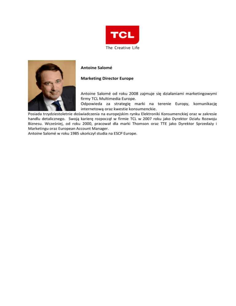 Antoine Salomé Marketing Director Europe Antoine Salomé od roku 2008 zajmuje się działaniami marketingowymi firmy TCL Multimedia Europe. Odpowieda za strategię marki na terenie Europy, komunikację internetową oraz kwestie konsumenckie. Posiada trzydziestoletnie doświadczenia na europejskim rynku Elektroniki Konsumenckiej oraz w zakresie handlu detalicznego. Swoją karierę rozpoczął w firmie TCL w 2007 roku jako Dyrektor Działu Rozwoju Biznesu. Wcześniej, od roku 2000, pracował dla marki Thomson oraz TTE jako Dyrektor Sprzedaży i Marketingu oraz European Account Manager. Antoine Salomé w roku 1985 ukończył studia na ESCP Europe.