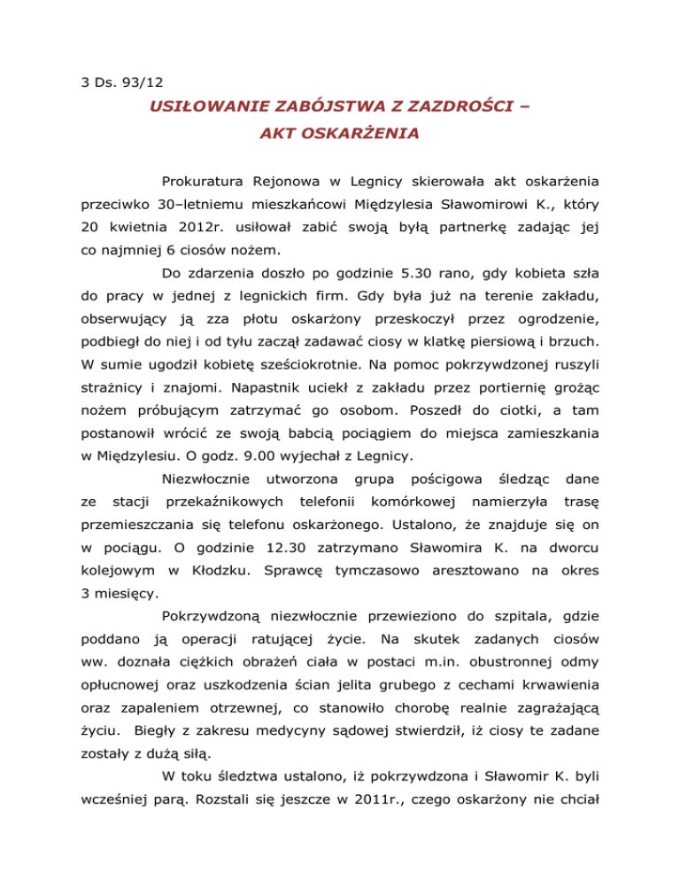 3 Ds. 93/12 USIŁOWANIE ZABÓJSTWA Z ZAZDROŚCI – AKT OSKARŻENIA Prokuratura Rejonowa w Legnicy skierowała akt oskarżenia przeciwko 30–letniemu mieszkańcowi Międzylesia Sławomirowi K., który 20 kwietnia 2012r. usiłował zabić swoją byłą partnerkę zadając jej co najmniej 6 ciosów nożem. Do zdarzenia doszło po godzinie 5.30 rano, gdy kobieta szła do pracy w jednej z legnickich firm. Gdy była już na terenie zakładu, obserwujący ją zza płotu oskarżony przeskoczył przez ogrodzenie, podbiegł do niej i od tyłu zaczął zadawać ciosy w klatkę piersiową i brzuch. W sumie ugodził kobietę sześciokrotnie. Na pomoc pokrzywdzonej ruszyli strażnicy i znajomi. Napastnik uciekł z zakładu przez portiernię grożąc nożem próbującym zatrzymać go osobom. Poszedł do ciotki, a tam postanowił wrócić ze swoją babcią pociągiem do miejsca zamieszkania w Międzylesiu. O godz. 9.00 wyjechał z Legnicy. Niezwłocznie ze stacji utworzona przekaźnikowych grupa telefonii pościgowa komórkowej śledząc dane namierzyła trasę przemieszczania się telefonu oskarżonego. Ustalono, że znajduje się on w pociągu. O godzinie 12.30 zatrzymano Sławomira K. na dworcu kolejowym w Kłodzku. Sprawcę tymczasowo aresztowano na okres 3 miesięcy. Pokrzywdzoną niezwłocznie przewieziono do szpitala, gdzie poddano ją operacji ratującej życie. Na skutek zadanych ciosów ww. doznała ciężkich obrażeń ciała w postaci m.in. obustronnej odmy opłucnowej oraz uszkodzenia ścian jelita grubego z cechami krwawienia oraz zapaleniem otrzewnej, co stanowiło chorobę realnie zagrażającą życiu. Biegły z zakresu medycyny sądowej stwierdził, iż ciosy te zadane zostały z dużą siłą. W toku śledztwa ustalono, iż pokrzywdzona i Sławomir K. byli wcześniej parą. Rozstali się jeszcze w 2011r., czego oskarżony nie chciał 2 zaakceptować. Od tej pory ww. często groził kobiecie i kontrolował jej życie. Straszył, że zrobi krzywdę jej nowemu partnerowi. Dzień przed zdarzeniem w godzinach wieczornych czekał na pokrzywdzoną przed domem, a gdy ta odjechała autem chcąc uniknąć spotkania, wielokrotnie dzwonił do niej bardzo agresywnie grożąc zabójstwem. Wystraszona kobieta zadzwoniła na Policję. Sławomir K. natomiast podenerwowany poszedł na stację paliw, gdzie kupił papierosy, a następnie spędził noc na ławce w parku. O 5 rano poszedł pod zakład pracy byłej partnerki. Nóż kuchenny o długości ostrza około 20 cm zabrał ze sobą już poprzedniego popołudnia. Sławomirowi K. postawiono zarzut usiłowania zabójstwa. Prokurator uznał, iż ww. działał z premedytacją, albowiem jego działania miały charakter przemyślany i zaplanowany, wskazujący na to, że już co najmniej dzień wcześniej lub w nocy rozważał pozbawienie kobiety życia. Ww. przyznał się do popełnienia przestępstwa. Starał się jednak umniejszyć swoją winę zasłaniając się m.in. niepamięcią co do ilości zadanych kobiecie ciosów. Twierdził, iż nóż zabrał tylko po to, aby ją nastraszyć. Po przeprowadzonej w śledztwie obserwacji psychiatrycznej biegli nie stwierdzili u oskarżonego zaburzeń psychotycznych, ani innych zakłóceń czynności psychicznych mogących mieć wpływ na ocenę jego poczytalności. Rozpoznano natomiast u ww. zaburzenia osobowości z cechami osobowości dyssocjalnej. Reasumując - biegli wskazali, że Sławomir K. w czasie zarzucanego mu czynu nie miał zniesionej ani ograniczonej w stopniu znacznym zdolności rozpoznania znaczenia zarzucanego mu czynu i pokierowania swoim postępowaniem. W aktualnym stanie psychicznym może on brać udział w toczącym się postępowaniu i stawać przed sądem. Sławomirowi K. za usiłowanie zabójstwa grozi kara w wymiarze od 8 do 15, 25 lub nawet dożywotniego pozbawienia wolności.