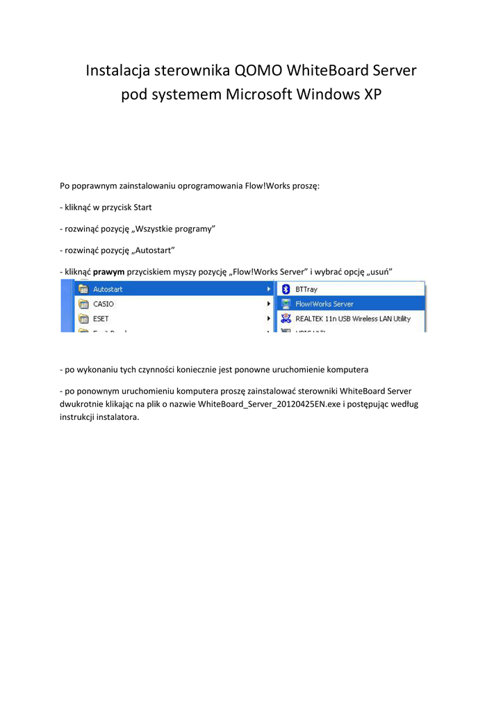 Instalacja sterownika QOMO WhiteBoard Server pod systemem Microsoft Windows XP Po poprawnym zainstalowaniu oprogramowania Flow!Works proszę: - kliknąć w przycisk Start - rozwinąć pozycję „Wszystkie programy” - rozwinąć pozycję „Autostart” - kliknąć prawym przyciskiem myszy pozycję „Flow!Works Server” i wybrać opcję „usuń” - po wykonaniu tych czynności koniecznie jest ponowne uruchomienie komputera - po ponownym uruchomieniu komputera proszę zainstalować sterowniki WhiteBoard Server dwukrotnie klikając na plik o nazwie WhiteBoard_Server_20120425EN.exe i postępując według instrukcji instalatora.