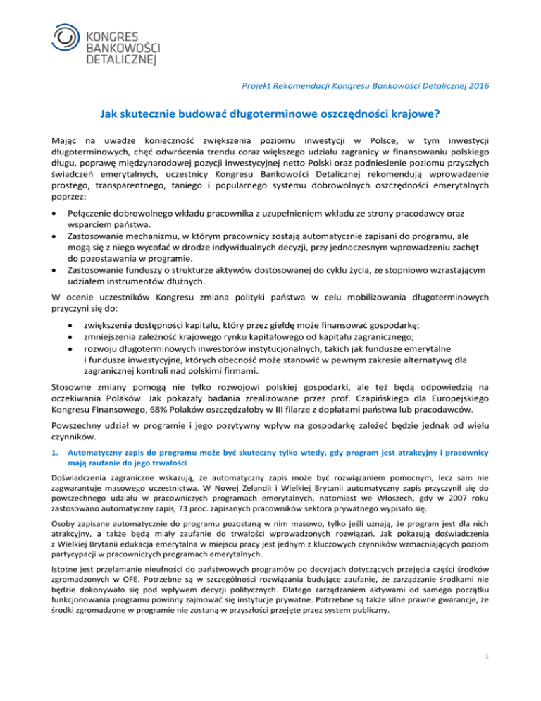 Projekt Rekomendacji Kongresu Bankowości Detalicznej 2016 Jak skutecznie budować długoterminowe oszczędności krajowe? Mając na uwadze konieczność zwiększenia poziomu inwestycji w Polsce, w tym inwestycji długoterminowych, chęć odwrócenia trendu coraz większego udziału zagranicy w finansowaniu polskiego długu, poprawę międzynarodowej pozycji inwestycyjnej netto Polski oraz podniesienie poziomu przyszłych świadczeń emerytalnych, uczestnicy Kongresu Bankowości Detalicznej rekomendują wprowadzenie prostego, transparentnego, taniego i popularnego systemu dobrowolnych oszczędności emerytalnych poprzez: Połączenie dobrowolnego wkładu pracownika z uzupełnieniem wkładu ze strony pracodawcy oraz wsparciem państwa. Zastosowanie mechanizmu, w którym pracownicy zostają automatycznie zapisani do programu, ale mogą się z niego wycofać w drodze indywidualnych decyzji, przy jednoczesnym wprowadzeniu zachęt do pozostawania w programie. Zastosowanie funduszy o strukturze aktywów dostosowanej do cyklu życia, ze stopniowo wzrastającym udziałem instrumentów dłużnych. W ocenie uczestników Kongresu zmiana polityki państwa w celu mobilizowania długoterminowych przyczyni się do: zwiększenia dostępności kapitału, który przez giełdę może finansować gospodarkę; zmniejszenia zależność krajowego rynku kapitałowego od kapitału zagranicznego; rozwoju długoterminowych inwestorów instytucjonalnych, takich jak fundusze emerytalne i fundusze inwestycyjne, których obecność może stanowić w pewnym zakresie alternatywę dla zagranicznej kontroli nad polskimi firmami. Stosowne zmiany pomogą nie tylko rozwojowi polskiej gospodarki, ale też będą odpowiedzią na oczekiwania Polaków. Jak pokazały badania zrealizowane przez prof. Czapińskiego dla Europejskiego Kongresu Finansowego, 68% Polaków oszczędzałoby w III filarze z dopłatami państwa lub pracodawców. Powszechny udział w programie i jego pozytywny wpływ na gospodarkę zależeć będzie jednak od wielu czynników. 1. Automatyczny zapis do programu może być skuteczny tylko wtedy, gdy program jest atrakcyjny i pracownicy mają zaufanie do jego trwałości Doświadczenia zagraniczne wskazują, że automatyczny zapis może być rozwiązaniem pomocnym, lecz sam nie zagwarantuje masowego uczestnictwa. W Nowej Zelandii i Wielkiej Brytanii automatyczny zapis przyczynił się do powszechnego udziału w pracowniczych programach emerytalnych, natomiast we Włoszech, gdy w 2007 roku zastosowano automatyczny zapis, 73 proc. zapisanych pracowników sektora prywatnego wypisało się. Osoby zapisane automatycznie do programu pozostaną w nim masowo, tylko jeśli uznają, że program jest dla nich atrakcyjny, a także będą miały zaufanie do trwałości wprowadzonych rozwiązań. Jak pokazują doświadczenia z Wielkiej Brytanii edukacja emerytalna w miejscu pracy jest jednym z kluczowych czynników wzmacniających poziom partycypacji w pracowniczych programach emerytalnych. Istotne jest przełamanie nieufności do państwowych programów po decyzjach dotyczących przejęcia części środków zgromadzonych w OFE. Potrzebne są w szczególności rozwiązania budujące zaufanie, że zarządzanie środkami nie będzie dokonywało się pod wpływem decyzji politycznych. Dlatego zarządzaniem aktywami od samego początku funkcjonowania programu powinny zajmować się instytucje prywatne. Potrzebne są także silne prawne gwarancje, że środki zgromadzone w programie nie zostaną w przyszłości przejęte przez system publiczny. 1 2. Pozytywny wpływ programu na gospodarkę zależeć będzie nie tylko od wielkości zgromadzonych środków, lecz również od mechanizmów, które umożliwią wykorzystanie tych środków dla rozwoju polskich firm prywatnych Dla gospodarczego i cywilizacyjnego awansu Polski istotne jest to, by firmy, które odnoszą sukcesy mogły rosnąć stając się coraz większe. Dlatego ważne jest by odnoszący sukcesy przedsiębiorcy mogli pozyskiwać nowy kapitał, zwiększając skalę swojej działalności. Takie możliwości stwarza rynek kapitałowy oraz istnienie prywatnych długoterminowych inwestorów instytucjonalnych, którzy mogą być bezpiecznymi dostawcami kapitału dla rosnących firm. Jak pokazuje doświadczenie rozwoju niektórych firm prywatnych w Polsce, pozyskanie kapitału od zdywersyfikowanej grupy inwestorów instytucjonalnych takich jak fundusze emerytalne i fundusze inwestycyjne stanowi atrakcyjną alternatywę w stosunku do oddania kontroli nad firmą zagranicznemu inwestorowi strategicznemu. Natomiast, takiej alternatywy nie będzie stanowić oddanie, w zamian za pozyskany kapitał, istotnego udziału w firmie funduszowi emerytalnemu kontrolowanemu pośrednio przez skarb państwa. Biorąc pod uwagę, że w Polsce istnieje już rozwinięta infrastruktura instytucji mających doświadczenie w obsłudze i zarządzaniu długoterminowymi oszczędnościami (fundusze inwestycyjne, OFE, agenci transferowi), postulujemy, aby od początku istnienia proponowanych przez rząd Pracowniczych Planów Kapitałowych do ich obsługi i zarządzania ich aktywami były dopuszczone podlegające nadzorowi instytucje komercyjne o odpowiednich kwalifikacjach i doświadczeniu. Celowe jest przy tym wprowadzenie proponowanego limitu kosztów w wysokości nie więcej niż 0,6 proc. w relacji do aktywów oraz zakaz akwizycji w stosunku do indywidualnych uczestników. 3. Przed uruchomieniem programu należy określić zasady wypłat Z punktu widzenia interesów uczestników, podstawowym celem programu jest zapewnienie środków na emeryturę. Dlatego należy rozważyć różne opcje wypłaty emerytur, w tym zasady wymiany zgromadzonego kapitału na rentę dożywotnią. Rozważenia wymaga też wprowadzenie jednorazowej wypłaty emerytury dla osób, które mają zgromadzony niski 1 kapitał, czy też specjalnego produktu: „elastycznej renty dożywotniej”, opartego o odrębne rozwiązanie ustawow