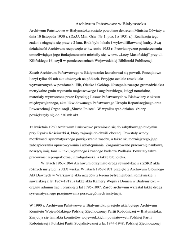 Archiwum Państwowe w Białymstoku Archiwum Państwowe w Białymstoku zostało powołane dekretem Ministra Oświaty z dnia 10 listopada 1950 r. (Dz.U. Min. Ośw. Nr 1, poz. I z 1951 r.). Realizacja tego zadania ciągnęła się prawie 2 lata. Brak było lokalu i wykwalifikowanej kadry. Swą działalność Archiwum rozpoczęło w kwietniu 1953 r. Prowizoryczne pomieszczenia umożliwiające jego funkcjonowanie mieściły się w tzw. „Loży Masońskiej” przy ul. Kilińskiego 16, czyli w pomieszczeniach Wojewódzkiej Biblioteki Publicznej. Zasób Archiwum Państwowego w Białymstoku kształtował się powoli. Początkowo liczył tylko 55 mb akt ułożonych na półkach. Przyjęto ocalałe resztki akt wytworzonych w powiatach: Ełk, Olecko i Gołdap. Następnie zaczęto gromadzić akta metrykalne gmin wyznania mojżeszowego i augsburskiego, księgi notarialne, materiały wytworzone przez Dyrekcję Lasów Państwowych w Białowieży z okresu międzywojennego, akta likwidowanego Państwowego Urzędu Repatriacyjnego oraz Powszechnej Organizacji „Służba Polsce”. W wyniku tych działań zbiory powiększyły się do 330 mb akt. 15 kwietnia 1960 Archiwum Państwowe przeniosło się do zabytkowego budynku przy Rynku Kościuszki 4, który zajmuje do chwili obecnej. Powstały wtedy możliwości systematycznego powiększania zasobu, a także skuteczniejszego jego zabezpieczania opracowywania i udostępniania. Zorganizowano pracownię naukową noszącą imię Jana Glinki, wybitnego i znanego badacza Podlasia. Powstały także pracownie: reprograficzna, introligatorska, a także biblioteka. W latach 1963-1964 Archiwum otrzymało drogą rewindykacji z ZSRR akta różnych instytucji z XIX wieku. W latach 1968-1971 przejęto z Archiwum Głównego Akt Dawnych w Warszawie akta urzędów z terenu byłych guberni łomżyńskiej i suwalskiej z lat 1867-1917, a także akta Kamery Wojny i Domen w Białymstoku – organu administracji pruskiej z lat 1795-1807. Zasób archiwum wzrastał także drogą systematycznego przejmowania poszczególnych instytucji. W 1990 r. Archiwum Państwowe w Białymstoku przejęło akta byłego Archiwum Komitetu Wojewódzkiego Polskiej Zjednoczonej Partii Robotniczej w Białymstoku. Znajdują się tam akta komitetów wojewódzkich i powiatowych Polskiej Partii Robotniczej i Polskiej Partii Socjalistycznej z lat 1944-1948, Polskiej Zjednoczonej Partii Robotniczej z lat 1948-1990, organizacji młodzieżowych. W chwili obecnej Archiwum prowadzi działalność na podstawie ustawy o narodowym zasobie archiwalnym i archiwach z 14 lipca 1983 r. (Dz.U. Nr 38, poz. 173 z późn. zm.) jako Archiwum Państwowe w Białymstoku z Oddziałem w Łomży. ZASÓB Strukturę organizacyjną Archiwum tworzą właściwe komórki merytoryczne – Oddziały: Opracowania, Nadzoru Archiwalnego oraz Ewidencji, Informacji i Udostępniania. Pracownicy wymienionych Oddziałów zajmują się materiałami archiwalnymi na kolejnych etapach drogi od aktotwórcy do użytkownika. Aktualnie zasób białostockiego Archiwum składa się z 1,5 tys. zespołów akt i zbiorów liczących ponad 166 tys. jednostek archiwalnych, co stanowi 1843 metry bieżące akt. Obejmuje materiały od początku XVII w. do czasów najnowszych. Najstarszy dokument pochodzi z 1640 r. Jest to Księga grodzka drohicka. Na szczególną uwagę zasługują akta: Kamery i Wojny i Domen z lat 1795-1807, Starszego Notariusza Sądu Okręgowego w Grodnie z lat 1883-1914 (ze względu na specyficzny ustrój urzędu i dokumentację jest to zespół unikalny w zasobie archiwów państwowych w Polsce) oraz urzędów administracji państwowej guberni łomżyńskiej, Urzędu Wojewódzkiego Białostockiego z lat 1920-1939, Urzędu Wojewódzkiego Białostockiego z lat 1944-1950. Archiwum przechowuje akta administracji państwowej ogólnej i specjalnej, administracji samorządowej, wymiaru sprawiedliwości, notarialne i metrykalne, akta miast i gmin, instytucji finansowych, organizacji spółdzielczych i społecznych, stowarzyszeń i partii politycznych, a także zakładów przemysłowych. Do specyfiki zasobu należy także niemal zupełny brak materiałów wytworzonych przez kolejne władze okupacyjne: radzieckie i niemieckie w okresie II wojny światowej. W naszym zasobie znajdują się także zbiory kartograficzne i fotograficzne. Archiwum posiada również zbiory mikrofilmów, długości liczącej ponad 2700 m. Archiwum sprawuje nadzór nad 188 jednostkami organizacyjnymi. W ramach nadzoru kontroluje archiwa zakładowe, wydaje zezwolenia na niszczenie dokumentacji nierachiwalnej, opiniuje przepisy kancelaryjne, szkoli personel archiwów zakładowych. Zasób Archiwum udostępniany jest w Pracowni Naukowej czynnej codziennie (oprócz sobót) w godzinach od 8 do 15, w oparciu o Zarządzenie nr 4 Naczelnego Dyrektora Archiwów Państwowych z dnia 18 maja 2000 r. w sprawie organizacji udostępniania materiałów archiwalnych w archiwach państwowych. W świetle przytoczonego Zarządzenia archiwa państwowe udostępniają materiały archiwalne osobom fizycznym lub prawnym, organizacjom społecznym, organom państwowym i samorządowym oraz jednostkom organizacyjnym nie posiadającym osobowości prawnej. Osoby fizyczne korzystają z materiałów we własnym imieniu lub charakterze upoważnionych pełnomocników podmiotów prawnych. Użytkownicy mają do dyspozycji dostępne pomoce archiwalne (dostęp do pomocy może być wyjątkowo ograniczony ze względu na przeszkody prawne, przede wszystkim w zakresie ochrony informacji niejawnych, danych osobowych, lub dóbr osobistych.), mogą również zamawiać odpłatne reprodukcje. Jako urząd wiary publicznej Archiwum wydaje w oparciu o posiadane akta odpisy dokumentów i zaświadczenia. Pracownicy wykonują liczne poszukiwania majątkowe, genealogiczne, odszkodowawcze na rzecz instytucji oraz osób prywatnych z kraju i zagranicy (m.in. za represje ze strony władz komunistycznych). Niestety brak jest w naszym zasobie do