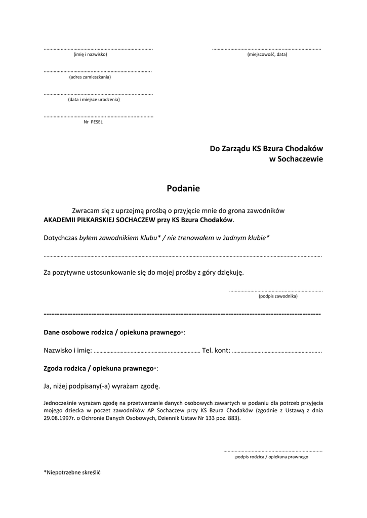 ……………………………….…………………………………. ………….……………………………….……………………… (imię i nazwisko) (miejscowość, data) ……………………………..………………………………….. (adres zamieszkania) ………………………………………………………..………… (data i miejsce urodzenia) ……………………………………..………………...………… Nr PESEL Do Zarządu KS Bzura Chodaków w Sochaczewie Podanie Zwracam się z uprzejmą prośbą o przyjęcie mnie do grona zawodników AKADEMII PIŁKARSKIEJ SOCHACZEW przy KS Bzura Chodaków. Dotychczas byłem zawodnikiem Klubu* / nie trenowałem w żadnym klubie* …………………………………………………………………………………………………..…………………………………………………………….…………. Za pozytywne ustosunkowanie się do mojej prośby z góry dziękuję. ………………………………..………………………. (podpis zawodnika) --------------------------------------------------------------------------------------------------------Dane osobowe rodzica / opiekuna prawnego*: Nazwisko i imię: ………………………………………….…..………………… Tel. kont: ………………….……………………………..…... Zgoda rodzica / opiekuna prawnego*: Ja, niżej podpisany(-a) wyrażam zgodę. Jednocześnie wyrażam zgodę na przetwarzanie danych osobowych zawartych w podaniu dla potrzeb przyjęcia mojego dziecka w poczet zawodników AP Sochaczew przy KS Bzura Chodaków (zgodnie z Ustawą z dnia 29.08.1997r. o Ochronie Danych Osobowych, Dziennik Ustaw Nr 133 poz. 883). ……………………………………………………………. podpis rodzica / opiekuna prawnego *Niepotrzebne skreślić