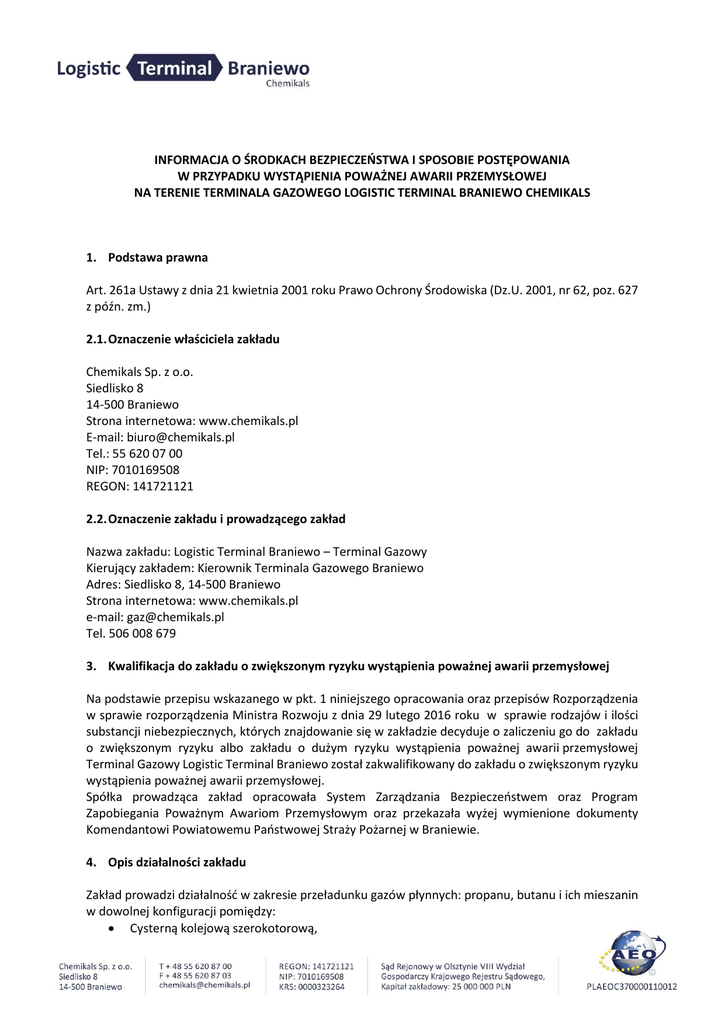 INFORMACJA O ŚRODKACH BEZPIECZEŃSTWA I SPOSOBIE POSTĘPOWANIA W PRZYPADKU WYSTĄPIENIA POWAŻNEJ AWARII PRZEMYSŁOWEJ NA TERENIE TERMINALA GAZOWEGO LOGISTIC TERMINAL BRANIEWO CHEMIKALS 1. Podstawa prawna Art. 261a Ustawy z dnia 21 kwietnia 2001 roku Prawo Ochrony Środowiska (Dz.U. 2001, nr 62, poz. 627 z późn. zm.) 2.1. Oznaczenie właściciela zakładu Chemikals Sp. z o.o. Siedlisko 8 14-500 Braniewo Strona internetowa: www.chemikals.pl E-mail: [email protected] Tel.: 55 620 07 00 NIP: 7010169508 REGON: 141721121 2.2. Oznaczenie zakładu i prowadzącego zakład Nazwa zakładu: Logistic Terminal Braniewo – Terminal Gazowy Kierujący zakładem: Kierownik Terminala Gazowego Braniewo Adres: Siedlisko 8, 14-500 Braniewo Strona internetowa: www.chemikals.pl e-mail: [email protected] Tel. 506 008 679 3. Kwalifikacja do zakładu o zwiększonym ryzyku wystąpienia poważnej awarii przemysłowej Na podstawie przepisu wskazanego w pkt. 1 niniejszego opracowania oraz przepisów Rozporządzenia w sprawie rozporządzenia Ministra Rozwoju z dnia 29 lutego 2016 roku w sprawie rodzajów i ilości substancji niebezpiecznych, których znajdowanie się w zakładzie decyduje o zaliczeniu go do zakładu o zwiększonym ryzyku albo zakładu o dużym ryzyku wystąpienia poważnej awarii przemysłowej Terminal Gazowy Logistic Terminal Braniewo został zakwalifikowany do zakładu o zwiększonym ryzyku wystąpienia poważnej awarii przemysłowej. Spółka prowadząca zakład opracowała System Zarządzania Bezpieczeństwem oraz Program Zapobiegania Poważnym Awariom Przemysłowym oraz przekazała wyżej wymienione dokumenty Komendantowi Powiatowemu Państwowej Straży Pożarnej w Braniewie. 4. Opis działalności zakładu Zakład prowadzi działalność w zakresie przeładunku gazów płynnych: propanu, butanu i ich mieszanin w dowolnej konfiguracji pomiędzy: Cysterną kolejową szerokotorową, Cysterną kolejową normalnotorową, Cysterną drogową, Zbiornikiem magazynowym. Przeładunek odbywa się za pomocą sprężarek par gazu oraz pomp gazu za pośrednictwem rurociągów technologicznych. 5. Charakterystyka składowanych substancji niebezpiecznych z uwzględnieniem ich nazw i kategorii oraz zagrożeń jakie powodują. 5.1. Propan Nazwa chemiczna: propan Nr CAS/ Nr WE/ Nr indeksowy: 74-98-6 / 200-827-9 / 601-003-00-5 Nr rejestracji: Substancja zwolniona z rejestracji na podstawie załącznika V rozporządzenia (WE) nr 1907/2006 (REACH). Klasyfikacja substancji Klasyfikacja zgodna z rozporządzeniem (WE) nr 1272/2008 (CLP): Zagrożenia wynikające z właściwości fizykochemicznych: Gaz łatwopalny: Flam. Gas. 1 (H220 Skrajnie łatwopalny gaz). dla człowieka: Nie sklasyfikowano dla środowiska: Nie sklasyfikowano Gaz pod ciśnieniem: Press. Gas (H280 Zawiera gaz pod ciśnieniem; ogrzanie grozi wybuchem). Gaz skroplony. Elementy oznakowania Piktogram: GHS02 GHS04 wskazujące rodzaj zagrożenia: Hasło ostrzegawcze: Niebezpieczeństwo Zwroty H220 Skrajnie łatwopalny gaz. H280 Zawiera gaz pod ciśnieniem; ogrzanie grozi wybuchem. Zwroty wskazujące środki ostrożności: P102 Chronić przed dziećmi. P210 Przechowywać z dala od źródeł ciepła, gorących powierzchni, iskrzenia, otwartego ognia i innych źródeł zapłonu. Palenie wzbronione. P243 Przedsięwziąć środki ostrożności zapobiegające statycznemu rozładowaniu. P377 W przypadku płonięcia wyciekającego gazu: Nie gasić, jeżeli nie można bezpiecznie zahamować wycieku. P381 Wyeliminować wszystkie źródła zapłonu, jeżeli jest to bezpieczne. P410+P403 Chronić przed światłem słonecznym. Przechowywać w dobrze wentylowanym miejscu. Inne zagrożenia Tworzy mieszaniny wybuchowe z powietrzem. W wysokich stężeniach działa słabo drażniąco, słabo narkotyczne oraz dusząco na skutek wypierania tlenu z otaczającego powietrza. Bezpośredni kontakt ze skroplonym gazem może powodować odmrożenia. 5.2. Butan Nazwa chemiczna: butan Nr CAS/ Nr WE/ Nr indeksowy: 106-97-8 / 203-448-7 / 601-004-00-0 Nr rejestracji: Substancja zwolniona z rejestracji na podstawie załącznika V rozporządzenia (WE) nr 1907/2006 (REACH). Klasyfikacja substancji Klasyfikacja zgodna z rozporządzeniem (WE) nr 1272/2008 (CLP): Zagrożenia wynikające z właściwości fizykochemicznych: dla człowieka: dla środowiska: Gaz łatwopalny: Flam. Gas. 1 (H220 Skrajnie łatwopalny gaz). Gaz pod ciśnieniem: Press. Gas (H280 Zawiera gaz pod ciśnieniem; ogrzanie grozi wybuchem). Gaz skroplony. Nie sklasyfikowano Nie sklasyfikowano Elementy oznakowania Piktogram: GHS02 GHS04 wskazujące rodzaj zagrożenia: Hasło ostrzegawcze: Niebezpieczeństwo Zwroty H220 Skrajnie łatwopalny gaz. H280 Zawiera gaz pod ciśnieniem; ogrzanie grozi wybuchem. Zwroty wskazujące środki ostrożności: P102 Chronić przed dziećmi. P210 Przechowywać z dala od źródeł ciepła, gorących powierzchni, iskrzenia, otwartego ognia i innych źródeł zapłonu. Palenie wzbronione. P243 Przedsięwziąć środki ostrożności zapobiegające statycznemu rozładowaniu. P377 W przypadku płonięcia wyciekającego gazu: Nie gasić, jeżeli nie można bezpiecznie zahamować wycieku. P381 Wyeliminować wszystkie źródła zapłonu, jeżeli jest to bezpieczne. P410+P403 Chronić przed światłem słonecznym. Przechowywać w dobrze wentylowanym miejscu. Inne zagrożenia Tworzy mieszaniny wybuchowe z powietrzem. W wysokich stężeniach działa słabo drażniąco, słabo narkotyczne oraz dusząco na skutek wypierania tlenu z otaczającego powietrza. Bezpośredni kontakt ze skroplonym gazem może powodować odmrożenia. 5.3. Mieszanina propan-butan Nazwa chemiczna: Gazy z ropy naftowej, skroplone; Gazy z ropy naftowej Nazwa handlowa: Gaz płynny LPG Synonimy: Mieszanina propan-butan, Mieszanina B Nr CAS/ Nr WE/ Nr indeksowy: 68476-85-7 / 270-704-2 / 649-202-00-6 Nr rejestracji: Substancja zwolniona z rejestracji na podstawie załącznika V rozporządzenia (WE) nr 1907/2006 (REACH). Klasyfikacja mieszanin