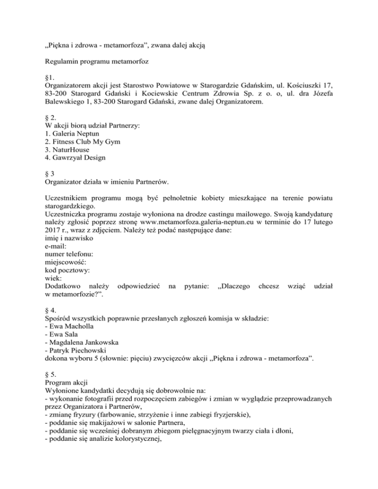 „Piękna i zdrowa - metamorfoza”, zwana dalej akcją Regulamin programu metamorfoz §1. Organizatorem akcji jest Starostwo Powiatowe w Starogardzie Gdańskim, ul. Kościuszki 17, 83-200 Starogard Gdański i Kociewskie Centrum Zdrowia Sp. z o. o, ul. dra Józefa Balewskiego 1, 83-200 Starogard Gdański, zwane dalej Organizatorem. § 2. W akcji biorą udział Partnerzy: 1. Galeria Neptun 2. Fitness Club My Gym 3. NaturHouse 4. Gawrzyał Design §3 Organizator działa w imieniu Partnerów. Uczestnikiem programu mogą być pełnoletnie kobiety mieszkające na terenie powiatu starogardzkiego. Uczestniczka programu zostaje wyłoniona na drodze castingu mailowego. Swoją kandydaturę należy zgłosić poprzez stronę www.metamorfoza.galeria-neptun.eu w terminie do 17 lutego 2017 r., wraz z zdjęciem. Należy też podać następujące dane: imię i nazwisko e-mail: numer telefonu: miejscowość: kod pocztowy: wiek: Dodatkowo należy odpowiedzieć na pytanie: „Dlaczego chcesz wziąć udział w metamorfozie?”. § 4. Spośród wszystkich poprawnie przesłanych zgłoszeń komisja w składzie: - Ewa Macholla - Ewa Sala - Magdalena Jankowska - Patryk Piechowski dokona wyboru 5 (słownie: pięciu) zwycięzców akcji „Piękna i zdrowa - metamorfoza”. § 5. Program akcji Wyłonione kandydatki decydują się dobrowolnie na: - wykonanie fotografii przed rozpoczęciem zabiegów i zmian w wyglądzie przeprowadzanych przez Organizatora i Partnerów, - zmianę fryzury (farbowanie, strzyżenie i inne zabiegi fryzjerskie), - poddanie się makijażowi w salonie Partnera, - poddanie się wcześniej dobranym zbiegom pielęgnacyjnym twarzy ciała i dłoni, - poddanie się analizie kolorystycznej, - poddanie się stylizacji sylwetki i udziałowi w doborze ubrań, - poddanie się końcowemu przygotowaniu do sesji zdjęciowej: uczesanie fryzury, wykonanie makijażu, - udział w finałowej sesji fotograficznej, - poddanie się badaniom laboratoryjnym, - udział w zajęciach ruchowych z trenerem personalnym - wizytę u dietetyka § 6. Program akcji przeprowadzony jest bezpłatnie. § 7. Uczestniczka akcji wyraża zgodę na wykorzystanie materiału fotograficznego z przebiegu metamorfozy do celów reklamowych i marketingowych przez Organizatora i Partnerów. § 8. Uczestniczka akcji zobowiązana jest do podpisania oświadczenia o braku przeciwwskazań do ćwiczeń fizycznych. § 9. Uczestniczka zobowiązuje się do stawienia się na wcześniej umówione przez obie strony miejsca wykonywania kolejnych etapów akcji. § 10. Organizator zapewnia profesjonalną obsługę akcji przez osoby o wysokich kwalifikacjach zawodowych i dokłada wszelkich starań, aby jej przebieg był zgodny ze sztuką zawodową na każdym swoim etapie. Za główny cel stawia sobie dobro i zadowolenie z zaprowadzonych zmian w wizerunku uczestniczki. § 11. Żadne z wykonanych usług lub innych świadczeń wykonanych w programie akcji nie podlegają reklamacji, ani innym roszczeniom ze strony uczestniczki. Żadne usługi wykonywane podczas akcji nie mogą być wymienione na gotówkę. § 12. Wszelkie inne regulacje prawne niewyszczególnione w tym regulaminie podlegają pod prawo polskie Kodeksu Cywilnego. § 13. Wszelkie spory rozstrzyga właściwy sąd okręgowy.