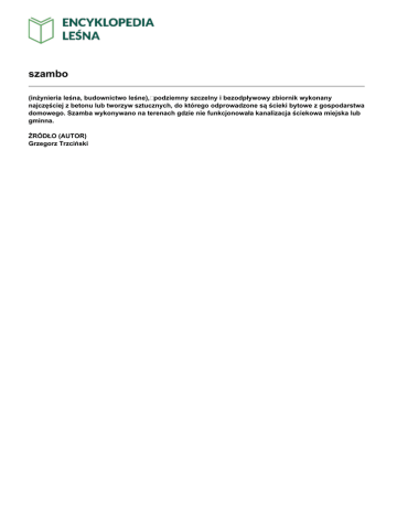 szambo (inżynieria leśna, budownictwo leśne), podziemny szczelny i bezodpływowy zbiornik wykonany najczęściej z betonu lub tworzyw sztucznych, do którego odprowadzone są ścieki bytowe z gospodarstwa domowego. Szamba wykonywano na terenach gdzie nie funkcjonowała kanalizacja ściekowa miejska lub gminna. ŹRÓDŁO (AUTOR) Grzegorz Trzciński