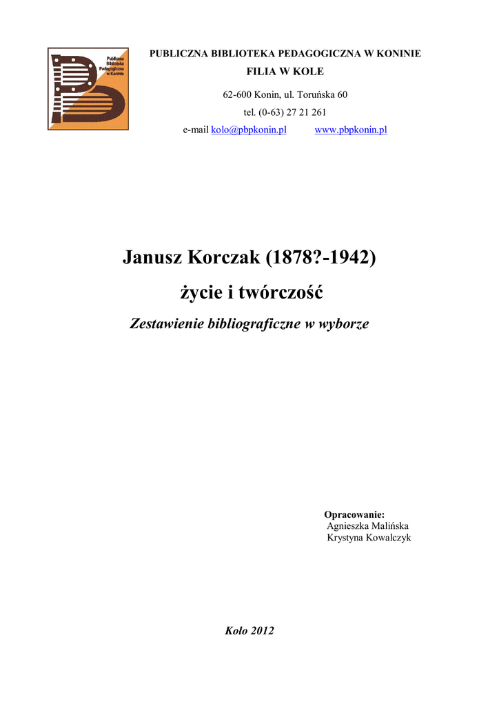 PUBLICZNA BIBLIOTEKA PEDAGOGICZNA W KONINIE FILIA W KOLE 62-600 Konin, ul. Toruńska 60 tel. (0-63) 27 21 261 e-mail [email protected] www.pbpkonin.pl Janusz Korczak (1878?-1942) życie i twórczość Zestawienie bibliograficzne w wyborze Opracowanie: Agnieszka Malińska Krystyna Kowalczyk Koło 2012 WYDAWNICTWA ZWARTE 1. Jak kochać dziecko / Janusz Korczak.- Warszawa : Jacek Santorski i CO Wydawnictwo, [1992]. Sygnatura: 27403 , 29104 2. Jak kochać dziecko : internat kolonie letnie / Janusz Korczak.- Warszawa : Państwowe Zakłady Wydawnictw Szkolnych, 1958. Sygnatura: 2980 3. Jak kochać dziecko ; Prawo dziecka do szacunku / Janusz Korczak.- Warszawa : Wydawnictwo Akademickie "Żak", 2002. Sygnatura: 33659 4. Janusz Korczak / Alicja Szlązakowa.- Warszawa : Wydawnictwa Szkolne i Pedagogiczne, 1978. Sygnatura: 19031 5. Janusz Korczak / Hanna Mortkowicz-Olczakowa.- Wyd. 5.- Warszawa : "Czytelnik", 1978. Sygnatura: 19005 6. Janusz Korczak / Hanna Mortkowicz-Olczakowa.- Warszawa : "Czytelnik", 1957. Sygnatura: 2053 7. Janusz Korczak / Marek Jaworski.- Wyd. 2 rozszerz.- Warszawa : Wydawnictwo Interpress, 1977. Sygnatura: 18623 , 18758 8. Józki, Jaśki i Franki / Janusz Korczak ; il. Katarzyna Gintowt.- Warszawa : Krajowa Agencja Wydawnicza, 1985. Sygnatura: 23092 , 23093 , 23094 9. Kajtuś czarodziej / Janusz Korczak ; il. Tomasz Borowski.- Wyd. 4.- Warszawa : "Nasza Księgarnia", 1986. Sygnatura: 23536 , 23537 10. Kalendarz życia, działalności i twórczości Janusza Korczaka / Maria Falkowska ; [przedm.] Aleksander Lewin ; [IS] Instytut Badań Pedagogicznych. Zakład Systemów Wychowawczych. Pracownia Korczakowska.- Warszawa : "Nasza Księgarnia", 1989. Sygnatura: 26100 11. Korczak - człowiek, badacz, pedagog i wykładowca / red. Ireneusz Jan Pyrzyk.- Włocławek : Wyższa Szkoła Humanistyczno-Ekonomiczna, 2003. Sygnatura: 33695 12. Korczak / Stefan Wołoszyn.- Wyd. 2.- Warszawa : "Wiedza Powszechna", 1982. Sygnatura: 21537 13. Korczak : próba biografii / Joanna Olczak-Ronikier ; [red. Barbara Stahl].- Warszawa : Wydawnictwo W.A.B., 2011. Sygnatura: 37267 14. Korczakowskie dialogi / red. nauk. Jadwiga Bińczycka.- Warszawa : Wydawnictwo Akademickie "Żak", 1999. 2 Sygnatura: 33239 15. Król Maciuś na wyspie bezludnej / Janusz Korczak.- Wyd. 8.- Warszawa : "Nasza Księgarnia", 1984. Sygnatura: 33428 16. Król Maciuś Pierwszy / Janusz Korczak ; il. Waldemar Andrzejewski ; [wstępem opatrzył] Igor Newerly.- Wyd. 9.- Warszawa : "Nasza Księgarnia", 1983. Sygnatura: 33427 17. Król Maciuś Pierwszy / Janusz Korczak.- Kraków ; Poznań : Wydawnictwo Zielona Sowa : Oficyna Wydawnicza Wielkopolski, [2005]. Sygnatura: 34036 18. Międzynarodowy Rok Dziecka 1979 : Janusz Korczak - sesja popularnonaukowa : materiały metodyczno-informacyjne : wydanie specjalne / red. Konrad Czajka [i in.].- Konin : Kuratorium Oświaty i Wychowania, 1979. Sygnatura: 25862 19. Myśl pedagogiczna Janusza Korczaka : nowe źródła / wybór Maria Falkowska ; [wstęp Aleksander Lewin]; Instytut Badań Pedagogicznych. Zakład Badań Systemów Wychowawczych. Pracownia Korczakowska.- Warszawa : Nasza Księgarnia, 1983. Sygnatura: 21809 20. Myśli / Janusz Korczak ; wybrała i wstępem opatrzyła Hanna Kirchner.- Warszawa : Państwowy Instytut Wydawniczy, 1987. Sygnatura: 24565 21. Pamiętnik / Janusz Korczak [pseud.] ; posł. napisała Alicja Szlązakowa.- Poznań : Wydawnictwo Poznańskie, 1984. Sygnatura: 22214 , 22215 , 22216 22. Pedagogika żartobliwa / Janusz Korczak.- Warszawa : Państwowe Zakłady Wydawnictw Szkolnych, 1958. Sygnatura: 2983 , 2984 23. Prawidła życia : pedagogika dla dzieci i młodzieży / Janusz Korczak ; il. Szymon Kobyliński.Wyd. 2 powojenne.- Warszawa : Wydawnictwo "Pelikan", 1988. Sygnatura: 25998 24. Prawo dziecka do szacunku / Janusz Korczak.- Warszawa : Państwowe Zakłady Wydawnictw Szkolnych, 1958. Sygnatura: 2320 , 2321 , 3467 25. Prekursorzy pedagogiki opiekuńczej / Ireneusz Pyrzyk.- Toruń : Wydawnictwo Adam Marszałek, 1998. Sygnatura: 31710/P-37 26. Studia nad pedagogiką XX wieku / wstęp i red. Wincenty Okoń, Bogdan Suchodolski.Warszawa : Państwowe Zakłady Wydawnictw Szkolnych, 1962. Sygnatura: 4237 3 27. Tryptyk pedagogiczny - Korczak, Makarenko, Freinet / Aleksander Lewin.- Warszawa : "Nasza Księgarnia", 1986. Sygnatura: 24119 28. Wybór pism pedagogicznych : w dwóch tomach. T. 1. Jak kochać dziecko ; Prawo dziecka do szacunku ; Momenty wychowawcze / Janusz Korczak.- Warszawa : Państwowe Zakłady Wydawnictw Szkolnych, 1957. Sygnatura: 2007 29. Wybór pism pedagogicznych : w dwóch tomach. T. 2 / Janusz Korczak; posłowie Zofia Szymańska.- Warszawa : Państwowe Zakłady Wydawnictw Szkolnych, 1957. Sygnatura: 2091 30. Wybór pism. T. 1 / Janusz Korczak.- Warszawa : "Nasza Księgarnia", 1957. Sygnatura: 3426 , 4186 31. Wybór pism. T. 2 / Janusz Korczak.- Warszawa : "Nasza Księgarnia", 1957. Sygnatura: 3427 , 4187 32. Wybór pism. T. 3 / Janusz Korczak.- Warszawa : "Nasza Księgarnia", 1957. Sygnatura: 3428 , 4188 33. Wybór pism. T. 4 / Janusz Korczak.- Warszawa : "Nasza Księgarnia", 1957. Sygnatura: 3429 , 4189 34. Żywe wiązanie / Igor Newerly.- Warszawa : "Czytelnik", 1966. Sygnatura: 5913 ARTYKUŁY Z CZASOPISM 1. "Ruch samorządów uczniowskich" w Drugiej Rzeczypospolitej (1918-1939) / Mirosław S. Szymański // Kwartalnik Pedagogiczny. - 2003, nr 3, s. 5-49 2. Aktywność kulturalna dzieci i młodzieży w teorii i praktyce pedagogicznej Janusza Korczaka / Bożena Matyjas. Rec. Maria Chymuk // Edukacja. - 1997, nr 2, s. 112-115 3. Dobry Doktor. Inscenizacja z okazji Dnia Patrona Szkoły - Janusza Korczaka / Kazimiera Cetera, Barbara Sitek // Wychowawca. - 2009, nr 7-8, s. 36 – 38 4. Dziecko i jego wychowanie w ujęciu Janusza Korczaka - aspekt higieniczno-zdrowotny / Bożena Matyjas // Nauczanie Początkowe. - 2005-2006, nr 2, s. 16-20 5. Dziecko jako monarcha czyli dwa największe eksperymenty pedagogiczne XX wieku / Aleksander Nalaskowski // Wychowanie 
