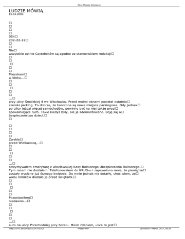 Straż Miejska Włocławek LUDZIE MÓWIĄ 15.04.2009. 054 232-22-22 Nie wszystkie opinie Czytelników są zgodne ze stanowiskiem redakcji Mieszkam w bloku... ... przy ulicy Smólskiej 4 we Włocławku. Przed moimi oknami powstał ostatnio szeroki parking. To dobrze, że tworzone są nowe miejsca parkingowe. Gdy jednak po ulicy jeździ więcej samochodów, powinny być na niej także progi spowalniające ruch. Takie kiedyś były, ale je zdemontowano. Boję się o bezpieczeństwo dzieci. Zwykle przed Wielkanocą... ... otrzymywałem emeryturę z włocławskiej Kasy Rolniczego Ubezpieczenia Rolniczego. Tym razem nie dostałem. Telefonowałem do KRUS-u i zapewniono mnie, że pieniądze zostały wysłane już ósmego kwietnia. Do mnie jednak nie dotarły, choć wiem, że wielu rolników dostało je przed świętami. Pozostawiłem niedawno... ... auto na ulicy Przechodniej przy hotelu. Moim zdaniem, ulica ta jest http://www.strazmiejska.um.wlocl.pl Kreator PDF Utworzono 4 March, 2017, 08:23 Straż Miejska Włocławek niewłaściwie oznakowana. Znaki z literą "P" są tak poustawiane, że nie wiadomo, na jakim odcinku się płaci, a na jakim nie. Temu oznakowaniu powinien przyjrzeć się Miejski Zarząd Dróg. WWielki Piątek wieczorem... ... na ulicy Jagiellońskiej we Włocławku rozrabiała grupa pijanych mężczyzn używając słów, których nie potrafię nawet powtórzyć. Telefonowałam w tej sprawie do Straży Miejskiej. Niestety, przez czterdzieści pięć minut wyzwiska nie ucichły. To, co działo się... ... dwa dni przed Wielkanocą na włocławskich ulicach, to horror. Z Zazamcza na Południe jechałem trzydzieści minut. Około godziny trzynastej Promienna i Wysoka były kompletnie zakorkowane. Wiem też, że podobnie było na Okrzei. Wyobrażam sobie, co będzie się działo na naszych ulicach, gdy latem, w szczycie sezonu turystycznego, rozpocznie się remont "jedynki". Tylko częściowe zamknięcie Kilińskiego spowodowało, że w centrum gorzej się jeździ. Na czas remontu "jedynki" chyba kupię sobie rower. Informacja o autorze| NOT. (GOZ) 15.4.2009 Gazeta Pomorska str. 14 Włocławek, Aleksandrów, Radziejów, Lipno http://www.strazmiejska.um.wlocl.pl Kreator PDF Utworzono 4 March, 2017, 08:23 Straż Miejska Włocławek http://www.strazmiejska.um.wlocl.pl Kreator PDF Utworzono 4 March, 2017, 08:23