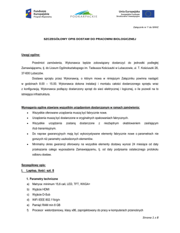 Załącznik nr 7 do SIWZ SZCZEGÓŁOWY OPIS DOSTAW DO PRACOWNI BIOLOGICZNEJ Uwagi ogólne: Przedmiot zamówienia, Wykonawca będzie zobowiązany dostarczyć do jednostki podległej Zamawiającemu, tj. do Liceum Ogólnokształcącego im. Tadeusza Kościuszki w Lubaczowie, ul. T. Kościuszki 26, 37-600 Lubaczów. Dostawa sprzętu przez Wykonawcę, o którym mowa w niniejszym Załączniku powinna nastąpić w godzinach 8.00 – 15.00. Wykonawca dokona instalacji i montażu całości dostarczonego sprzętu wraz z konfiguracją. Wykonawca podłączy dostarczony sprzęt do sieci elektrycznej i logicznej, o ile pozwoli na to istniejąca infrastruktura. Wymagania ogólne stawiane wszystkim urządzeniom dostarczanym w ramach zamówienia: Wszystkie oferowane urządzenia muszą być fabrycznie nowe. Urządzenia muszą być dostarczone w oryginalnych opakowaniach fabrycznych. Wszystkie urządzenia zostaną dostarczone z niezbędnym okablowaniem zasilającym i/lub transmisyjnym. Do napraw gwarancyjnych mają być wykorzystywane elementy fabrycznie nowe o parametrach nie gorszych niż parametry uszkodzonych elementów. Minimalny okres gwarancji oferowany na wszystkie elementy dostawy wynosi 24 miesiące od daty przekazania całego wyposażenia Zamawiającemu, tj. od daty podpisania ostatecznego protokołu odbioru dostaw. Szczegółowy opis: I. Laptop, ilość: szt. 8 1. Parametry techniczne a) Matryca: minimum 15,6 cali, LED, TFT, WXGA+ b) Wyjście HDMI c) Wyjście D-Sub d) WiFi IEEE 802.11b/g/n e) Pamięć RAM min 8 GB f) Procesor wielordzeniowy, klasy x86, zaprojektowany do pracy w komputerach przenośnych Strona 1 z 8 g) Dysk twardy minimum HDD 500 GB lub SSD min 100 GB h) Zgodność oprogramowania z systemami operacyjnymi posiadanymi przez Zamawiającego (Windows 8 i Windows 10). Zaoferowany komputer musi być wyposażony w zainstalowany system operacyjny, spełniający minimalnie poniższe wymagania poprzez wyłącznie wbudowane mechanizmy, bez użycia dodatkowych aplikacji: - Licencja na zaoferowany system operacyjny musi być w pełni zgodna z warunkami licencjonowania producenta oprogramowania. - Interfejsy użytkownika dostępne w języku polskim, - Możliwość dokonywania bezpłatnych aktualizacji i poprawek w ramach wersji systemu operacyjnego poprzez Internet, mechanizmem udostępnianym przez producenta systemu z możliwością wyboru instalowanych poprawek. - Możliwość dokonywania aktualizacji i poprawek systemu poprzez mechanizm zarządzany przez administratora systemu Zamawiającego. - Dostępność bezpłatnych biuletynów bezpieczeństwa związanych z działaniem systemu operacyjnego. - Wbudowane mechanizmy ochrony antywirusowej i przeciw złośliwemu oprogramowaniu z zapewnionymi bezpłatnymi aktualizacjami. - Wsparcie dla większości powszechnie używanych urządzeń peryferyjnych (drukarek, urządzeń sieciowych, standardów USB, Plug&Play, Wi-Fi). - Możliwość zarządzania stacją roboczą poprzez polityki grupowe – przez politykę Zamawiający rozumie zestaw reguł definiujących lub ograniczających funkcjonalność systemu lub aplikacji. - Rozbudowane, definiowalne polityki bezpieczeństwa – polityki dla systemu operacyjnego i dla wskazanych aplikacji. - Możliwość zdalnej automatycznej instalacji, konfiguracji, administrowania oraz aktualizowania systemu, zgodnie z określonymi uprawnieniami poprzez polityki grupowe. - Zabezpieczony hasłem hierarchiczny dostęp do systemu, konta i profile użytkowników zarządzane zdalnie; praca systemu w trybie ochrony kont użytkowników. - Możliwość przystosowania stanowiska dla osób niepełnosprawnych (np. słabo widzących). - Mechanizmy logowania w oparciu o: Login i hasło. - Wbudowane narzędzia służące do administracji, do wykonywania kopii zapasowych polityk i ich odtwarzania oraz generowania raportów z ustawień polityk. - Zdalna pomoc i współdzielenie aplikacji – możliwość zdalnego przejęcia sesji zalogowanego użytkownika celem rozwiązania problemu z komputerem. Strona 2 z 8 - Rozwiązanie służące do automatycznego zbudowania obrazu systemu wraz z aplikacjami. Obraz systemu służyć ma do automatycznego upowszechnienia systemu operacyjnego inicjowanego i wykonywanego w całości poprzez sieć komputerową. - Transakcyjny system plików pozwalający na stosowanie przydziałów (ang. quota) na dysku dla użytkowników oraz zapewniający większą niezawodność i pozwalający tworzyć kopie zapasowe. - Zarządzanie kontami użytkowników sieci oraz urządzeniami sieciowymi tj. drukarki, modemy, woluminy dyskowe, usługi katalogowe. - Oprogramowanie dla tworzenia kopii zapasowych (Backup); automatyczne wykonywanie kopii plików z możliwością automatycznego przywrócenia wersji wcześniejszej. - Możliwość przywracania obrazu plików systemowych do uprzednio zapisanej postaci. - Identyfikacja sieci komputerowych, do których jest podłączony system operacyjny, zapamiętywanie ustawień i przypisywanie do min. 3 kategorii bezpieczeństwa (z predefiniowanymi odpowiednio do kategorii ustawieniami zapory sieciowej, udostępniania plików itp.). - Możliwość blokowania lub dopuszczania dowolnych urządzeń peryferyjnych za pomocą polityk grupowych (np. przy użyciu numerów identyfikacyjnych sprzętu). Zaoferowany komputer musi być wyposażony w zainstalowany pakiet biurowy w polskiej wersji językowej, zawierający minimum edytor tekstów, arkusz kalkulacyjny, narzędzie do przygotowywania i prowadzenia prezentacji, z licencją nieograniczoną czasowo, wraz z dołączonym nośnikiem z oprogramowaniem zgodnym z postanowieniami licencji producenta oprogramowania, spełniający minimalnie poniższe wymagania: - umożliwiać prawidłowe odczytywanie, zapisywanie danych w istniejących dokumentach Zamawiającego w formatach .doc,. .docx, .xls, .xlsx bez utraty parametrów i cech użytkowych, z zachowaniem wszelkiego formatowania, umiejscowienia tekstów, .liczb, obrazków, wykresów, odstępów mi