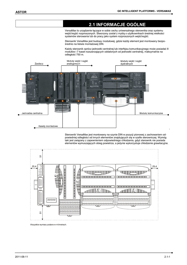 ASTOR GE INTELLIGENT PLATFORMS - VERSAMAX 2.1 INFORMACJE OGÓLNE VersaMax to urządzenie łączące w sobie cechy uniwersalnego sterownika oraz systemu wejść/wyjść rozproszonych. Stworzony został z myślą o uŜytkownikach średniej wielkości systemów sterowania lub do pracy jako system rozproszonych wejść/wyjść. Sterownik VersaMax jest budowy modułowej, gdzie kaŜdy element jest montowany bezpośrednio na listwie montaŜowej DIN. KaŜdy sterownik oprócz jednostki centralnej lub interfejsu komunikacyjnego moŜe posiadać 8 modułów i 7 kaset rozszerzających oddalonych od jednostki centralnej, maksymalnie na odległość 750 m. Sterownik VersaMax jest montowany na szynie DIN w pozycji pionowej z zachowaniem odpowiedniej odległości od innych elementów znajdujących się w szafie sterowniczej. Wymóg taki jest związany z zapewnieniem odpowiedniego chłodzenia, gdyŜ sterownik nie posiada elementów wymuszających obieg powietrza, a jedynie wykorzystuje chłodzenie grawitacyjne. 2011-08-11 2.1-1 GE INTELLIGENT PLATFORMS - VERSAMAX ASTOR JeŜeli sterownik będzie naraŜony na wibracje, naleŜy dodatkowo przymocować podstawki pod moduły do płyty montaŜowej. W celu zapewnienia poprawnego działania sterownika VersaMax naleŜy pamiętać o odpowiednim uziemieniu wszystkich jego elementów. Przewody uziemiające powinny być połączone w gwiazdę do jednego wspólnego punktu uziemiającego. Dotyczy to równieŜ innych elementów podłączanych do sterownika, takich jak na przykład panel operatorski. Dla prawidłowego zabezpieczenia sterownika przed występującymi w sieci przepięciami naleŜy zastosować dodatkowe zabezpieczenie kabli sygnałowych, komunikacyjnych i zasilania. MoŜliwe jest równieŜ zastosowanie jednego zabezpieczenia obwodu zasilającego dla grupy urządzeń zamontowanych w szafie sterowniczej, poprzez podłączenie warystorów na wejściu zasilania. Przy projektowaniu zabezpieczenia przeciw przepięciowego naleŜy pamiętać o zastosowaniu zabezpieczeń równieŜ w przypadku kabli komunikacyjnych i sygnałowych. 2.1-2 Przy uŜytkowaniu zabezpieczeń przeciw przepięciowych naleŜy pamiętać o ich regularnej kontroli. W wypadku wystąpienia przepięcia, którego energia przekracza dopuszczalną wielkość dla danego typu zabezpieczenia moŜe nastąpić niezauwaŜalne jego zniszczenie. 2011-08-11 GE INTELLIGENT PLATFORMS - VERSAMAX ASTOR Sterowniki VersaMax powinny być instalowane i uŜywane zgodnie z wytycznymi zawartymi w dołączonych do nich podręcznikach, oraz zgodnie z następującymi zaleceniami: Czynniki środowiskowe Wibracje IEC68-2-6 Wstrząsy IEC68-2-27 1 G @ 57 ÷ 150 Hz, 0,012 in p--p @ 10 ÷ 57 Hz 15 G, 11 ms Temperatura otoczenia: 0 ÷ 60 °C Temperatura otoczenia dla podstawek modułów wejść/wyjść, interfejsów połączeniowych i dodatkowych listew zaciskowych: -40 ÷ +60 °C Zakres temperatur pracy Temperatura przechowywania 40 ÷ 85 °C Wilgotność 5 ÷ 95%, bez skraplania Klasa bezpieczeństwa obudowy IEC529 Szafka stalowa na IP54: zabezpieczenie przed pyłem i wodą CISPR 11/EN 55011 Urządzenia przemysłowe, naukowe i medyczne (Grupa 1, Klasa A) CISPR 22/EN 55022 Urządzenia technologii informatycznych (Klasa A) FCC 47 CFR 15 Według FCC cześć 15, urządzenia radiowe (Klasa A) Zakłócenia elektromagnetyczne Promieniowanie, przewodzenie Odporność na zakłócenia elektromagnetyczne Wyładowania elektrostatyczne EN 61000-4-2 Powietrzne 8 kV, kontaktowe 4 kV EN 61000-4-3 10 Vrms/m, 80 ÷ 1000 MHz, 80% AM Podatność na zakłócenia spowodowane przez częstotliwości radiowe ENV 50140/ENV 50204 10 Vrms/m, 900 MHz ±5 MHz 100% AM przy fali prostokątnej 200 Hz Przepalenie przy szybkich stanach przejściowych EN 61000-4-4 2 kV: zasilacze, 1 kV: moduły wejść/wyjść, moduły komunikacyjne ANSI/IEEE C37.90a Tłumiona fala oscylacyjna: 2,5 kV: zasilacze, moduły wejść/wyjść [12 ÷ 240 V] IEC255-4 Tłumiona fala oscylacyjna: Klasa II, zasilacze, moduły wejść/wyjść [12 ÷ 240 V] EN 61000-4-5 2 kV cm(P/S); 1 kV cm (moduły wejść/wyjść i komunikacyjne) EN 61000-4-6 10 Vrms, 0,15 ÷ 80 MHz, 80% AM UL508, UL840, IEC664 1,5 kV dla modułów na napięcie znamionowe 51 ÷ 250 V EN 61000-4-11 W czasie pracy: Inklinacja do 30 i 100%, odchylenie dla prądu zmiennego ±10%, odchylenie dla prądu stałego ±20% Odporność na udary Przewodzone fale o częstotliwości radiowej Izolacja Wytrzymałość dielektryczna Zasilanie Zaniki napięcia 2011-08-11 2.1-3 GE INTELLIGENT PLATFORMS - VERSAMAX ASTOR Instalowanie jednostek centralnych, interfejsów komunikacyjnych, podstawek oraz modułów rozszerzających na szynie DIN Jednostki centralne, interfejsy komunikacyjne, moduły rozszerzające oraz podstawki montaŜowe łatwo zatrzaskują się na szynie DIN. Do montaŜu i do uziemiania do szyny DIN nie są wymagane Ŝadne narzędzia. Łączenie jednostek centralnych, interfejsów komunikacyjnych, podstawek oraz modułów rozszerzających Elementy te naleŜy przesunąć wzdłuŜ szyny DIN, aby złącza sąsiednich podstawek spięły się. W celu zabezpieczenia styków złącza przed uszkodzeniem nie naleŜy wciskać ani zatrzaskiwać podstawek razem. Instalowanie modułów wejść/wyjść Do ustawienia prawidłowego typu modułu na podstawce słuŜą pokrętła kluczujące. Jedno z nich umoŜliwia ustalenie znaków, drugie numerów. Ustawienie pokręteł musi odpowiadać ustawieniom fabrycznym zaznaczonym na dolnej części modułu. Głębokość sterownika lub układu wejść wyjść rozproszonych serii VersaMax wynosi 70mm. 2.1-4 2011-08-11 GE INTELLIGENT PLATFORMS - VERSAMAX ASTOR Ustawienie pokręteł kluczujących modułów wejść/wyjść Numer katalogowy Kod Numer katalogowy Kod Numer katalogowy Kod IC200ALG230 D2 IC200MDD840 C3 IC200MDL329 B6 IC200ALG240 C7 IC200MDD841 C4 IC200MDL330 B6 IC200ALG260 D2 IC200MDD842 C6 IC200MDL331 B7 IC200ALG261 G3 IC200MDD843 C3 IC200MDL631 F6 IC200ALG262 G2 IC200MDD844 C6 IC200MDL632 F6 IC200A