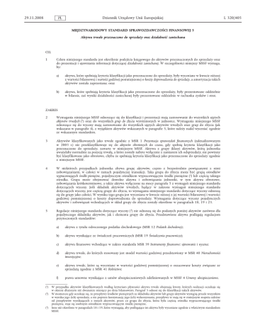 29.11.2008 PL Dziennik Urzędowy Unii Europejskiej MIĘDZYNARODOWY STANDARD SPRAWOZDAWCZOŚCI FINANSOWEJ 5 Aktywa trwałe przeznaczone do sprzedaży oraz działalność zaniechana CEL 1 Celem niniejszego standardu jest określenie podejścia księgowego do aktywów przeznaczonych do sprzedaży oraz do prezentacji i ujawniania informacji dotyczącej działalności zaniechanej. W szczególności niniejszy MSSF wymaga, by: a) aktywa, które spełniają kryteria klasyfikacji jako przeznaczone do sprzedaży, były wyceniane w kwocie niższej z wartości bilansowej i wartości godziwej pomniejszonej o koszty doprowadzenia do sprzedaży, a amortyzacja takich aktywów została zaprzestana; oraz b) aktywa, które spełniają kryteria klasyfikacji jako przeznaczone do sprzedaży, były prezentowane oddzielnie w bilansie, zaś wyniki działalności zaniechanej były prezentowane oddzielnie w rachunku zysków i strat. ZAKRES 2 Wymagania niniejszego MSSF odnoszące się do klasyfikacji i prezentacji mają zastosowanie do wszystkich ujętych aktywów trwałych (1) oraz do wszystkich grup do zbycia wyróżnionych w jednostce. Wymagania niniejszego MSSF odnoszące się do wyceny mają zastosowanie do wszystkich ujętych aktywów trwałych oraz grup do zbycia (jak wskazano w paragrafie 4), z wyjątkiem aktywów wskazanych w paragrafie 5, które należy nadal wyceniać zgodnie ze wskazanym standardem. 3 Aktywów klasyfikowanych jako trwałe zgodnie z MSR 1 Prezentacja sprawozdań finansowych (zaktualizowanym w 2003 r.) nie przeklasyfikowuje się do aktywów obrotowych do czasu, gdy spełnią kryteria klasyfikacji jako przeznaczone do sprzedaży, zawarte w niniejszym MSSF. Aktywa z grupy (klasy) aktywów, którą jednostka uważałaby normalnie za pozycję trwałą, a które zostały nabyte wyłącznie z zamiarem ich odsprzedaży, nie powinny być klasyfikowane jako obrotowe, chyba że spełniają kryteria klasyfikacji jako przeznaczone do sprzedaży zgodnie z niniejszym MSSF. 4 W niektórych przypadkach jednostka zbywa grupę aktywów, często z bezpośrednio powiązanymi z nimi zobowiązaniami, w całości w ramach pojedynczej transakcji. Taka grupa do zbycia może być grupą ośrodków wypracowujących środki pieniężne, pojedynczym ośrodkiem wypracowującym środki pieniężne (2) lub częścią takiego ośrodka. Grupa może obejmować dowolne aktywa i zobowiązania jednostki, w tym aktywa obrotowe, zobowiązania krótkoterminowe, a także aktywa wyłączone na mocy paragrafu 5 z wymagań niniejszego standardu dotyczących wyceny. Jeśli składnik aktywów trwałych, będący w zakresie wymagań niniejszego standardu dotyczących wyceny, jest częścią grupy do zbycia, to wymagania niniejszego standardu dotyczące wyceny odnoszą się do grupy jako całości. W wyniku tego grupa jest wyceniana w kwocie niższej z jej wartości bilansowej i wartości godziwej pomniejszonej o koszty doprowadzenia do sprzedaży. Wymagania dotyczące wyceny pojedynczych aktywów i zobowiązań wchodzących w skład grupy do zbycia zostały określone w paragrafach 18, 19 i 23. 5 Regulacje niniejszego standardu dotyczące wyceny (3) nie odnoszą się do podanych poniżej aktywów zarówno dla pojedynczego składnika aktywów, jak i elementu grupy do zbycia. Przedstawione aktywa podlegają regulacjom przytoczonych standardów: (1) (2) (3) a) aktywa z tytułu odroczonego podatku dochodowego (MSR 12 Podatek dochodowy); b) aktywa wynikające ze świadczeń pracowniczych (MSR 19 Świadczenia pracownicze); c) aktywa finansowe wchodzące w zakres standardu MSR 39 Instrumenty finansowe: ujmowanie i wycena; d) aktywa trwałe, do których stosowany jest model wartości godziwej przedstawiony w MSR 40 Nieruchomości inwestycyjne; e) aktywa trwałe, które są wyceniane w wartości godziwej pomniejszonej o oszacowane koszty związane ze sprzedażą zgodnie z MSR 41 Rolnictwo; f) prawa umowne wynikające z umów ubezpieczeniowych zdefiniowanych w MSSF 4 Umowy ubezpieczeniowe. W przypadku aktywów klasyfikowanych według kryterium płynności aktywa trwałe obejmują kwoty, których realizacji oczekuje się w okresie dłuższym niż dwanaście miesięcy po dniu bilansowym. Paragraf 3 odnosi się do klasyfikacji takich aktywów. W momencie gdy oczekuje się, że przepływy środków pieniężnych ze składnika aktywów lub grupy aktywów wystąpią przede wszystkim w wyniku jego (ich) sprzedaży, a nie poprzez kontynuację jego (ich) wykorzystania, przepływy te stają się w mniejszym stopniu zależne od przepływów wynikających z innych aktywów, przez co grupa do zbycia, która była częścią ośrodka wypracowującego środki pieniężne, staje się osobnym ośrodkiem wypracowującym środki pieniężne. Inne niż określone w paragrafach 18 i 19, które wymagają, aby podlegające im aktywa były wyceniane zgodnie z właściwym standardem MSSF. L 320/405 L 320/406 PL Dziennik Urzędowy Unii Europejskiej KLASYFIKACJA AKTYWÓW TRWAŁYCH (LUB GRUP DO ZBYCIA) PRZEZNACZONYCH DO SPRZEDAŻY 6 Jednostka klasyfikuje składnik aktywów trwałych (lub grupę do zbycia) jako przeznaczony do sprzedaży, jeśli jego wartość bilansowa zostanie odzyskana przede wszystkim w drodze transakcji sprzedaży, a nie poprzez jego dalsze wykorzystanie. 7 Sytuacja taka ma miejsce, gdy składnik aktywów (lub grupa do zbycia) jest dostępny do natychmiastowej sprzedaży w jego bieżącym stanie, z uwzględnieniem jedynie normalnych i zwyczajowo przyjętych warunków dla sprzedaży tego typu aktywów (lub grup do zbycia) oraz jego sprzedaż jest wysoce prawdopodobna. 8 Sprzedaż jest wysoce prawdopodobna, gdy przedstawiciele odpowiedniego poziomu kierownictwa są zdecydowani do wypełnienia planu sprzedaży składnika aktywów (lub grupy do zbycia) oraz aktywny program znalezienia nabywcy i zakończenia planu został rozpoczęty. Ponadto składnik aktywów (lub grupa do zbycia) musi być aktywnie oferowany na sprzedaż po cenie, która jest racjonalna 