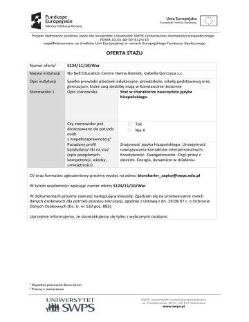 Projekt Wdrożenie systemu staży dla studentów i studentek SWPS Uniwersytetu Humanistycznospołecznego POWR.03.01.00-00-S124/15 współfinansowany ze środków Unii Europejskiej w ramach Europejskiego Funduszu Społecznego OFERTA STAŻU Numer oferty1 S124/11/10/War Nazwa instytucji No Bell Education Centre Hanna Bieniek, Izabella Gorczyca s.c. Opis instytucji Spółka prowadzi placówki edukacyjne: przedszkole, szkołę podstawową oraz gimnazjum, które swą siedzibę mają w Konstancinie-Jeziornie Opis stanowiska Staż w charakterze nauczyciela języka hiszpańskiego. Stanowisko 1 Czy stanowisko jest dostosowane do potrzeb osób z niepełnosprawnością2 Pożądany profil kandydata/-tki na staż (opis pożądanych kompetencji, wiedzy, umiejętności) Tak Nie X Znajomość języka hiszpańskiego. Umiejętność nawiązywania kontaktów interpersonalnych. Kreatywność. Zaangażowanie. Chęć pracy z dziećmi. Energia, dynamizm w działaniu. CV oraz formularz zgłoszeniowy prosimy wysłać na adres: [email protected] W tytule wiadomości wpisując numer oferty S124/11/10/War W dokumentach prosimy zawrzeć następującą klauzulę: Zgadzam się na przetwarzanie moich danych osobowych dla potrzeb procesu rekrutacji, zgodnie z Ustawą z dn. 29.08.97 r. o Ochronie Danych Osobowych (Dz. U. nr 133 poz. 883). Uprzejmie informujemy, że skontaktujemy się tylko z wybranymi osobami. 1 2 Wypełnia pracownik Biura Karier Proszę o zaznaczenie SWPS Uniwersytet Humanistycznospołeczny ul. Chodakowska 19/31, 03-815 Warszawa www.swps.pl Projekt Wdrożenie systemu staży dla studentów i studentek SWPS Uniwersytetu Humanistycznospołecznego POWR.03.01.00-00-S124/15 współfinansowany ze środków Unii Europejskiej w ramach Europejskiego Funduszu Społecznego PROGRAM STAŻU Liczba godzin stażu w miesiącu: 120 Szczegółowy program stażu (w tym rozwijane kompetencje, zadania stażowe) 1. Zapoznanie się ze specyfiką pracy szkoły. 2. Poznanie szkoły, jej zadań i zasad funkcjonowania, a więc m.in. sposobu prowadzenia obowiązującej dokumentacji oraz przepisów bhp. 3. Zapoznanie się z metodami i formami pracy w No Bell Szkole Podstawowej Montessori. 4. Uczestniczenie w charakterze obserwatora w zajęciach prowadzonych przez opiekuna stażu lub innych nauczycieli i omawianie obserwowanych zajęć z osobą je prowadzącą. 5. Pomoc w prowadzeniu lekcji. 6. Prowadzenie zajęć z uczniami w obecności opiekuna stażu. 7. Przygotowywanie zajęć. 8. Poprawianie prac uczniów. Poprzez realizację powyższych zadań stażysta zdobędzie kompetencje w zakresie: - planowania i organizowania pracy, konstruowania zajęć; - precyzowania celów, jakie nauczyciel stawia dzieciom; - organizowania i realizowania zajęć zgodnie z założeniami; - stosowania form i metod zachęcających uczniów do aktywnego uczenia się; - wykorzystania odpowiednich pomocy dydaktycznych, w tym nowoczesnych środków audiowizualnych; - budowania relacji nauczycie-uczeń-rodzic; - rozwiązywania problemów, - stosowania właściwych kryteriów i form oceniania. SWPS Uniwersytet Humanistycznospołeczny ul. Chodakowska 19/31, 03-815 Warszawa www.swps.pl