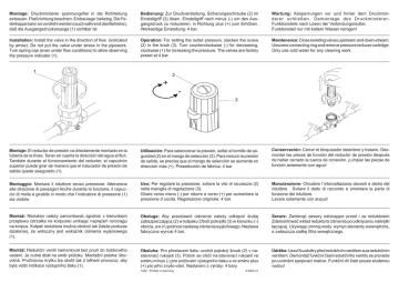 Montage: Druckminderer spannungsfrei in die Rohrleitung einbauen. Fließrichtung beachten. Einbaulage: beliebig. Die Federkappe kann so verdreht werden (auch während des Betriebs), daß die Ausgangsdruckanzeige (1) sichtbar ist. Bedienung: Zur Druckverstellung, Sicherungsschraube (2) im Einstellgriff (3) lösen. Einstellgriff nach minus (-) um den Ausgangsdruck zu reduzieren, in Richtung plus (+) zum Erhöhen. Werkseitige Einstellung: 4 bar. Wartung: Absperrungen vor und hinter dem Druckminderer schließen. Demontage des DruckmindererFunktionsteils nach Lösen der Verbindungsmutter. Funktionsteil nur mit kaltem Wasser reinigen! Installation: Install the valve in the direction of flow (indicated by arrow). Do not put the valve under stress in the pipework. Turn spring cap (even under flow conditions) to allow observing the pressure indicator (1). Operation: For setting the outlet pressure, slacken the screw (2) in the knob (3). Turn counterclockwise (-) for decreasing, clockwise (+) for increasing the pressure. The valves are factory preset at 4 bar. Maintenance: Close isolating valves upstream and down-stream. Unscrew connecting ring and remove pressure reducer cartridge. Only use cold water for any cleaning work. 1 2 3 Montaje: El reductor de presión va directamente montado en la tubería de la línea. Tener en cuenta la dirección del agua al fluír. También durante el funcionamiento del reductor, el capuchón superior puede girar de manera que el inducador de presión de salida quede asegurado (1). Utilización: Para seleccionar la presión, soltar el tornillo de seguridad (2) en el mango de selección (3). Para reducir la presión de salida, se precisa que el mango de selección se aumente en dirección más (+). Preselección de fábrica: 4 bar Conservación: Cerrar el bloqueador delantero y trasero. Desmontar las piezas de función del reductor de presión después de haber cerrado la tuerca de conexión. ¡Limpiar las piezas de función aolamente con agua! Montaggio: Montare il riduttore zenzo pressione. Attenzione alla direzione di passagio! Anche durante la funzione, il capuccio di molla é girabile in modo che l´indicatore di pressione (1) sia visibile. Uso: Per regolare la pressione, svitare la vite di sicurezza (2) nella maniglia di regolazione (3). Girare verso meno (-) per ridurre e verso (+) per aumentare la pressione d´uscita. Regolazione originale: 4 bar. Manutenzione: Chiudere l´intercettazione davanti e dietro del riduttore . Svitare il dado di raccordo e smontare la parte di funzione del riduttore. Lavare solamente con acqua! Montaż: Reduktor należy zamontować zgodnie z kierunkiem przepływu (strzałka na korpusie) unikając naprężeń rurociągu na korpus. Kołpak reduktora można obrócić tak (także podczas działania), że widoczny jest wskaźnik ciśnienia wyjściowego (1). Obsługa: Aby przestawić ciśnienie należy odkręcić śrubę zabezpieczającą (2) w kołpaku.Obrót pokrętła (3) w kierunku (-) obniża, a w (+) podnosi nastawę ciśnienia wyjściowego. Nastawa fabryczna wynosi 4 bar. Serwis: Zamknąć zawory odcinające przed i za reduktorem Zdemontować wkład reduktora ciśnienia po odkręceniu nakrętki łączącej. Używając zimnej wody wymyć elementy wewnętrzne, a zwłaszcza siatkę filtra wewętrznego. Montáž: Redukční ventil namontovat bez pnutí do trubkového vedení. Je nutné dbát na směr průtoku. Montážní poloha: libovolná. Pružinovou krytku lze otočit tak (i během provozu), aby byla vidět indikace výstupního tlaku (1). Obsluha: Pro přestavení tlaku uvolnit pojistný šroub (2) v nastavovací rukojeti (3). Potom se otočí na-stavovací rukojetí ve směru mínus (-) pro snižování výstupního tlaku a ve směru plus (+) pro jeho zvyšo-vání. Nastavení z výroby: 4 bary. Údržba: Uzavřít uzávěry před redukčním ventilem a za redukčním ventilem. Demontáž funkční části redukčního ventilu se provede po uvolnění spojovací matice. Funkční díl čistit pouze studenou vodou! 1229 - Printed in Germany 9.0002.21 Betriebstemp.: max. 30°C (Sonderausführung 80°C); Eingangsdruck: max. 25 bar; Ausgangsdruck: 1,5-6 bar; Medien: Wasser (nach DIN EN 1567), Pressluft, neutrale nichtklebende Flüssigkeiten und Gase. Die Installation und Wartung darf nur durch einen autorisierten Fachbetrieb vorgenommen werden. Die Verpackung ist Transportschutz. Bei starker Beschädigung der Verpackung, Armatur nicht einbauen. ARMATUREN Made in Germany Operating Temp.: max. 30°C (Special design 80°C); Inlet Pressure: max. 25 bar; Outlet Pressure: 1,5-6 bar; Media: Water, compressed air, neutral non-adhesive liquids and gases. Australian Standard: AS 1357.2, LIC 2532 (315) Installation and maintenance should only be undertaken by competent personnel. The packing is provided to protect the valve during transport. Please do not install the valve if damage is evident. Gebrauchsanleitung Instructions for use Instrucciones de uso Istruzioni per l´uso Instrukcja obsługi Návod k použití DN15+20: 0315.20.904 DN25: 0315.25.904 DN 32-50: 0315.32.902 MPA DN15-DN25: P-IX 7635/I DN32: P-IX 7729/I 0828.08.000 0828.08.000 Temperatura máxima de trabajo: 30°C (ejecutión especial 80°C); Presión máxima de entrada: 25 bar; Presión de salida: 1,5-6 bar; Medios: Agua, Aire a presión, Liquidos neutrales no pegadizos y Gases. La instalación y el mantenimiento pueden ser sólo realizadas por un distribuidor autorizado. En caso de deterioro considerable en el embalaje, el reductor de presión no debe de montarse. Temperatura d´esercizio: mass. 30°C (edizione straordinaria 80°C); Pressione d´entrata: mass. 25 bar; Pressione d´uscita: 1,5-6 bar; Mezzi: Acqua, aria compressa, liquidi neutri non adesivi e gas. L´installazione e la manutenzione é da eseguire unicamen-te da una ditta specializzata ed autorizzata. In caso d´imballo considerevolmente danneggiato, l´articolo non é da montare. Temperatura pracy: maks.30oC (w
