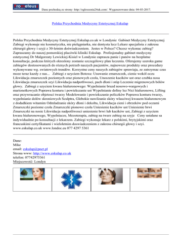 Dane pochodzą ze strony: http://ogloszenia24uk.com/. Wygenerowano dnia: 04-03-2017. Polska Przychodnia Medycyny Estetycznej Eskulap Polska Przychodnia Medycyny Estetycznej Eskulap.co.uk w Londynie Gabinet Medycyny Estetycznej Zabiegi wykonuje nie kosmetyczka, nie pielęgniarka, nie dentysta lecz Lekarz specjalista z zakresu chirurgii głowy i szyji z 30-letnim doświadczeniem. Jestes w Polsce? Chcesz wykonac zabieg? Zapraszamy do naszej pomorskiej placówki kliniki Eskulap. Profesjonalny gabinet medycyny estetycznej Dr Malgorzaty Lewickiej-Kisiel w Londynie zaprasza panie i panów na bezplatne konsultacje, podczas których okreslony zostanie szczególowy plan leczenia. Oferujemy szeroka game zabiegów dostosowanych do róznych potrzeb naszych pacjentów, najnowsze produkty oraz procedury wykonywane wg. swiatowych trendów. Korzystne ceny naszych zabiegów sprawiaja, ze zatrzymac czas moze teraz kazdy z nas... Zabiegi z uzyciem Botoxu: Usuwanie zmarszczek, cienie wokól oczu Likwidacja zmarszczek poziomych oraz pionowych czola, Unoszenie kacików ust oraz czubka nosa Likwidacja zmarszczek szyi Likwidacja nadpotliwosci, pach dloni i stóp Leczenie migrenowych bólów glowy. Zabiegi z uzyciem kwasu hialuronowego: Wypelnianie bruzd nosowo-wargowych i marionetkowych Poprawa konturu i powiekszanie ust Wypelnianie doliny lez Nici hialuronowe, Lifting oraz przywracanie objetosci twarzy Modelowanie i powiekszanie policzków Poprawa konturu twarzy, wypelnianie dolów skroniowych Sculptra, Glebokie nawilzanie skóry wlasciwej kwasem hialuronowym z dodadkiem witamim Odmladzanie skóry dloni i dekoltu, Likwidacja cieni i obrzeków pod oczami Zmarszczki poziome czola Zmarszczki pionowe czola Uniesienie kacików ust Uniesienie brwi Zmarszczki na nosie Likwidacja nadpotliwosci uniesienie brwi lub kacików ust, Zabiegi z uzyciem kwasu hialuronowego, Wypelniacze, Mezoterapia, zabieg na twarz zabieg na szyje Ceny ustalane sa indywidualnie po konsultacji z lekarzem. Zabiegi wykonuje lekarz z polskimi, brytyjskimi oraz francuskimi certyfikatami i wieloletnim doswiadczeniem z zakresu chirurgii głowy i szyi. www.eskulap.co.uk www.londoc.eu 077 4297 5361 Dane: Mike email: [email protected] Strona www: http://www.eskulap.co.uk telefon: 07742975361 Miejscowość: Londyn