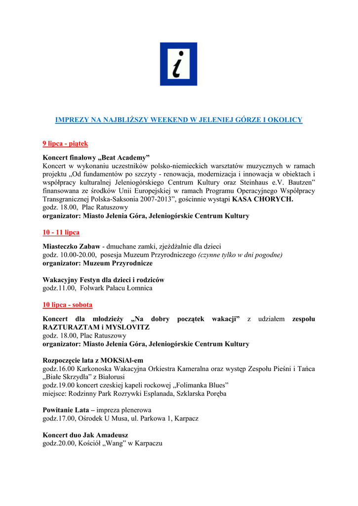 IMPREZY NA NAJBLIŻSZY WEEKEND W JELENIEJ GÓRZE I OKOLICY 9 lipca - piątek Koncert finałowy „Beat Academy” Koncert w wykonaniu uczestników polsko-niemieckich warsztatów muzycznych w ramach projektu „Od fundamentów po szczyty - renowacja, modernizacja i innowacja w obiektach i współpracy kulturalnej Jeleniogórskiego Centrum Kultury oraz Steinhaus e.V. Bautzen” finansowana ze środków Unii Europejskiej w ramach Programu Operacyjnego Współpracy Transgranicznej Polska-Saksonia 2007-2013”, gościnnie wystąpi KASA CHORYCH. godz. 18.00, Plac Ratuszowy organizator: Miasto Jelenia Góra, Jeleniogórskie Centrum Kultury 10 - 11 lipca Miasteczko Zabaw - dmuchane zamki, zjeżdżalnie dla dzieci godz. 10.00-20.00, posesja Muzeum Przyrodniczego (czynne tylko w dni pogodne) organizator: Muzeum Przyrodnicze Wakacyjny Festyn dla dzieci i rodziców godz.11.00, Folwark Pałacu Łomnica 10 lipca - sobota Koncert dla młodzieży „Na dobry początek wakacji” z RAZTURAZTAM i MYSLOVITZ godz. 18.00, Plac Ratuszowy organizator: Miasto Jelenia Góra, Jeleniogórskie Centrum Kultury udziałem zespołu Rozpoczęcie lata z MOKSiAl-em godz.16.00 Karkonoska Wakacyjna Orkiestra Kameralna oraz występ Zespołu Pieśni i Tańca „Białe Skrzydła” z Białorusi godz.19.00 koncert czeskiej kapeli rockowej „Folimanka Blues” miejsce: Rodzinny Park Rozrywki Esplanada, Szklarska Poręba Powitanie Lata – impreza plenerowa godz.17.00, Ośrodek U Musa, ul. Parkowa 1, Karpacz Koncert duo Jak Amadeusz godz.20.00, Kościół „Wang” w Karpaczu 11 lipca - niedziela „Od Waregów do Greków” impreza plenerowa godz. 10.00-20.00, posesja Muzeum Przyrodniczego Całodniowa inscenizacja historyczna „Czy widziałeś Wikingów? Oni już tu są” z udziałem grup w strojach historycznych (Wikingowie i Słowianie). W programie: warsztat tworzenia kolczugi, warsztat garncarski, tkacki, turnieje bojowe dla dzieci i dorosłych, pokaz walk, wykład o życiu Słowian i Wikingów, gry i zabawy plebejskie i wiele innych atrakcji organizator: Miasto Jelenia Góra, Muzeum Przyrodnicze Koncert Promenadowy w wykonaniu zespołu ZORBA „Od Waregów do Greków” godz. 16.00, Park Norweski - taras Muzeum Przyrodniczego (w razie deszczu koncert odbędzie się w Kościele Ewangelicko–Augsburskim) organizator: Miasto Jelenia Góra, Przystań Twórcza - Cieplickie Centrum Kultury, Muzeum Przyrodnicze Koncert w klimatach jazzujących – Duet Seba &Pit godz.18.00, Hotel Restauracja „Caspar”, Jelenia Góra-Cieplice więcej na www.caspar.pl i tel. 75 64 55 001 Cieplickie Koncerty Organowe, koncert w wykonaniu Tomasza Głuchowskiego; w programie: J. P. Sweelinck (1562 - 1621) - Fantazja g 2, Psalm 23 (3 v.), “Mein junges Leben hat ein End”, J. S. Bach (1685 - 1750) - Piece d’Orgue G - dur BWV 572, “Liebster Jesu wir sind hier” BWV 730, BWV 731, Th. Kullak (1818 - 1882) - Pastorale z op.57, M. Reger (1873 - 1916), Melodia z op. 59, F. Peeters (1903 - 1986), Partita “Veni Creator Spiritus” z op. 75 godz. 19.15 Kościół Ewangelicko-Augsburski, Plac Piastowski 18 (bilety w cenie 10 zł, ulgowy, dzieci, młodzież, studenci - 7 zł) organizator: Parafia Ewangelicko-Augsburska, Mecenat Miasta Jelenia Góra W niedzielę na wycieczkę Trasa wycieczki długości 18 km prowadzi brzegiem Jeziora Złotnickiego godz.7.50 wyjazd z dworca PKS Jelenia Góra do Olszyny organizator: ZO PTTK „Sudety Zachodnie” Magiczny Karpacz – bezpłatny spacer z przewodnikiem dookoła Karpacza godz.10.00, miejsce: Skwer Zdobywców, Karpacz informacje zebrało CENTRUM INFORMACJI TURYSTYCZNEJ I KULTURALNEJ 58-500 JELENIA GÓRA UL.BANKOWA 27, TEL. O75/76 76 925 TEL/FAX O75/76 76 935 ,[email protected], www.jeleniagora.pl