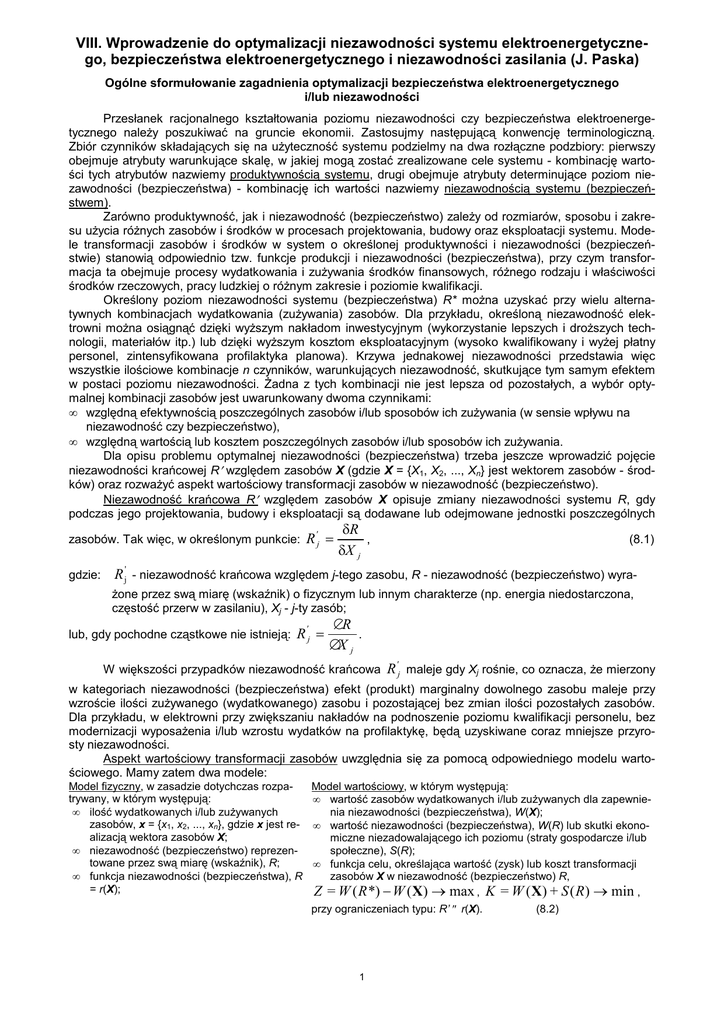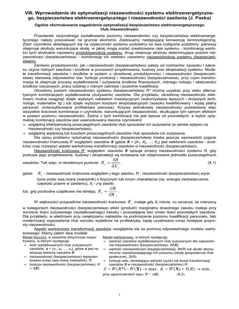 VIII. Wprowadzenie do optymalizacji niezawodności systemu elektroenergetycznego, bezpieczeństwa elektroenergetycznego i niezawodności zasilania (J. Paska)