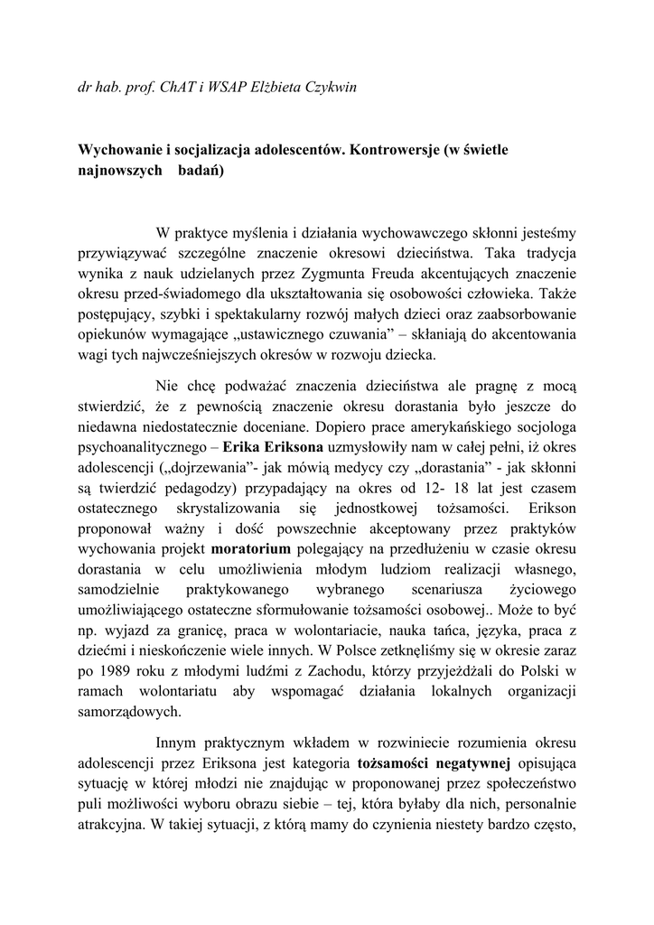 dr hab. prof. ChAT i WSAP Elżbieta Czykwin Wychowanie i socjalizacja adolescentów. Kontrowersje (w świetle najnowszych badań) W praktyce myślenia i działania wychowawczego skłonni jesteśmy przywiązywać szczególne znaczenie okresowi dzieciństwa. Taka tradycja wynika z nauk udzielanych przez Zygmunta Freuda akcentujących znaczenie okresu przed-świadomego dla ukształtowania się osobowości człowieka. Także postępujący, szybki i spektakularny rozwój małych dzieci oraz zaabsorbowanie opiekunów wymagające „ustawicznego czuwania” – skłaniają do akcentowania wagi tych najwcześniejszych okresów w rozwoju dziecka. Nie chcę podważać znaczenia dzieciństwa ale pragnę z mocą stwierdzić, że z pewnością znaczenie okresu dorastania było jeszcze do niedawna niedostatecznie doceniane. Dopiero prace amerykańskiego socjologa psychoanalitycznego – Erika Eriksona uzmysłowiły nam w całej pełni, iż okres adolescencji („dojrzewania”- jak mówią medycy czy „dorastania” - jak skłonni są twierdzić pedagodzy) przypadający na okres od 12- 18 lat jest czasem ostatecznego skrystalizowania się jednostkowej tożsamości. Erikson proponował ważny i dość powszechnie akceptowany przez praktyków wychowania projekt moratorium polegający na przedłużeniu w czasie okresu dorastania w celu umożliwienia młodym ludziom realizacji własnego, samodzielnie praktykowanego wybranego scenariusza życiowego umożliwiającego ostateczne sformułowanie tożsamości osobowej.. Może to być np. wyjazd za granicę, praca w wolontariacie, nauka tańca, języka, praca z dziećmi i nieskończenie wiele innych. W Polsce zetknęliśmy się w okresie zaraz po 1989 roku z młodymi ludźmi z Zachodu, którzy przyjeżdżali do Polski w ramach wolontariatu aby wspomagać działania lokalnych organizacji samorządowych. Innym praktycznym wkładem w rozwiniecie rozumienia okresu adolescencji przez Eriksona jest kategoria tożsamości negatywnej opisująca sytuację w której młodzi nie znajdując w proponowanej przez społeczeństwo puli możliwości wyboru obrazu siebie – tej, która byłaby dla nich, personalnie atrakcyjna. W takiej sytuacji, z którą mamy do czynienia niestety bardzo często, szczególnie w sytuacji młodzieży ze wsi i małych miast – młodzi realizują jeden z czterech wariantów tożsamości negatywnej: (1) perwersyjną preferencję, a więc identyfikacje z wartościami przeciwstawnymi do tych powszechnie społecznie akceptowanych w przekonaniu o słuszności takiego wyboru. Inny wybór może stanowić (2) symulacja odwetowa a więc zachowania polegające na fasadowym, pozornym przyjmowaniu cenionych społecznie ról bez identyfikowania się z nimi. Jeszcze innym wariantem tożsamości negatywnej jest (3) stawianie się niżej w stosunku do innej osoby lub grupy, przyjmowanie wizerunku siebie skonstruowanego z rzeczywistych lub domniemanych ale zawsze negatywnych sądów innych. Wreszcie ostatnim wariantem jest przeciwieństwo tego ostatniego, a więc (4) przekonanie o własnej nadrzędności, co oznacza funkcjonowanie kosztem innych ludzi, eksploratorski, manipulacyjny czy degradujący stosunek do nich. W ostatnich latach, szczególnie w kręgu kultury niemieckiej i amerykańskiej rozgorzał ostry spór w kwestii socjalizacji i wychowania adolescentów. Wyzwaniem dla tego dialogu stały się wyniki badań nad fizjologią mózgu a zwłaszcza zdjęcia wykonane przez Jaya Gidda z National Institute of Mental Health pod Waszyngtonem, przeprowadzone na ponad dwóch tysiącach dzieci i nastolatków za pomocą rezonansu magnetycznego. Ujawniły one że już w wieku 11-12 lat mózg jest przygotowywany do samodzielnego funkcjonowania, co oznacza, że mózg koncentruje się na wydajności i staje się organem celowego działania. Miarą tych zmian niech będzie to, że .szybkość przekazu informacji w mózgu wzrasta z pięciu do stu metrów na sekundę a przepustowość na niektórych neuronowych autostradach może wzrastać nawet 300 razy. Z praktyki, że młodzi są faktycznie mistrzami w potyczkach słownych. Niestety kora przedczołowa znajdująca sie tuż za mózgiem i odpowiedzialna za refleksję i namysł ergo ostrożność – dojrzewa najpóźniej. To dlatego młodzi są łatwym łupem dla wszelkich podniet, sprawiających, że hedonistyczne bodźce działają bardzo silnie. Młodzi, którzy jeszcze tak niedawno spokojnie bawili się klockami lego teraz stają się bojowymi awanturnikami. Rodzice przestają się liczyć, a w żadnym wypadku nie pozwala się im na wylewne okazywanie uczuć wobec dorastających. Wszelkie bowiem emocje w tym wieku, są dotknięciem drażliwej sprawy związanej z budzącą się erotyką. Dobrze jest – jak się wydaje – kiedy potrafią oni w tym okresie usunąć się na drugi plan. Bojowy awanturnik nie jest sprawiedliwy. Przeciążony układ oceny w korze przedczołowej jest ogromnie przeciążony, co sprawia, że młodzi są impulsywni, nieroztropni i ogromnie uparci. Kiedy zostają przyparci do muru sięgają do atawistycznego modelu reakcji: atak, ucieczka lub udawanie trupa. „Potencjał pokwitania jest jednak wykorzystywany o wiele za słabo. Ten okres to przecież nie tylko horror. Mózg jest gotów do wielkiego wysiłku” – twierdzi biolożka Gabriele Haug-Schnabel. Młodzi poszukiwacze sensu życia i swojego miejsca w tym trudnym, postmodernistycznym społeczeństwie są szczególnie sposobni do pochłaniania literatury, muzyki czy filozofii. Są w sensie duchowym także olbrzymami w porównaniu do wcześniejszych i późniejszych okresów życia. To w określenie pokwitania decyduje się i istotnie kształtuje postawa religijna pozwalająca na dostrzeżenie ważnego, duchowego wymiaru ludzkiej egzystencji. Ale młodzi są także szczególni w zakresie możliwości somatycznych. Są teraz bardziej niż kiedykolwiek wcześniej i później odporni na zimno, głód, upał. Nawet rany w tym okresie goją się