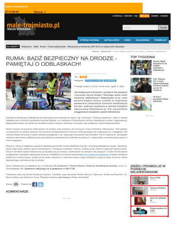 male-trojmiasto.pl 2014-09-08 Strona: 1 O PORTALU KONTAKT FAQ REKLAMA KARIERA COOKIES Szukaj STRONA GŁÓWNA NA SKRÓTY AKTUALNOŚCI VIDEO Szukaj OGŁOSZENIA PROMOCJE Wejherowo Reda Rumia Powiat wejherowski Mieszkania w Kamienicy ART ECO w nowej cenie! Sprawdź! Główna / Aktualności / Rumia: Bądź bezpieczny na drodze - pamiętaj o odblaskach! RUMIA: BĄDŹ BEZPIECZNY NA DRODZE PAMIĘTAJ O ODBLASKACH! TOP TYGODNIA Rumia: Bądź bezpieczny na drodze pamiętaj o odblaskach! Utworzono: poniedziałek, 08 września 2014 Typ: RUMIA Kategorie: ŻYCIE NA CO DZIEŃ NAJNOWSZE P margin-bottom: 0.21cm; A:link color: rgb(0, 0, 255); Jak bezpiecznie korzystać z przejścia dla pieszych i poruszać się po drodze? Dlaczego warto nosić elementy odblaskowe? Odpowiedzi na te i inne pytania będzie można znaleźć w najbliższy weekend w pomorskich Centrach Handlowych Auchan, podczas spotkania w ramach kampanii edukacyjnej Odblaskowi.pl. Dla uczestników przygotowano bezpłatne opaski odblaskowe. Film "Miasto 44" w kinie Wejherowskiego Centrum Kultury już od 19 września W Rumi powstanie Rada Seniorów REKLAMA Kampania edukacyjna Odblaskowi.pl skierowana jest zarówno do dzieci, jak i dorosłych. Podczas spotkania, które w sobotę odbędzie się w Centrum Handlowym Auchan Gdańsk, a w niedzielę w Porcie Rumia Centrum Handlowym Auchan, organizatorzy będą przekonywali, że wystarczy niewielka zmiana naszych zachowań na drodze, aby zwiększyć nasze bezpieczeństwo. Warto zacząć od poprawy widoczności na drodze oraz przejściu dla pieszych i nosić elementy odblaskowe. Taki gadżet umieszczony na ubraniu sprawia, że w terenie niezabudowanym kierowca widzi pieszego lub rowerzystę już z odległości 150 metrów! Dzięki temu jest w stanie szybciej zareagować i np. rozpocząć hamowanie samochodem. Od 31 sierpnia br. obowiązek noszenia elementów odblaskowych poza terenem zabudowanym nakłada na pieszych i rowerzystów znowelizowane prawo o ruchu drogowym. Wszyscy, którzy w najbliższy weekend odwiedzą pomorskie Centra Handlowe Auchan, otrzymają odblaskowe opaski. Najmłodsi będą mogli wziąć udział w grach edukacyjnych, rozwiązać krzyżówki i rebusy, a także wziąć udział w zajęciach plastycznych, których tematem będzie bezpieczne poruszanie się po drodze i zachowanie na przejściu dla pieszych. Z kolei dla dorosłych przygotowano specjalne edukacyjne broszury. Dodatkowo na stronie internetowej www.akademia.odblaskowi.pl będzie dostępna platforma e-learningowa, dzięki której dzieci wspólnie z rodzicami będą mogły wzbogacić swoją wiedzę na temat zasad bezpiecznego zachowania się na drodze. Akcja Odblaskowi.pl odbędzie się w niedzielę 14 września w Porcie Rumia Centrum Handlowym Auchan, przy ul. Grunwaldzkiej 108. Spotkania odbywają się w godzinach 11.00-17.00. Partnerami akcji są Centra Handlowe Auchan, Carefleet, sieci serwisów Perfect Service, QService, Q-Service Premium i QService Moto oraz Q-Service Truck. Patronat medialny objął Magazyn Fleet i Auto Świat. Drukuj ZNIŻKI I PROMOCJE W POWIECIE WEJHEROWSKIM Dovre 2100 MirBud Podziel się Tarnavva Primero MirBud KOMENTARZE REKLAMA INVICTA SEDAN 10 MirBud Pompa wodna mh 1300 MirBud male-trojmiasto.pl 2014-09-08 Strona: 2 ARYSTO 10 FASADA 670/510 MirBud Kickboxing w grupie GOŚCICINO WSS Wejherowo POGODA W MTK Dziś: 23° 10° przeważnie pochmurno, 50% możliwość deszczu Wtorek: 20° 11° przeważnie pochmurno Środa: 19° 10° przeważnie pochmurno, 75% możliwość deszczu REKLAMA NOTOWANIA WALUT Data: poniedziałek, 08 września 2014 USD 3,23 0,30% AUD 3,02 0,28% EUR 4,18 0,18% CHF 3,47 0,07% GBP 5,21 1,27% JPY 3,07 -0,09% CZK 0,15 -0,86% AKTUALNOŚCI NA SKRÓTY Strona główna Aktualności Video Ogłoszenia Promocje Wejherowo Reda Rumia Powiat wejherowski Mieszkania w Kamienicy ART ECO w nowej cenie! Sprawdź! INFORMACJE O portalu Kontakt FAQ Reklama Kariera Cookies Copyrights 2013 male-trojmiasto.pl Korzystamy z plików cookies i umożliwiamy zamieszczanie ich osobom trzecim. Pliki cookie pozwalają na poznanie twoich preferencji na podstawie zachowań w serwisie. Uznajemy, że jeżeli kontynuujesz korzystanie z serwisu, wyrażasz na to zgodę. (x) Zamknij