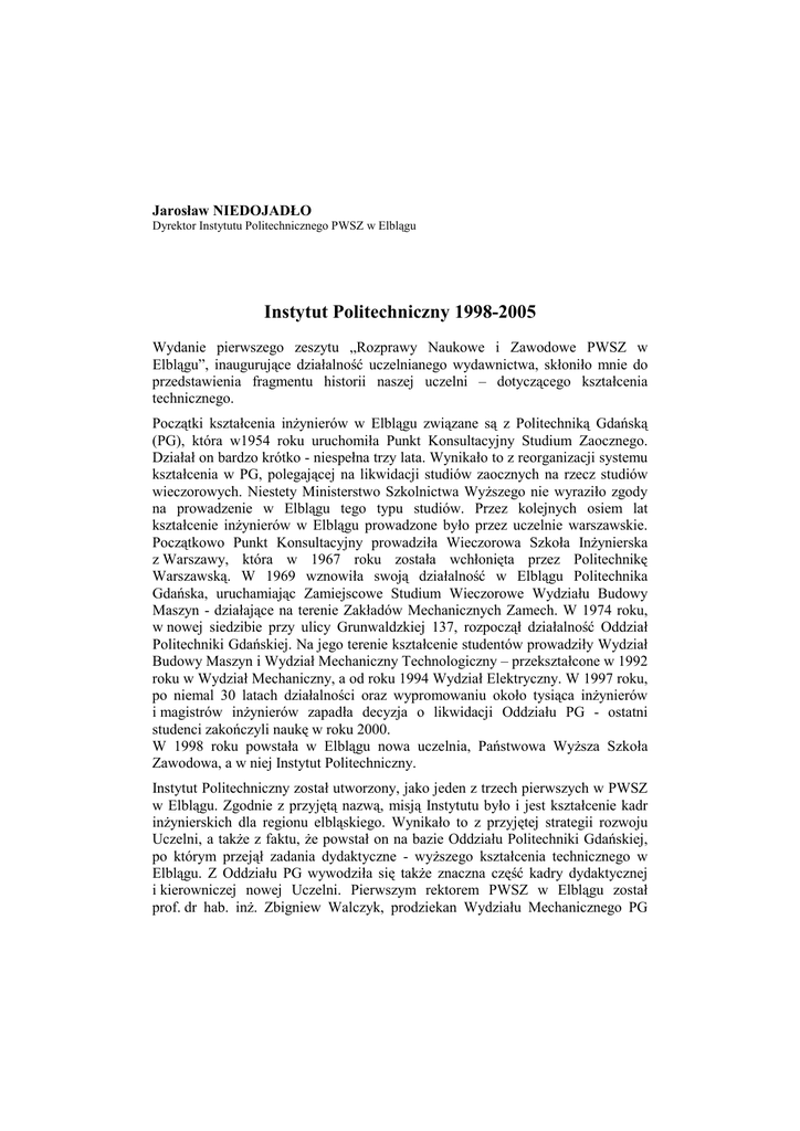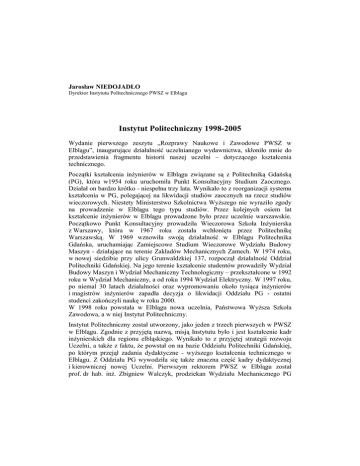 Jarosław NIEDOJADŁO Dyrektor Instytutu Politechnicznego PWSZ w Elblągu Instytut Politechniczny 1998-2005 Wydanie pierwszego zeszytu „Rozprawy Naukowe i Zawodowe PWSZ w Elblągu”, inaugurujące działalność uczelnianego wydawnictwa, skłoniło mnie do przedstawienia fragmentu historii naszej uczelni – dotyczącego kształcenia technicznego. Początki kształcenia inŜynierów w Elblągu związane są z Politechniką Gdańską (PG), która w1954 roku uruchomiła Punkt Konsultacyjny Studium Zaocznego. Działał on bardzo krótko - niespełna trzy lata. Wynikało to z reorganizacji systemu kształcenia w PG, polegającej na likwidacji studiów zaocznych na rzecz studiów wieczorowych. Niestety Ministerstwo Szkolnictwa WyŜszego nie wyraziło zgody na prowadzenie w Elblągu tego typu studiów. Przez kolejnych osiem lat kształcenie inŜynierów w Elblągu prowadzone było przez uczelnie warszawskie. Początkowo Punkt Konsultacyjny prowadziła Wieczorowa Szkoła InŜynierska z Warszawy, która w 1967 roku została wchłonięta przez Politechnikę Warszawską. W 1969 wznowiła swoją działalność w Elblągu Politechnika Gdańska, uruchamiając Zamiejscowe Studium Wieczorowe Wydziału Budowy Maszyn - działające na terenie Zakładów Mechanicznych Zamech. W 1974 roku, w nowej siedzibie przy ulicy Grunwaldzkiej 137, rozpoczął działalność Oddział Politechniki Gdańskiej. Na jego terenie kształcenie studentów prowadziły Wydział Budowy Maszyn i Wydział Mechaniczny Technologiczny – przekształcone w 1992 roku w Wydział Mechaniczny, a od roku 1994 Wydział Elektryczny. W 1997 roku, po niemal 30 latach działalności oraz wypromowaniu około tysiąca inŜynierów i magistrów inŜynierów zapadła decyzja o likwidacji Oddziału PG - ostatni studenci zakończyli naukę w roku 2000. W 1998 roku powstała w Elblągu nowa uczelnia, Państwowa WyŜsza Szkoła Zawodowa, a w niej Instytut Politechniczny. Instytut Politechniczny został utworzony, jako jeden z trzech pierwszych w PWSZ w Elblągu. Zgodnie z przyjętą nazwą, misją Instytutu było i jest kształcenie kadr inŜynierskich dla regionu elbląskiego. Wynikało to z przyjętej strategii rozwoju Uczelni, a takŜe z faktu, Ŝe powstał on na bazie Oddziału Politechniki Gdańskiej, po którym przejął zadania dydaktyczne - wyŜszego kształcenia technicznego w Elblągu. Z Oddziału PG wywodziła się takŜe znaczna część kadry dydaktycznej i kierowniczej nowej Uczelni. Pierwszym rektorem PWSZ w Elblągu został prof. dr hab. inŜ. Zbigniew Walczyk, prodziekan Wydziału Mechanicznego PG ds. Oddziału w Elblągu, zaś pierwszym dyrektorem Instytutu Politechnicznego został dr inŜ. Jarosław Niedojadło, kierownik Oddziału WM PG. Pierwsza rekrutacja na studia odbyła się w czerwcu 1998 roku, tuŜ przed oficjalnym utworzeniem PWSZ. Na pierwszy rok studiów w Instytucie przyjęto 78 studentów, którzy 1 października podjęli naukę na dwóch specjalnościach „technologia budowy maszyn” oraz „systemy, maszyny i urządzenia energetyczne”. Obie specjalności były bezpośrednią kontynuacją kształcenia inŜynierskiego, prowadzonego przez lata w elbląskim Oddziale Politechniki. W początkowym okresie, Instytut Politechniczny działał w jednej siedzibie - przy ul. Grunwaldzkiej 137 - z Oddziałem Wydziału Mechanicznego PG, którego starsze roczniki studentów kończyły studia. Wspólne było takŜe kierownictwo obu jednostek, gdyŜ dyrektor Instytutu pełnił równocześnie funkcję kierownika Oddziału. Ten okres działalności miał pozytywny wpływ na rozwój Instytutu. Studenci pierwszego rocznika nowej uczelni rozpoczynali naukę wśród starszych staŜem studentów Politechniki Gdańskiej, od których uczyli się zwyczajów panujących w uczelniach akademickich oraz przejmowali tradycje studenckie. Zaowocowało to równieŜ bardzo dobrą współpracą z Wydziałem Mechanicznym PG, który do dnia dzisiejszego bardzo Ŝyczliwie patronuje kształceniu technicznemu prowadzonemu w Instytucie Politechnicznym. W pionierskim okresie budowy Instytutu, oprócz organizacji bazy laboratoryjnej oraz poszukiwania najlepszej kadry nauczycielskiej, prowadzono bardzo intensywne prace nad poszerzeniem oferty dydaktycznej. JuŜ jesienią 1998 roku przygotowano dokumentację, niezbędną do uruchomienia dwóch nowych specjalności. Pierwszą z nich była „inŜynieria produkcji”. W odróŜnieniu od dwóch dotychczas prowadzonych specjalności „mechanicznych”, była ukierunkowana na kształcenie specjalistów z zakresu projektowania i organizacji procesów produkcyjnych. Została ona przygotowana przy merytorycznej współpracy z Wydziałem Mechanicznym PG. Szczególnie duŜą pomoc przy opracowaniu dokumentacji uzyskaliśmy ze strony dr inŜ. Jerzego Wojciechowskiego oraz prof. dr inŜ. Włodzimierza Przybylskiego. Drugą specjalnością była „ochrona środowiska”. Została ona ukierunkowana na kształcenie specjalistów posiadających szeroką wiedzę z zakresu nauk przyrodniczych i technicznych, potrafiących rozwiązywać problemy technicznoorganizacyjne spotykane w ochronie środowiska. Takie interdyscyplinarne kształcenie stanowiło novum nie tylko na rynku elbląskim. Była to pierwsza w Polsce specjalność inŜynierska w ramach kierunku ochrony środowiska, kierunku przynaleŜnego do nauk przyrodniczych. W ramach specjalności utworzono trzy kierunki dyplomowania: „oczyszczanie wody i ścieków”, „gospodarka odpadami” oraz „ochrona środowiska w energetyce”, które w końcowym okresie studiów przygotowywały studentów do wykonania specjalistycznych prac dyplomowych. Specjalność została przygotowana przy ścisłej współpracy z gdańskim ośrodkiem akademickim. Głównymi autorami specjalności byli: prof. dr hab. Jan Drwal - przedstawiciel Uniwersytetu Gdańskiego; prof. nadzw. dr hab. inŜ. Bernard Quant - przedstawiciel Politechniki Gdańskiej; prof. nadzw. dr hab. inŜ. Krystyna Męd