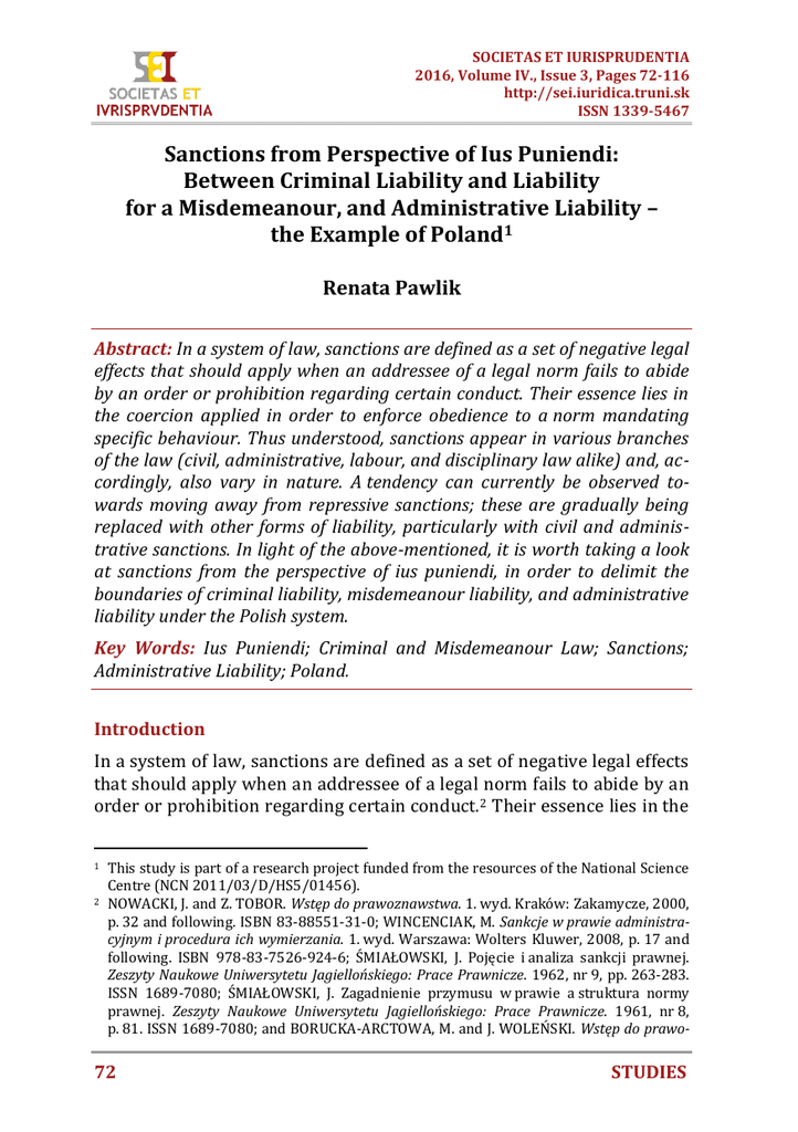 SOCIETAS ET IURISPRUDENTIA 2016, Volume IV., Issue 3, Pages 72-116 http://sei.iuridica.truni.sk ISSN 1339-5467 Sanctions from Perspective of Ius Puniendi: Between Criminal Liability and Liability for a Misdemeanour, and Administrative Liability – the Example of Poland1 Renata Pawlik Abstract: In a system of law, sanctions are defined as a set of negative legal effects that should apply when an addressee of a legal norm fails to abide by an order or prohibition regarding certain conduct. Their essence lies in the coercion applied in order to enforce obedience to a norm mandating specific behaviour. Thus understood, sanctions appear in various branches of the law (civil, administrative, labour, and disciplinary law alike) and, accordingly, also vary in nature. A tendency can currently be observed towards moving away from repressive sanctions; these are gradually being replaced with other forms of liability, particularly with civil and administrative sanctions. In light of the above-mentioned, it is worth taking a look at sanctions from the perspective of ius puniendi, in order to delimit the boundaries of criminal liability, misdemeanour liability, and administrative liability under the Polish system. Key Words: Ius Puniendi; Criminal and Misdemeanour Law; Sanctions; Administrative Liability; Poland. Introduction In a system of law, sanctions are defined as a set of negative legal effects that should apply when an addressee of a legal norm fails to abide by an order or prohibition regarding certain conduct. 2 Their essence lies in the 1 2 This study is part of a research project funded from the resources of the National Science Centre (NCN 2011/03/D/HS5/01456). NOWACKI, J. and Z. TOBOR. Wstęp do prawoznawstwa. 1. wyd. Kraków: Zakamycze, 2000, p. 32 and following. ISBN 83-88551-31-0; WINCENCIAK, M. Sankcje w prawie administracyjnym i procedura ich wymierzania. 1. wyd. Warszawa: Wolters Kluwer, 2008, p. 17 and following. ISBN 978-83-7526-924-6; ŚMIAŁOWSKI, J. Pojęcie i analiza sankcji prawnej. Zeszyty Naukowe Uniwersytetu Jagiellońskiego: Prace Prawnicze. 1962, nr 9, pp. 263-283. ISSN 1689-7080; ŚMIAŁOWSKI, J. Zagadnienie przymusu w prawie a struktura normy prawnej. Zeszyty Naukowe Uniwersytetu Jagiellońskiego: Prace Prawnicze. 1961, nr 8, p. 81. ISSN 1689-7080; and BORUCKA-ARCTOWA, M. and J. WOLEŃSKI. Wstęp do prawo- 72 STUDIES SOCIETAS ET IURISPRUDENTIA 2016, Volume IV., Issue 3, Pages 72-116 http://sei.iuridica.truni.sk ISSN 1339-5467 coercion applied in order to enforce obedience to a norm mandating specific behaviour. Thus understood, sanctions appear in various branches of the law (civil, administrative, labour, and disciplinary law alike) and, accordingly, also vary in nature. J. Woleński distinguishes three basic types: repressive sanctions, enforcement sanctions, and sanctions of nullity.3 Repressive sanctions are designed to inflict punishment on those who break the law, while enforcement sanctions serve to bring about a certain state of affairs that violation of the law has prevented. In criminal and misdemeanour law, it is also important to distinguish harshness as a separate category that should remain proportional to the crime committed.4 The third type, the sanction of nullity, consists in rendering null and void an action aimed at achieving certain legal effects due to their non-compliance with binding legal requirements. 5 3 4 5 znawstwa. 2. wyd. Kraków: Wydawnictwo Uniwersytetu Jagiellońskiego, 1997, p. 76. ISBN 83-233-1065-3. See BORUCKA-ARCTOWA, M. and J. WOLEŃSKI. Wstęp do prawoznawstwa. 2. wyd. Kraków: Wydawnictwo Uniwersytetu Jagiellońskiego, 1997, p. 77. ISBN 83-233-1065-3. See Article 53 of the Penal Code. It seems that penal sanctions should be distinguished from penalties based on the broader understanding of the penal sanction as a response to crime composed of a penalty, as defined in the Article 32 of the Penal Code, and a penal measure, as defined in the Article 39 of the Penal Code. For more information on the latter cf. WRÓBEL, W. and A. ZOLL. Polskie prawo karne: Część ogólna. 1. wyd. Kraków: Znak, 2010, p. 412. ISBN 978-83-240-1351-7; cf. also JANISZEWSKI, B. Dolegliwość jako element współczesnej kary kryminalnej. In: J. GIEZEK, ed. Przestępstwo – kara – polityka kryminalna: Problemy tworzenia i funkcjonowania prawa: Księga jubileuszowa z okazji 70. rocznicy urodzin Profesora Tomasza Kaczmarka. 1. wyd. Kraków: Zakamycze, 2006, p. 302. ISBN 83-7444-283-2; CIEŚLAK, M. Polskie prawo karne: Zarys systemowego ujęcia. 2. popr. i uzup. wyd. Warszawa: Wydawnictwo Naukowe PWN, 1994, p. 433. ISBN 83-0111562-9; WRÓBLEWSKI, B. Penologia: Socjologia kar: Tom I. 1. wyd. Wilno: [s.n.], 1926, p. 185 and following; WARYLEWSKI, J. Prawo karne: Część ogólna. 1. wyd. Warszawa: LexisNexis, 2004, p. 344. ISBN 83-7334-375-X; ANDREJEW, I. Polskie prawo karne w zarysie. 5. wyd. Warszawa: Państwowe Wydawnictwo Naukowe, 1978, pp. 244-245; ŚWIDA, W. Prawo karne. 1. wyd. Warszawa: Państwowe Wydawnictwo Naukowe, 1978, p. 256; MAREK, A. Prawo karne: Zagadnienia teorii i praktyki. 1. wyd. Warszawa: C. H. Beck, 1997, pp. 232-233. ISBN 83-7110-801-X; KOCHANOWSKI, J. Subiektywne granice sprawstwa i odpowiedzialności karnej. 1. wyd. Warszawa: Wydawnictwo Prawnicze, 1985, pp. 5-17. ISBN 83-219-0327-4; and KRÓLIKOWSKI, M. Sprawiedliwość karania w społeczeństwach liberalnych: Zasada proporcjonalności. 1. wyd. Warszawa: C. H. Beck, 2005, p. 1. ISBN 837387-969-2. See BORUCKA-ARCTOWA, M. and J. WOLEŃSKI. Wstęp do prawoznawstwa. 2. wyd. Kraków: Wydawnictwo Uniwersytetu Jagiellońskiego, 1997, p. 77. ISBN 83-233-1065-3; and WINCENCIAK, M. Sankcje w prawie administracyjnym i procedura ich wymierzania. 1. wyd. Warszawa: Wolters Kluwer, 2008, p. 17 and following. ISBN 978-83-7526-924-6. STUDIES 73 SOCIETAS ET IURISPRUDENTIA 2016, ročník IV., číslo 3, s. 72-116 http://sei.iuridica.truni.sk ISSN 1339-5467 The idea of sanction should be distingui