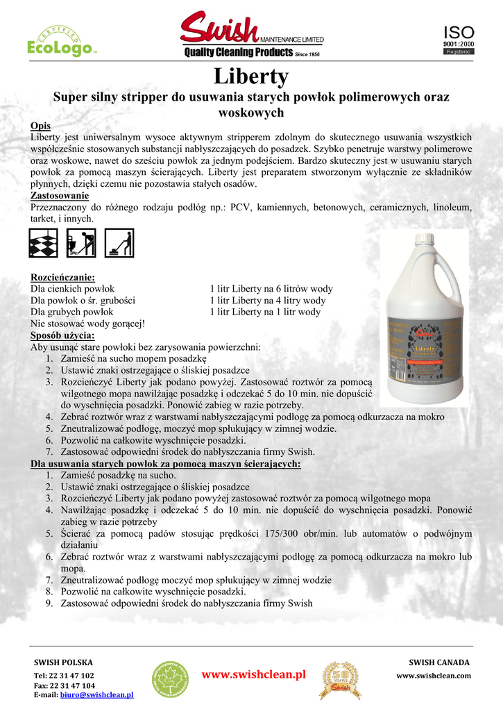 Liberty Super silny stripper do usuwania starych powłok polimerowych oraz woskowych Opis Liberty jest uniwersalnym wysoce aktywnym stripperem zdolnym do skutecznego usuwania wszystkich współcześnie stosowanych substancji nabłyszczających do posadzek. Szybko penetruje warstwy polimerowe oraz woskowe, nawet do sześciu powłok za jednym podejściem. Bardzo skuteczny jest w usuwaniu starych powłok za pomocą maszyn ścierających. Liberty jest preparatem stworzonym wyłącznie ze składników płynnych, dzięki czemu nie pozostawia stałych osadów. Zastosowanie Przeznaczony do różnego rodzaju podłóg np.: PCV, kamiennych, betonowych, ceramicznych, linoleum, tarket, i innych. Rozcieńczanie: Dla cienkich powłok 1 litr Liberty na 6 litrów wody Dla powłok o śr. grubości 1 litr Liberty na 4 litry wody Dla grubych powłok 1 litr Liberty na 1 litr wody Nie stosować wody gorącej! Sposób użycia: Aby usunąć stare powłoki bez zarysowania powierzchni: 1. Zamieść na sucho mopem posadzkę 2. Ustawić znaki ostrzegające o śliskiej posadzce 3. Rozcieńczyć Liberty jak podano powyżej. Zastosować roztwór za pomocą wilgotnego mopa nawilżając posadzkę i odczekać 5 do 10 min. nie dopuścić do wyschnięcia posadzki. Ponowić zabieg w razie potrzeby. 4. Zebrać roztwór wraz z warstwami nabłyszczającymi podłogę za pomocą odkurzacza na mokro 5. Zneutralizować podłogę, moczyć mop spłukujący w zimnej wodzie. 6. Pozwolić na całkowite wyschnięcie posadzki. 7. Zastosować odpowiedni środek do nabłyszczania firmy Swish. Dla usuwania starych powłok za pomocą maszyn ścierających: 1. Zamieść posadzkę na sucho. 2. Ustawić znaki ostrzegające o śliskiej posadzce 3. Rozcieńczyć Liberty jak podano powyżej zastosować roztwór za pomocą wilgotnego mopa 4. Nawilżając posadzkę i odczekać 5 do 10 min. nie dopuścić do wyschnięcia posadzki. Ponowić zabieg w razie potrzeby 5. Ścierać za pomocą padów stosując prędkości 175/300 obr/min. lub automatów o podwójnym działaniu 6. Zebrać roztwór wraz z warstwami nabłyszczającymi podłogę za pomocą odkurzacza na mokro lub mopa. 7. Zneutralizować podłogę moczyć mop spłukujący w zimnej wodzie 8. Pozwolić na całkowite wyschnięcie posadzki. 9. Zastosować odpowiedni środek do nabłyszczania firmy Swish SWISH POLSKA Tel: 22 31 47 102 Fax: 22 31 47 104 E-mail: [email protected] www.swishclean.pl SWISH CANADA www.swishclean.com Ostrzeżenia: Niebezpieczeństwo Działa szkodliwie po połknięciu. Powoduje poważne oparzenia skóry oraz uszkodzenia oczu. Może powodować podrażnienie dróg oddechowych. Działa szkodliwie w następstwie wdychania. Nie wdychać mgły/par/rozpylonej cieczy. W PRZYPADKU POŁKNIĘCIA: wypłukać usta. NIE wywoływać wymiotów. W PRZYPADKU KONTAKTU ZE SKÓRĄ (lub z włosami): Natychmiast zdjąć całą zanieczyszczoną odzież. Spłukać skórę pod strumieniem wody/prysznicem. W PRZYPADKU DOSTANIA SIĘ DO DRÓG ODDECHOWYCH: wyprowadzić lub wynieść poszkodowanego na świeże powietrze i zapewnić mu warunki do swobodnego oddychania. W PRZYPADKU DOSTANIA SIĘ DO OCZU: Ostrożnie płukać wodą przez kilka minut. Wyjąć soczewki kontaktowe, jeżeli są i można je łatwo usunąć. Nadal płukać. W przypadku złego samopoczucia skontaktować się z OŚRODKIEM ZATRUĆ/lekarzem. Zawartość/pojemnik usuwać zgodnie z krajowymi przepisami. Zawiera 2-aminoetanol; 2-butoksyetanol. Pojemność – 1L, 5L, 20L WARTOŚĆ pH – 12,4 PZH NR HŻ 1/03008/1/00 OKRES PRZYDATNOŚCI - 36 miesięcy PRZED ZASTOSOWANIEM PRZECZYTAJ KARTĘ INFORMACYJNĄ PRODUKTU BHP! OZNACZENIA DODA TKOWE - piktogramy charakteryzujące sposób użycia PRODUCENT: SWISH MAINTENANCE Ltd. Petrborogh Ontario K9J IN4, KANADA SWISH POLSKA Tel: 22 31 47 102 Fax: 22 31 47 104 E-mail: [email protected] www.swishclean.pl SWISH CANADA www.swishclean.com