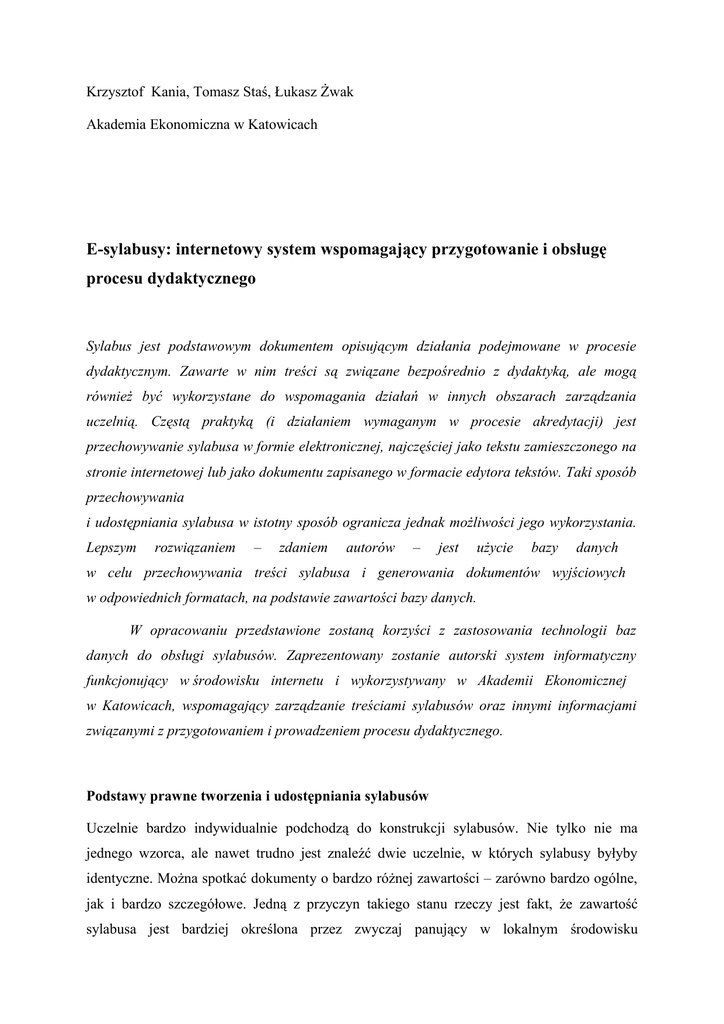 Krzysztof Kania, Tomasz Staś, Łukasz Żwak Akademia Ekonomiczna w Katowicach E-sylabusy: internetowy system wspomagający przygotowanie i obsługę procesu dydaktycznego Sylabus jest podstawowym dokumentem opisującym działania podejmowane w procesie dydaktycznym. Zawarte w nim treści są związane bezpośrednio z dydaktyką, ale mogą również być wykorzystane do wspomagania działań w innych obszarach zarządzania uczelnią. Częstą praktyką (i działaniem wymaganym w procesie akredytacji) jest przechowywanie sylabusa w formie elektronicznej, najczęściej jako tekstu zamieszczonego na stronie internetowej lub jako dokumentu zapisanego w formacie edytora tekstów. Taki sposób przechowywania i udostępniania sylabusa w istotny sposób ogranicza jednak możliwości jego wykorzystania. Lepszym rozwiązaniem – zdaniem autorów – jest użycie bazy danych w celu przechowywania treści sylabusa i generowania dokumentów wyjściowych w odpowiednich formatach, na podstawie zawartości bazy danych. W opracowaniu przedstawione zostaną korzyści z zastosowania technologii baz danych do obsługi sylabusów. Zaprezentowany zostanie autorski system informatyczny funkcjonujący w środowisku internetu i wykorzystywany w Akademii Ekonomicznej w Katowicach, wspomagający zarządzanie treściami sylabusów oraz innymi informacjami związanymi z przygotowaniem i prowadzeniem procesu dydaktycznego. Podstawy prawne tworzenia i udostępniania sylabusów Uczelnie bardzo indywidualnie podchodzą do konstrukcji sylabusów. Nie tylko nie ma jednego wzorca, ale nawet trudno jest znaleźć dwie uczelnie, w których sylabusy byłyby identyczne. Można spotkać dokumenty o bardzo różnej zawartości – zarówno bardzo ogólne, jak i bardzo szczegółowe. Jedną z przyczyn takiego stanu rzeczy jest fakt, że zawartość sylabusa jest bardziej określona przez zwyczaj panujący w lokalnym środowisku akademickim niż poprzez normy prawne. Jednak wskazówki co do zawartości sylabusa oraz potrzeby jego udostępniania są zawarte w uchwałach Prezydium Państwowej Komisji Akredytacyjnej. W treści załącznika do Uchwały Nr 501/2008 PPKA w sprawie kryteriów oceny planów studiów i programów nauczania w punkcie 8 wskazano, że: wymagania dotyczące planów studiów i programów nauczania są spełnione, jeżeli: opracowano dla poszczególnych przedmiotów sylabusy uwzględniające: • nazwę jednostki prowadzącej kierunek, • nazwę kierunku (podanie nazw ew. specjalności), • nazwę przedmiotu, • określenie przedmiotów wprowadzających wraz z wymaganiami wstępnymi, • liczbę godzin zajęć dydaktycznych, w tym wykładów, ćwiczeń, laboratoriów, seminariów itp., realizowanych w systemie studiów stacjonarnych i niestacjonarnych, • liczbę punktów ECTS, • założenia i cele przedmiotu, • metody dydaktyczne, • formę i warunki zaliczenia przedmiotu, • treści programowe, • wykaz literatury podstawowej i uzupełniającej, • nazwisko osoby prowadzącej/osób prowadzących. Jednocześnie Uchwała Nr 218/ 2008 PPKA, w sprawie kryteriów oceny spełnienia wymagań w zakresie spraw studenckich, wskazuje że wymagania te są spełnione, jeżeli m.in.: zapewniony jest odpowiedni dostęp do informacji związanych z tokiem studiów (harmonogramu zajęć, sesji egzaminacyjnych, konsultacji, sylabusów) oraz materiałów niezbędnych w procesie dydaktycznym (materiałów do zajęć, skryptów itd.). Ponadto w uchwale Nr 1043/2004 PPKA w sprawie zasad przeprowadzania wizytacji, w części poświęconej ocenie organizacji i realizacji procesu dydaktycznego, sformułowano zalecenie dokonania oceny dostępności i jakości sylabusów. Najczęściej spotykanym sposobem wypełnienia tych wymogów jest utworzenie na uczelni zbioru dokumentów w formie elektronicznej i papierowej. Wydaje się jednak, że lepszym sposobem wypełnienia zaleceń PPKA (niż przechowywanie sylabusów jako prostych, pojedynczych dokumentów) jest scentralizowany, wykorzystujący bazę danych, internetowy system informatyczny. Takie podejście jest również zgodne z zaleceniami norm jakościowych ISO 9001, które wskazują, że obieg dokumentów powinien w maksymalnym stopniu odbywać się w postaci elektronicznej. Otwartość dostępu do informacji o szczegółach procesu kształcenia staje się coraz bardziej potrzebna w związku z możliwością studiowania wybranych przedmiotów poza macierzystą uczelnią, możliwością zaliczania przedmiotów na innych uczelniach oraz powstawaniem kierunków międzyuczelnianych. Powinna zatem istnieć możliwość wglądu w sylabusy także przez studentów innych uczelni. Zakres i forma przekazywanej informacji mogą być indywidualizowane i zależne od siły związków między uczelniami. Udostępnienie treści zawartych w sylabusach dla studentów spoza uczelni wspiera ustalenia Deklaracji Bolońskiej, która postuluje zapewnienie swobodnego przepływu studentów między uczelniami. Dzięki łatwemu dostępowi do informacji zawartych w sylabusach studenci łatwiej mogą porównać przedmioty i zbadać możliwość ich zaliczania na uczelniach innych niż macierzysta. Korzyści strukturalizacji treści sylabusów Udostępnianie dokumentów w formie papierowej ma wszystkie dobrze znane niedogodności: ograniczoną liczbę użytkowników, ograniczony czas dostępu, nietrwałość dokumentu, pojawianie się nieautoryzowanych kopii dokumentu itp. Obecnie najbardziej rozpowszechnioną formą przechowywania sylabusów są dokumenty zbudowane za pomocą edytorów tekstów, umieszczane następnie na stronach internetowych uczelni. Forma elektroniczna (wymagana również w procesie akredytacji) prostych dokumentów tekstowych ma wiele zalet, w tym: łatwe powielanie i łatwą edycję. Jednak sama zmiana formy dokumentu z papierowej na elektroniczną rozwiązuje tylko część problemów. Tworzenie i przechowywanie dokumentów w postaci plików edytora tekstu związane jest z wielom