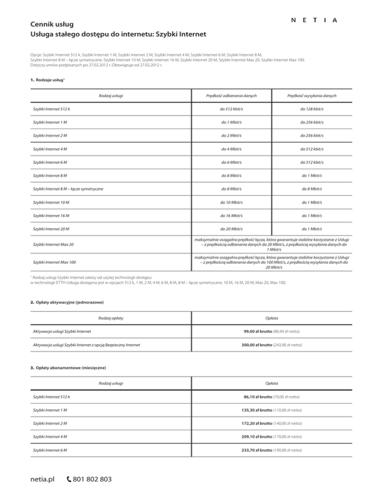 Cennik usług Usługa stałego dostępu do internetu: Szybki Internet Opcje: Szybki Internet 512 k, Szybki Internet 1 M, Szybki Internet 2 M, Szybki Internet 4 M, Szybki Internet 6 M, Szybki Internet 8 M, Szybki Internet 8 M – łącze symetryczne, Szybki Internet 10 M, Szybki Internet 16 M, Szybki Internet 20 M, Szybki Internet Max 20, Szybki Internet Max 100. Dotyczy umów podpisanych po 27.02.2012 r. Obowiązuje od 27.02.2012 r. 1. Rodzaje usług1 Rodzaj usługi Prędkość odbierania danych Prędkość wysyłania danych do 512 kbit/s do 128 kbit/s Szybki Internet 1 M do 1 Mbit/s do 256 kbit/s Szybki Internet 2 M do 2 Mbit/s do 256 kbit/s Szybki Internet 4 M do 4 Mbit/s do 512 kbit/s Szybki Internet 6 M do 6 Mbit/s do 512 kbit/s Szybki Internet 8 M do 8 Mbit/s do 1 Mbit/s Szybki Internet 8 M – łącze symetryczne do 8 Mbit/s do 8 Mbit/s Szybki Internet 10 M do 10 Mbit/s do 1 Mbit/s Szybki Internet 16 M do 16 Mbit/s do 1 Mbit/s Szybki Internet 20 M do 20 Mbit/s do 1 Mbit/s Szybki Internet 512 k Szybki Internet Max 20 maksymalnie osiągalna prędkość łącza, która gwarantuje stabilne korzystanie z Usługi – z prędkością odbierania danych do 20 Mbit/s, z prędkością wysyłania danych do 1 Mbit/s Szybki Internet Max 100 maksymalnie osiągalna prędkość łącza, która gwarantuje stabilne korzystanie z Usługi – z prędkością odbierania danych do 100 Mbit/s, z prędkością wysyłania danych do 20 Mbit/s Rodzaj usługi Szybki Internet zależy od użytej technologii dostępu: w technologii ETTH Usługa dostępna jest w opcjach 512 k, 1 M, 2 M, 4 M, 6 M, 8 M, 8 M – łącze symetryczne, 10 M, 16 M, 20 M, Max 20, Max 100. 1 2. Opłaty aktywacyjne (jednorazowe) Rodzaj opłaty Opłata 99,00 zł brutto (80,49 zł netto) Aktywacja usługi Szybki Internet Aktywacja usługi Szybki Internet z opcją Bezpieczny Internet 300,00 zł brutto (243,90 zł netto) 3. Opłaty abonamentowe (miesięczne) Rodzaj usługi Opłata 86,10 zł brutto (70,00 zł netto) Szybki Internet 512 k Szybki Internet 1 M 135,30 zł brutto (110,00 zł netto) Szybki Internet 2 M 172,20 zł brutto (140,00 zł netto) Szybki Internet 4 M 209,10 zł brutto (170,00 zł netto) Szybki Internet 6 M 233,70 zł brutto (190,00 zł netto) netia.pl 801 802 803 Cennik usług Usługa stałego dostępu do internetu: Szybki Internet Szybki Internet 8 M 258,30 zł brutto (210,00 zł netto) Szybki Internet 8 M – łącze symetryczne 356,70 zł brutto (290,00 zł netto) Szybki Internet 10 M 282,90 zł brutto (230,00 zł netto) Szybki Internet 16 M 307,50 zł brutto (250,00 zł netto) Szybki Internet 20 M 356,70 zł brutto (290,00 zł netto) Szybki Internet Max 20 356,70 zł brutto (290,00 zł netto) Szybki Internet Max 100 430,50 zł brutto (350,00 zł netto) 4. Opłaty za usługi i czynności dodatkowe A. Bezpieczny Internet Rodzaj usługi Sposób naliczania Opłata Opcja Bezpieczny Internet Opłata miesięczna 9,90 zł brutto (8,05 zł netto) Opcja Bezpieczny Internet (3 PC) Opłata miesięczna 15,02 zł brutto (12,21 zł netto) Opcja Bezpieczny Internet Premium Opłata miesięczna 15,02 zł brutto (12,21 zł netto) Opcja Bezpieczny Internet Premium (3 PC) Opłata miesięczna 20,06 zł brutto (16,31 zł netto) Opłata jednorazowa 200,63 zł brutto (163,11 zł netto) Sposób naliczania Opłata Wirtualny Dysk2 Opłata miesięczna 2,00 zł brutto (1,63 zł netto) Wirtualny Dysk – opcja nielimitowana3 Opłata miesięczna 14,99 zł brutto (12,19 zł netto) Aktywacja opcji Bezpieczny Internet B. Wirtualny Dysk1 Rodzaj usługi Wirtualny Dysk – usługa transmisji danych polegająca na przesyłaniu danych wybranych przez Abonenta do i z centrum danych Operatora. Dane Abonenta są przesyłane w sposób zaszyfrowany. Wirtualny Dysk jest aktywowany wraz z Szybkim Internetem. Jest to opcja limitowana usługi do 1 GB (jednego gigabajta) pojemności. 3 Wirtualny Dysk – opcja nielimitowana jest aktywowany po przekroczeniu przez Abonenta 1 GB (jednego gigabajta) zajętej przestrzeni. Abonent posiada możliwość płynnego przechodzenia pomiędzy opcjami limitowaną i nielimitowaną, w cyklach miesięcznych 1 2 C. Publiczny adres IP Rodzaj usługi Sposób naliczania Opłata Opłata miesięczna 6,05 zł brutto (4,92 zł netto) Sposób naliczania Opłata Aktywacja Netia Spota Opłata jednorazowa 150 zł brutto (121,95 zł netto) Dzierżawa Netia Spota Opłata miesięczna 1 zł brutto (0,81 zł netto) Opłata jednorazowa 300 zł brutto (243,90 zł netto) Opcja Publiczny adres IP 5. Pozostałe opłaty Rodzaj usługi Kara za niezwrócenie Netia Spota1 netia.pl 801 802 803 Cennik usług Usługa stałego dostępu do internetu: Szybki Internet Dzierżawa Routera Wi-Fi Kara za niezwrócenie Routera Wi-Fi1 1 Opłata miesięczna 1 zł brutto (0,81 zł netto) Opłata jednorazowa 400 zł brutto (325,20 zł netto) Urządzenia są własnością Operatora, w przypadku rozwiązania umowy w zakresie Usługi Internetowej Abonent zobowiązany jest do zwrócenia udostępnionego urządzenia w ciągu 14 dni od daty rozwiązania umowy. 6. Definicje A. ETTH – Usługa Internetowa świadczona z wykorzystaniem łącz Operatora opartych na technologii Ethernet. netia.pl 801 802 803