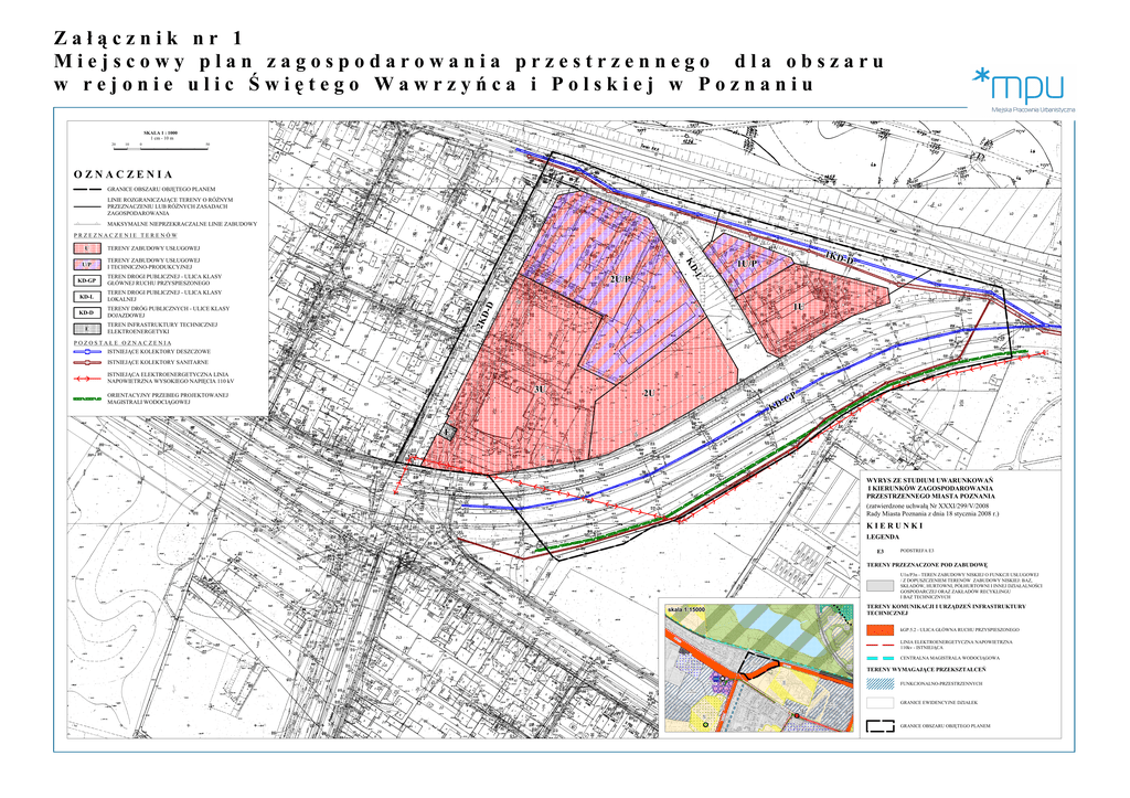Załącznik nr 1 Miejscowy plan zagospodarowania przestrzennego dla obszaru w rejonie ulic Świętego Wawrzyńca i Polskiej w Poznaniu SKALA 1 : 1000 1 cm - 10 m 20 10 0 50 1100 OZNACZENIA GRANICE OBSZARU OBJĘTEGO PLANEM 55 LINIE ROZGRANICZAJĄCE TERENY O RÓśNYM PRZEZNACZENIU LUB RÓśNYCH ZASADACH ZAGOSPODAROWANIA MAKSYMALNE NIEPRZEKRACZALNE LINIE ZABUDOWY PRZEZNACZENIE TERENÓW KD-GP KD-GP TEREN DROGI PUBLICZNEJ - ULICA KLASY GŁÓWNEJ RUCHU PRZYSPIESZONEGO KD-L KD-L TEREN DROGI PUBLICZNEJ - ULICA KLASY LOKALNEJ KD-D KD-D TERENY DRÓG PUBLICZNYCH - ULICE KLASY DOJAZDOWEJ TEREN INFRASTRUKTURY TECHNICZNEJ ELEKTROENERGETYKI 1U/P 55 2200 55 1U 1100 E E 2U/P 11K KD D--D D 1100 U/P U/P TERENY ZABUDOWY USŁUGOWEJ I TECHNICZNO-PRODUKCYJNEJ 22K KD D--D D TERENY ZABUDOWY USŁUGOWEJ LL D-KD K U U POZOSTAŁE OZNACZENIA ISTNIEJĄCE KOLEKTORY DESZCZOWE ISTNIEJĄCE KOLEKTORY SANITARNE ISTNIEJĄCA ELEKTROENERGETYCZNA LINIA NAPOWIETRZNA WYSOKIEGO NAPIĘCIA 110 kV 3U GPP G D KD K 55 2U 1100 ORIENTACYJNY PRZEBIEG PROJEKTOWANEJ MAGISTRALI WODOCIĄGOWEJ 1100 E 1133 WYRYS ZE STUDIUM UWARUNKOWAŃ I KIERUNKÓW ZAGOSPODAROWANIA PRZESTRZENNEGO MIASTA POZNANIA (zatwierdzone uchwałą Nr XXXI/299/V/2008 Rady Miasta Poznania z dnia 18 stycznia 2008 r.) KIERUNKI LEGENDA E3 PODSTREFA E3 TERENY PRZEZNACZONE POD ZABUDOWĘ U1n/P3n - TEREN ZABUDOWY NISKIEJ O FUNKCJI USŁUGOWEJ / Z DOPUSZCZENIEM TERENÓW ZABUDOWY NISKIEJ: BAZ, SKŁADÓW, HURTOWNI, PÓŁHURTOWNI I INNEJ DZIAŁALNOŚCI GOSPODARCZEJ ORAZ ZAKŁADÓW RECYKLINGU I BAZ TECHNICZNYCH skala 1:15000 1:15000 skala TERENY KOMUNIKACJI I URZĄDZEŃ INFRASTRUKTURY TECHNICZNEJ kGP.5.2 - ULICA GŁÓWNA RUCHU PRZYSPIESZONEGO LINIA ELEKTROENERGETYCZNA NAPOWIETRZNA 110kv - ISTNIEJĄCA CENTRALNA MAGISTRALA WODOCIĄGOWA TERENY WYMAGAJĄCE PRZEKSZTAŁCEŃ FUNKCJONALNO-PRZESTRZENNYCH GRANICE EWIDENCYJNE DZIAŁEK GRANICE OBSZARU OBJĘTEGO PLANEM