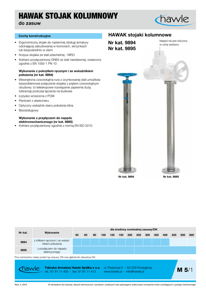 HAWAK STOJAK KOLUMNOWY do zasuw HAWAK stojaki kolumnowe Cechy konstrukcyjne • Ergonomiczny stojak do naziemnej obsługi armatury odcinającej zabudowanej w komorach, skrzynkach lub bezpośrednio w ziemi Napęd nie jest wliczony w cenę zestawu Nr kat. 9894 Nr kat. 9895 • Korpus stojaka ze stali szlachetnej - NIRO • Kołnierz przyłączeniowy DN65 ze stali nierdzewnej, owiercony zgodnie z EN 1092-1 PN 10 Wykonanie z pokrętłem ręcznym i ze wskaźnikiem położenia (nr kat. 9894) • Wewnętrzna czworokątna rura z ocynkowanej stali umożliwia bezproblemowe połączenie stojaka z prętem czworokątnym obudowy; to teleskopowe rozwiązanie zapewnia dużą tolerancję podczas łączenia na budowie • Łożysko wrzeciona z POM • Pierścień z elastomeru • Optyczny wskaźnik stanu położenia klina • Bezobsługowy Wykonanie z przyłączem do napędu elektromechanicznego (nr kat. 9895) • Kołnierz przyłączeniowy zgodnie z normą EN ISO 5210 Nr kat. 9894 Nr kat. Wykonanie 9894 z kółkiem ręcznym i ze wskaźnikiem położenia 9895 z przyłączem do napędu elektrycznego Nr kat. 9895 dla średnicy nominalnej zasuwy/DN 50 65 80 100 125 150 200 250 300 350 400 450 500 600 Przy zamówieniu należy podać typ zasuwy, DN oraz głębokość zabudowy Rd Fabryka Armatury Hawle Spółka z o.o. tel.: 61 81 11 400 - fax: 61 81 11 413 Wyd. 4. 2015 ul. Piaskowa 9 - 62-028 Koziegłowy www.hawle.pl - [email protected] M 5/1 W odniesieniu do ilustracji, danych technicznych, wymiarów i podanych mas zastrzegamy sobie prawo wnoszenia zmian wynikających z postępu technicznego. HAWAK STOJAK KOLUMNOWY do zasuw Przykład zastosowania Nr kat. 9894 • z kółkiem ręcznym i wskaźnikiem położenia Rura stalowa 910 mm Optyczny wskaźnik położenia Strop studzienki Obudowa sztywna wykonanie specjalne ≈ 300 mm Przedłużenie wrzeciona Pręt czworokątny Obudowa – wykonanie specjalne b b Ø 185 mm DN 50 - 200...... 20 mm DN 250 - 600...... 25 mm Przykład zastosowania Nr kat. 9895 • z przyłączem do napędu ręcznego Napęd AUMA (nie objęty dostawą) b 910 mm b DN 50 - 200...... 20 mm DN 250 - 600...... 25 mm Rura stalowa Przedłużenie wrzeciona Pręt czworokątny Obudowa – wykonanie specjalne Strop studzienki Obudowa sztywna wykonanie specjalne Ø 185 mm M 5/2 Fabryka Armatury Hawle Spółka z o.o. tel.: 61 81 11 400 - fax: 61 81 11 413 ul. Piaskowa 9 - 62-028 Koziegłowy www.hawle.pl - [email protected] W odniesieniu do ilustracji, danych technicznych, wymiarów i podanych mas zastrzegamy sobie prawo wnoszenia zmian wynikających z postępu technicznego. Wyd. 4. 2015