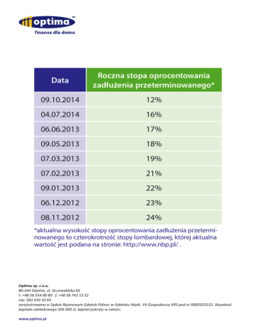 Data Roczna stopa oprocentowania zadłużenia przeterminowanego* 09.10.2014 12% 04.07.2014 16% 06.06.2013 17% 09.05.2013 18% 07.03.2013 19% 07.02.2013 21% 09.01.2013 22% 06.12.2012 23% 08.11.2012 24% *aktualna wysokość stopy oprocentowania zadłużenia przeterminowanego to czterokrotność stopy lombardowej, której aktualna wartość jest podana na stronie: http://www.nbp.pl/ . Optima sp. z o.o. 80-244 Gdańsk, ul. Grunwaldzka 82 t: +48 58 554 80 80 f: +48 58 742 13 52 nip: 583 310 10 93 zarejestrowana w Sądzie Rejonowym Gdańsk-Północ w Gdańsku Wydz. VII Gospodarczy KRS pod nr 0000355315. Wysokość kapitału zakładowego 505.000 zł, kapitał pokryty w całości. www.optima.pl
