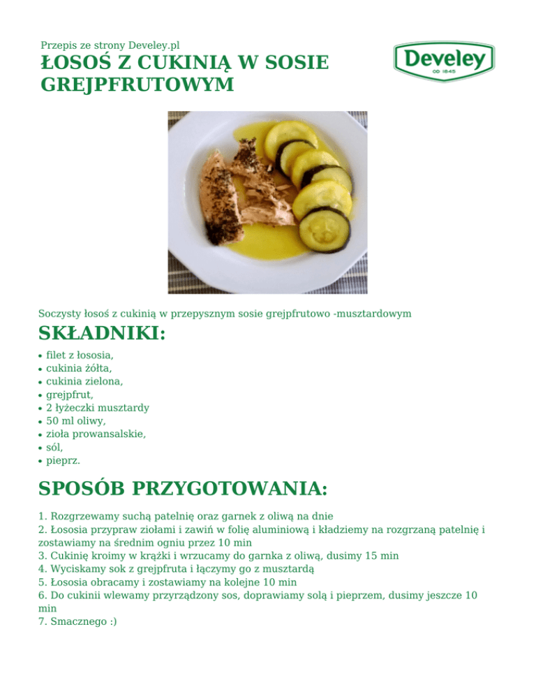 Przepis ze strony Develey.pl ŁOSOŚ Z CUKINIĄ W SOSIE GREJPFRUTOWYM Soczysty łosoś z cukinią w przepysznym sosie grejpfrutowo -musztardowym SKŁADNIKI: ● ● ● ● ● ● ● ● ● filet z łososia, cukinia żółta, cukinia zielona, grejpfrut, 2 łyżeczki musztardy 50 ml oliwy, zioła prowansalskie, sól, pieprz. SPOSÓB PRZYGOTOWANIA: 1. Rozgrzewamy suchą patelnię oraz garnek z oliwą na dnie 2. Łososia przypraw ziołami i zawiń w folię aluminiową i kładziemy na rozgrzaną patelnię i zostawiamy na średnim ogniu przez 10 min 3. Cukinię kroimy w krążki i wrzucamy do garnka z oliwą, dusimy 15 min 4. Wyciskamy sok z grejpfruta i łączymy go z musztardą 5. Łososia obracamy i zostawiamy na kolejne 10 min 6. Do cukinii wlewamy przyrządzony sos, doprawiamy solą i pieprzem, dusimy jeszcze 10 min 7. Smacznego :)