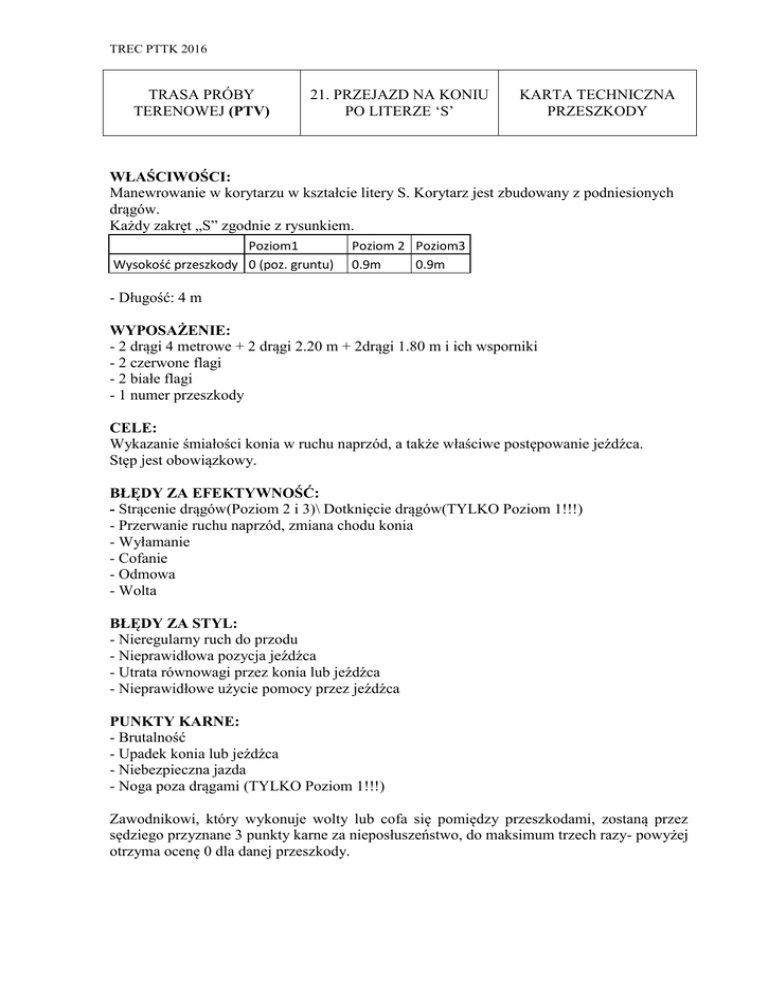 TREC PTTK 2016 TRASA PRÓBY TERENOWEJ (PTV) 21. PRZEJAZD NA KONIU PO LITERZE ‘S’ KARTA TECHNICZNA PRZESZKODY WŁAŚCIWOŚCI: Manewrowanie w korytarzu w kształcie litery S. Korytarz jest zbudowany z podniesionych drągów. Każdy zakręt „S” zgodnie z rysunkiem. Poziom1 Wysokość przeszkody 0 (poz. gruntu) Poziom 2 Poziom3 0.9m 0.9m - Długość: 4 m WYPOSAŻENIE: - 2 drągi 4 metrowe + 2 drągi 2.20 m + 2drągi 1.80 m i ich wsporniki - 2 czerwone flagi - 2 białe flagi - 1 numer przeszkody CELE: Wykazanie śmiałości konia w ruchu naprzód, a także właściwe postępowanie jeźdźca. Stęp jest obowiązkowy. BŁĘDY ZA EFEKTYWNOŚĆ: - Strącenie drągów(Poziom 2 i 3)\ Dotknięcie drągów(TYLKO Poziom 1!!!) - Przerwanie ruchu naprzód, zmiana chodu konia - Wyłamanie - Cofanie - Odmowa - Wolta BŁĘDY ZA STYL: - Nieregularny ruch do przodu - Nieprawidłowa pozycja jeźdźca - Utrata równowagi przez konia lub jeźdźca - Nieprawidłowe użycie pomocy przez jeźdźca PUNKTY KARNE: - Brutalność - Upadek konia lub jeźdźca - Niebezpieczna jazda - Noga poza drągami (TYLKO Poziom 1!!!) Zawodnikowi, który wykonuje wolty lub cofa się pomiędzy przeszkodami, zostaną przez sędziego przyznane 3 punkty karne za nieposłuszeństwo, do maksimum trzech razy- powyżej otrzyma ocenę 0 dla danej przeszkody. TREC PTTK 2016 KARTA OCENY PRZESZKODY PRZEJAZD NA KONIU PO LITERZE ‘S’ NR PRZESZKODY………… SĘDZIA…………………… NR STAR T. E S P RAZEM + - = Uwagi: SCHEMAT OCENIANIA : E+S-P EFEKTYWNOŚĆ E STYL S PKT.KARNE P Poprawna 7 bardzo dobry +3 Brutalność -3 1 błąd 4 dobry +2 Niebezpieczna metoda -3 2 błąd 1 prawie dobry +1 Upadek 0 3 błąd 0 przeciętny Noga poza drągami (TYLKO Poziom 1!) 0 0 słaby -1 zły -2 Punktacja 0 za efektywność lub za punkty karne oznacza całkowitą ocenę 0 za daną przeszkodę 7 = 0 błędów za efektywność: żaden drag nie strącony\dotknięty, brak przerwania ruchu naprzód, brak wyłamania, brak cofania, brak odmowy, brak wolty, brak zmiany chodu 4 = 1 błąd: 1 –strącony drąg\dotknięty drąg, 1- przerwanie ruchu naprzód, 1-wyłamanie, etc. 1 = 2 błąd: 2 –strącony drąg\dotknięty drąg , 2- przerwanie ruchu naprzód, etc. 0 = 3 błąd: etc. Te oceny należy wpisać w kratkę E w karcie oceny