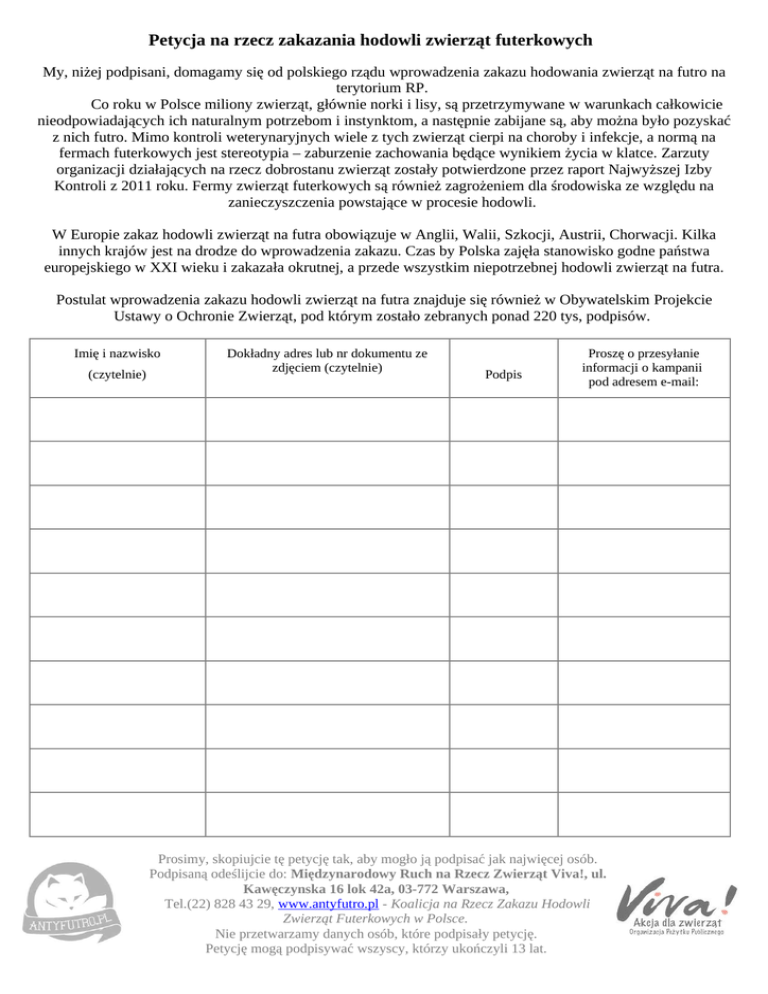 Petycja na rzecz zakazania hodowli zwierząt futerkowych My, niżej podpisani, domagamy się od polskiego rządu wprowadzenia zakazu hodowania zwierząt na futro na terytorium RP. Co roku w Polsce miliony zwierząt, głównie norki i lisy, są przetrzymywane w warunkach całkowicie nieodpowiadających ich naturalnym potrzebom i instynktom, a następnie zabijane są, aby można było pozyskać z nich futro. Mimo kontroli weterynaryjnych wiele z tych zwierząt cierpi na choroby i infekcje, a normą na fermach futerkowych jest stereotypia – zaburzenie zachowania będące wynikiem życia w klatce. Zarzuty organizacji działających na rzecz dobrostanu zwierząt zostały potwierdzone przez raport Najwyższej Izby Kontroli z 2011 roku. Fermy zwierząt futerkowych są również zagrożeniem dla środowiska ze względu na zanieczyszczenia powstające w procesie hodowli. W Europie zakaz hodowli zwierząt na futra obowiązuje w Anglii, Walii, Szkocji, Austrii, Chorwacji. Kilka innych krajów jest na drodze do wprowadzenia zakazu. Czas by Polska zajęła stanowisko godne państwa europejskiego w XXI wieku i zakazała okrutnej, a przede wszystkim niepotrzebnej hodowli zwierząt na futra. Postulat wprowadzenia zakazu hodowli zwierząt na futra znajduje się również w Obywatelskim Projekcie Ustawy o Ochronie Zwierząt, pod którym zostało zebranych ponad 220 tys, podpisów. Imię i nazwisko (czytelnie) Dokładny adres lub nr dokumentu ze zdjęciem (czytelnie) Podpis Proszę o przesyłanie informacji o kampanii pod adresem e-mail: Prosimy, skopiujcie tę petycję tak, aby mogło ją podpisać jak najwięcej osób. Podpisaną odeślijcie do: Międzynarodowy Ruch na Rzecz Zwierząt Viva!, ul. Kawęczynska 16 lok 42a, 03-772 Warszawa, Tel.(22) 828 43 29, www.antyfutro.pl - Koalicja na Rzecz Zakazu Hodowli Zwierząt Futerkowych w Polsce. Nie przetwarzamy danych osób, które podpisały petycję. Petycję mogą podpisywać wszyscy, którzy ukończyli 13 lat.