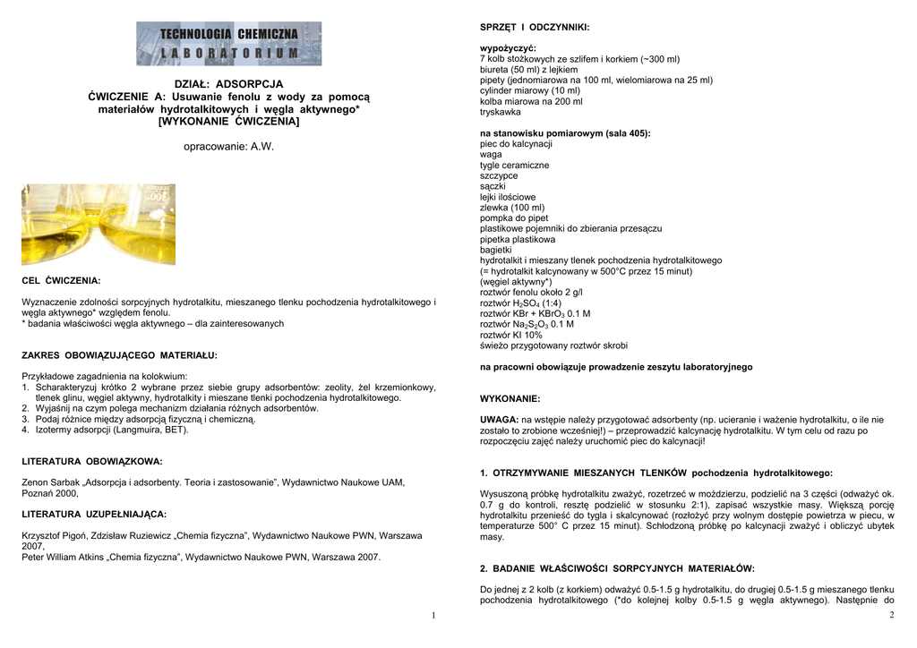 SPRZĘT I ODCZYNNIKI: wypożyczyć: 7 kolb stożkowych ze szlifem i korkiem (~300 ml) biureta (50 ml) z lejkiem pipety (jednomiarowa na 100 ml, wielomiarowa na 25 ml) cylinder miarowy (10 ml) kolba miarowa na 200 ml tryskawka DZIAŁ: ADSORPCJA ĆWICZENIE A: Usuwanie fenolu z wody za pomocą materiałów hydrotalkitowych i węgla aktywnego* [WYKONANIE ĆWICZENIA] opracowanie: A.W. CEL ĆWICZENIA: Wyznaczenie zdolności sorpcyjnych hydrotalkitu, mieszanego tlenku pochodzenia hydrotalkitowego i węgla aktywnego* względem fenolu. * badania właściwości węgla aktywnego – dla zainteresowanych ZAKRES OBOWIĄZUJĄCEGO MATERIAŁU: Przykładowe zagadnienia na kolokwium: 1. Scharakteryzuj krótko 2 wybrane przez siebie grupy adsorbentów: zeolity, żel krzemionkowy, tlenek glinu, węgiel aktywny, hydrotalkity i mieszane tlenki pochodzenia hydrotalkitowego. 2. Wyjaśnij na czym polega mechanizm działania różnych adsorbentów. 3. Podaj różnice między adsorpcją fizyczną i chemiczną. 4. Izotermy adsorpcji (Langmuira, BET). na stanowisku pomiarowym (sala 405): piec do kalcynacji waga tygle ceramiczne szczypce sączki lejki ilościowe zlewka (100 ml) pompka do pipet plastikowe pojemniki do zbierania przesączu pipetka plastikowa bagietki hydrotalkit i mieszany tlenek pochodzenia hydrotalkitowego (= hydrotalkit kalcynowany w 500°C przez 15 minut) (węgiel aktywny*) roztwór fenolu około 2 g/l roztwór H2SO4 (1:4) roztwór KBr + KBrO3 0.1 M roztwór Na2S2O3 0.1 M roztwór KI 10% świeżo przygotowany roztwór skrobi na pracowni obowiązuje prowadzenie zeszytu laboratoryjnego WYKONANIE: UWAGA: na wstępie należy przygotować adsorbenty (np. ucieranie i ważenie hydrotalkitu, o ile nie zostało to zrobione wcześniej!) – przeprowadzić kalcynację hydrotalkitu. W tym celu od razu po rozpoczęciu zajęć należy uruchomić piec do kalcynacji! LITERATURA OBOWIĄZKOWA: 1. OTRZYMYWANIE MIESZANYCH TLENKÓW pochodzenia hydrotalkitowego: Zenon Sarbak „Adsorpcja i adsorbenty. Teoria i zastosowanie”, Wydawnictwo Naukowe UAM, Poznań 2000, Wysuszoną próbkę hydrotalkitu zważyć, rozetrzeć w moździerzu, podzielić na 3 części (odważyć ok. 0.7 g do kontroli, resztę podzielić w stosunku 2:1), zapisać wszystkie masy. Większą porcję hydrotalkitu przenieść do tygla i skalcynować (rozłożyć przy wolnym dostępie powietrza w piecu, w temperaturze 500° C przez 15 minut). Schłodzoną próbkę po kalcynacji zważyć i obliczyć ubytek masy. LITERATURA UZUPEŁNIAJĄCA: Krzysztof Pigoń, Zdzisław Ruziewicz „Chemia fizyczna”, Wydawnictwo Naukowe PWN, Warszawa 2007, Peter William Atkins „Chemia fizyczna”, Wydawnictwo Naukowe PWN, Warszawa 2007. 2. BADANIE WŁAŚCIWOŚCI SORPCYJNYCH MATERIAŁÓW: Do jednej z 2 kolb (z korkiem) odważyć 0.5-1.5 g hydrotalkitu, do drugiej 0.5-1.5 g mieszanego tlenku pochodzenia hydrotalkitowego (*do kolejnej kolby 0.5-1.5 g węgla aktywnego). Następnie do 1 2 wszystkich kolb dodać (pipetą!) 50-150 ml roztworu fenolu o stężeniu około 2 g/l. Zamknięte kolby pozostawić w temperaturze pokojowej (około 20°C) na 30 minut. Zawiesinę należy regularnie wytrząsać. Po upływie odpowiedniego czasu zawiesinę przesączyć a z przesączu pobrać po 10-15 ml do oznaczenia zawartości fenolu. Oznaczenie wykonać metodą bromometryczną. Do oznaczenia przygotować także próbę ślepą (woda destylowana) oraz próbkę wyjściowego roztworu fenolu. Dla próbek przesączu i wyjściowego roztworu fenolu wykonać przynajmniej po 2 powtórzenia oznaczenia. Obliczyć zawartość fenolu w pobranej do analizy próbce ze wzoru: ( c 1 v 1 c 2 v 2 ) 94.11 m= [ g] 6000 gdzie: c1 – stężenie roztworu KBr + KBrO3 [mol/l] v1 – dodana objętość roztworu KBr + KBrO3 [ml] c2 – stężenie roztworu Na2S2O3 [mol/l] v2 – objętość roztworu Na2S2O3 zużyta do miareczkowania [ml] 94.11 – masa molowa fenolu [g/mol] ZASADY BEZPIECZEŃSTWA, ODPADY: Należy zachować ostrożność przy pracy z odczynnikami. W czasie ćwiczeń obowiązuje odzież ochronna i okulary. OPRACOWANIE WYNIKÓW: 1. obliczyć zawartość fenolu (m) w próbce pobranej do analizy: m = j.w. [g] 2. obliczyć procentowy ubytek fenolu (R) dla każdego z eksperymentów: c − ce R= 0 ⋅ 100% gdzie: c0 – stężenie początkowe fenolu, c0 ce – stężenie równowagowe fenolu, rys. 1. Schemat wyznaczania właściwości sorpcyjnych. 3. obliczyć ilość fenolu (wyrażoną w mol i mg) zaadsorbowaną przez jednostkę masy adsorbenta, 3. OZNACZENIE FENOLU: Próbki przesączu o objętości 15 ml przenieść do kolb ze szlifem. Dodać dokładnie odmierzoną (pipeta!) objętość roztworu KBr + KBrO3 – 25 ml. W celu zapewnienia odpowiednich warunków reakcji dodać 10 ml (cylinder miarowy!) roztworu H2SO4. Mieszaninę pozostawić w ciemnym miejscu na 20 minut. UWAGA: po upływie około 5 minut sprawdzić, czy roztwór zabarwiony jest na pomarańczowo i czy stącił się tribromofenol. Przygotować świeży roztwór skrobi: odważyć ok. 0.2 g skrobi, rozpuścić w 2 ml zimnej wody destylowanej, a następnie dodać 16 ml wrzącej wody destylowanej. W razie konieczności całość podgrzać. Po upływie 20 minut do mieszaniny dodać 10 ml roztworu KI odmierzone cylindrem. UWAGA: dodawanie należy przeprowadzić szybko i sprawnie, żeby zapobiec ulatnianiu się bromu. Po upływie 10 minut przeprowadzić miareczkowanie za pomocą roztworu tiosiarczanu w obecności skrobi jako wskaźnika. UWAGA: skrobię należy dodać blisko punktu końcowego miareczkowania, czyli wtedy gdy roztwór ma kolor lekko żółty. 3 4. przyjmując powierzchnię zajmowaną przez 1 cząsteczkę fenolu równą 52.2 Å2, obliczyć powierzchnię zajmowaną przez adsorbat dla kolejnych próbek. Ocenić właściwości sorpcyjne badanych materiałów. Zaproponować mechanizm, według którego adsorpcja może zachodzić na badanych materiałach. Do zebrania wyników i przygotowania sprawozdania bezpośrednio na laboratorium wykorzysta