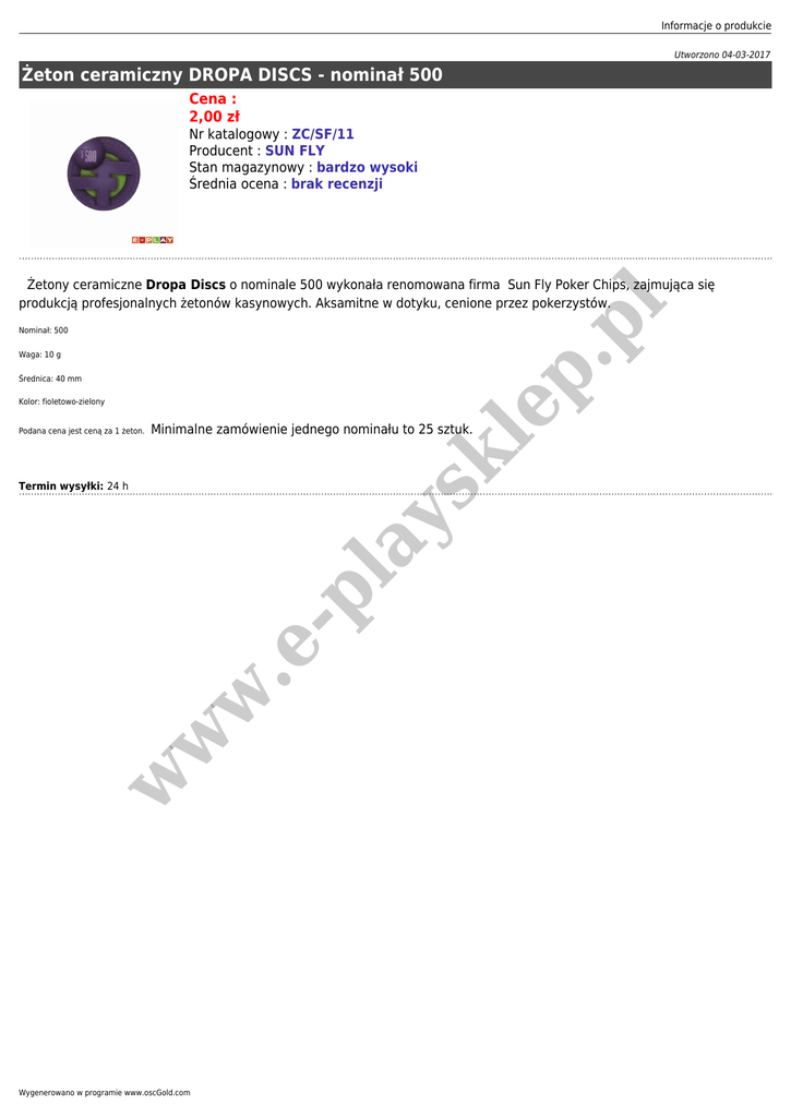 Informacje o produkcie Utworzono 04-03-2017 Żeton ceramiczny DROPA DISCS - nominał 500 Cena : 2,00 zł Nr katalogowy : ZC/SF/11 Producent : SUN FLY Stan magazynowy : bardzo wysoki Średnia ocena : brak recenzji p. pl Żetony ceramiczne Dropa Discs o nominale 500 wykonała renomowana firma Sun Fly Poker Chips, zajmująca się produkcją profesjonalnych żetonów kasynowych. Aksamitne w dotyku, cenione przez pokerzystów. Nominał: 500 Waga: 10 g Średnica: 40 mm Podana cena jest ceną za 1 żeton. ay sk le Kolor: fioletowo-zielony Minimalne zamówienie jednego nominału to 25 sztuk. w w w .e - pl Termin wysyłki: 24 h Wygenerowano w programie www.oscGold.com