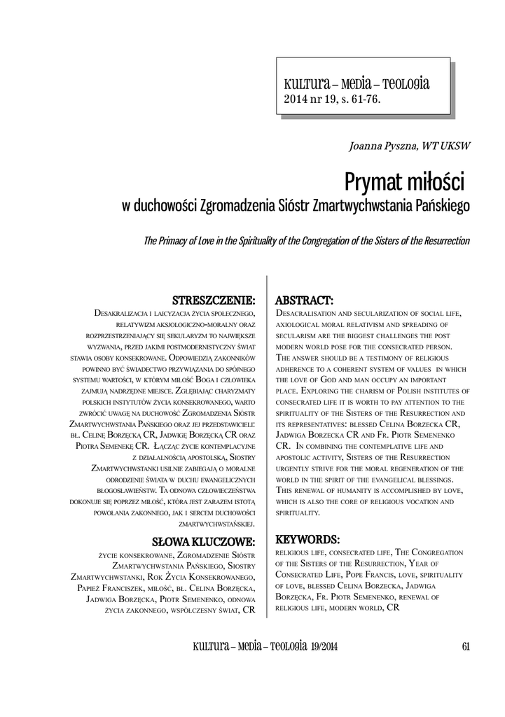 Kultura – Media – Teologia 2014 nr 19, s. 61-76. Joanna Pyszna, WT UKSW Prymat miłości w duchowości Zgromadzenia Sióstr Zmartwychwstania Pańskiego The Primacy of Love in the Spirituality of the Congregation of the Sisters of the Resurrection STRESZCZENIE: DESAKRALIZACJA I LAICYZACJA ŻYCIA SPOŁECZNEGO, RELATYWIZM AKSJOLOGICZNO-MORALNY ORAZ ABSTRACT: DESACRALISATION AND SECULARIZATION OF SOCIAL LIFE, AXIOLOGICAL MORAL RELATIVISM AND SPREADING OF ROZPRZESTRZENIAJĄCY SIĘ SEKULARYZM TO NAJWIĘKSZE SECULARISM ARE THE BIGGEST CHALLENGES THE POST WYZWANIA, PRZED JAKIMI POSTMODERNISTYCZNY ŚWIAT MODERN WORLD POSE FOR THE CONSECRATED PERSON. STAWIA OSOBY KONSEKROWANE. ODPOWIEDZIĄ ZAKONNIKÓW POWINNO BYĆ ŚWIADECTWO PRZYWIĄZANIA DO SPÓJNEGO SYSTEMU WARTOŚCI, W KTÓRYM MIŁOŚĆ BOGA I CZŁOWIEKA THE ANSWER SHOULD BE A TESTIMONY OF RELIGIOUS ADHERENCE TO A COHERENT SYSTEM OF VALUES IN WHICH GOD AND MAN OCCUPY AN IMPORTANT EXPLORING THE CHARISM OF POLISH INSTITUTES OF THE LOVE OF ZAJMUJĄ NADRZĘDNE MIEJSCE. ZGŁĘBIAJĄC CHARYZMATY PLACE. POLSKICH INSTYTUTÓW ŻYCIA KONSEKROWANEGO, WARTO CONSECRATED LIFE IT IS WORTH TO PAY ATTENTION TO THE ZWRÓCIĆ UWAGĘ NA DUCHOWOŚĆ ZGROMADZENIA SIÓSTR ZMARTWYCHWSTANIA PAŃSKIEGO ORAZ JEJ PRZEDSTAWICIELI: BŁ. CELINĘ BORZĘCKĄ CR, JADWIGĘ BORZĘCKĄ CR ORAZ PIOTRA SEMENEKĘ CR. ŁĄCZĄC ŻYCIE KONTEMPLACYJNE Z DZIAŁALNOŚCIĄ APOSTOLSKĄ, SIOSTRY ZMARTWYCHWSTANKI USILNIE ZABIEGAJĄ O MORALNE ODRODZENIE ŚWIATA W DUCHU EWANGELICZNYCH BŁOGOSŁAWIEŃSTW. TA ODNOWA CZŁOWIECZEŃSTWA DOKONUJE SIĘ POPRZEZ MIŁOŚĆ, KTÓRA JEST ZARAZEM ISTOTĄ POWOŁANIA ZAKONNEGO, JAK I SERCEM DUCHOWOŚCI SISTERS OF THE RESURRECTION AND CELINA BORZECKA CR, JADWIGA BORZECKA CR AND FR. PIOTR SEMENENKO CR. IN COMBINING THE CONTEMPLATIVE LIFE AND APOSTOLIC ACTIVITY, SISTERS OF THE RESURRECTION SPIRITUALITY OF THE ITS REPRESENTATIVES: BLESSED URGENTLY STRIVE FOR THE MORAL REGENERATION OF THE WORLD IN THE SPIRIT OF THE EVANGELICAL BLESSINGS. THIS RENEWAL OF HUMANITY IS ACCOMPLISHED BY LOVE, WHICH IS ALSO THE CORE OF RELIGIOUS VOCATION AND SPIRITUALITY. ZMARTWYCHWSTAŃSKIEJ. SŁOWA KLUCZOWE: ŻYCIE KONSEKROWANE, ZGROMADZENIE SIÓSTR ZMARTWYCHWSTANIA PAŃSKIEGO, SIOSTRY ZMARTWYCHWSTANKI, ROK ŻYCIA KONSEKROWANEGO, PAPIEŻ FRANCISZEK, MIŁOŚĆ, BŁ. CELINA BORZĘCKA, JADWIGA BORZĘCKA, PIOTR SEMENENKO, ODNOWA ŻYCIA ZAKONNEGO, WSPÓŁCZESNY ŚWIAT, CR KEYWORDS: RELIGIOUS LIFE, CONSECRATED LIFE, THE CONGREGATION SISTERS OF THE RESURRECTION, YEAR OF CONSECRATED LIFE, POPE FRANCIS, LOVE, SPIRITUALITY OF LOVE, BLESSED CELINA BORZECKA, JADWIGA BORZĘCKA, FR. PIOTR SEMENENKO, RENEWAL OF RELIGIOUS LIFE, MODERN WORLD, CR OF THE Kultura – Media – Teologia 19/2014 61 IMPLIKACJE TEOLOGICZNE W listopadzie 2014 r. rozpoczął się zapowiedziany przez Papieża Franciszka Rok Życia Konsekrowanego. Zbiegł się on z pięćdziesiątą rocznicą opublikowania soborowego dekretu o przystosowanej odnowie życia zakonnego „Perfectae caritatis”. Ojciec Święty zachęca tym samym do odnowienia życia konse krowanego i przywrócenia mu dawnego dynamizmu, poprzez miłość, przyjaźń i jedność z Bogiem1. Za następcą św. Piotra cała Stolica Apostolska wzywa osoby poświę cone szczególnej służbie Bożej do radosnego dawania świadectwa o sensie praktykowania rad ewangelicznych. „Oby ten Rok – zwrócił się do zakonnic i zakonników prefekt Kongregacji ds. Instytutów Życia Konsekrowanego i Stowarzyszeń Życia Apostolskiego kard. Joao Braz de Aviz – był czasem »ewangelizowania« własnego powołania i świadczenia o pięknie drogi, jaką jest sequela Christi w swych różnorakich formach”2. W myśl wskazań Papieża Franciszka przygotowanie do przeżywania obchodów Roku Życia Konsekrowanego powinno obejmować pogłębianie znajomości duchowości zakonnej oraz charyzmatów instytutów życia konsekrowanego. Odpowiedzią na papieskie wezwanie może być podjęcie tematu duchowości polskich zgromadzeń zakonnych powstałych w II połowie XIX wieku, wśród których wyróżnić można Zgromadzenie Sióstr Zmartwychwstania Pana Naszego Jezusa Chrystusa3. W dobie kryzysu życia zakonnego należałoby przypomnieć najbardziej istotny element związany ze ślubowaniem rad ewangelicznych, jakim jest miłość. Ojciec Święty wielokrotnie podkreślał znaczenie miłości w życiu konsekrowanym, określanym przezeń jako ciągły proces dojrzewania do miłości prawdziwie macierzyńskiej i ojcowskiej4. 1 2 3 4 62 http://pl.radiovaticana.va/news/2014/01/31/prezentacja_roku_%C5%BCycia_konsekrowanego,_rozpocznie_si% C4%99_wcze%C5%9Bniej_/pol-769156 (dostęp: 03.08.2014 r.). http://www.zakony-zenskie.pl/index.phpaktualnoci/127-aktualnoci-2014/762-rok-ycia-konsekrowanego (dostęp: 08.03.2014 r.). Zgromadzenie Sióstr Zmartwychwstania Pana Naszego Jezusa Chrystusa powstało w Rzymie w dniu 6 stycznia 1891 r.. Zostało założone przez dwie Polki, Celinę Borzęcką i jej córkę Jadwigę. Powołaniem Zgromadzenia jest wielbienie Boga, który jest Miłością, i głoszenia światu prawdy o Jego miłości do każdego człowieka przez uczestnictwo w Paschalnym Misterium Zbawienia. Siostry odwzajemniają tę miłość idąc z Chrystusem, zgodnie z hasłem Zgromadzenia: „przez krzyż i śmierć do zmartwychwstania i chwały”. Siostry Zmartwychwstania Pańskiego dzielą się dobrem wynikającym z otrzymanego charyzmatu, łącząc życie kontemplacyjne z działalnością apostolską. Starają się o religijne i moralne odrodzenie świata w duchu ewangelicznych błogosławieństw. Otwierają się na potrzeby bliźnich, posługując jako nauczycielki, wykładowczynie, wychowawczynie, przewodniczki duchowe, misjonarki, animatorki, rekolekcjonistki, katechetki, pielęgniarki, opiekunki dzieci, chorych, starszych i potrzebujących. Aktualnie Siostry pełnią swoją misję w Polsce, we Włoszech, w Stanach Zjednoczonych, Kanadzie, Wielkiej Brytanii, Australii, Argentynie, na Bia