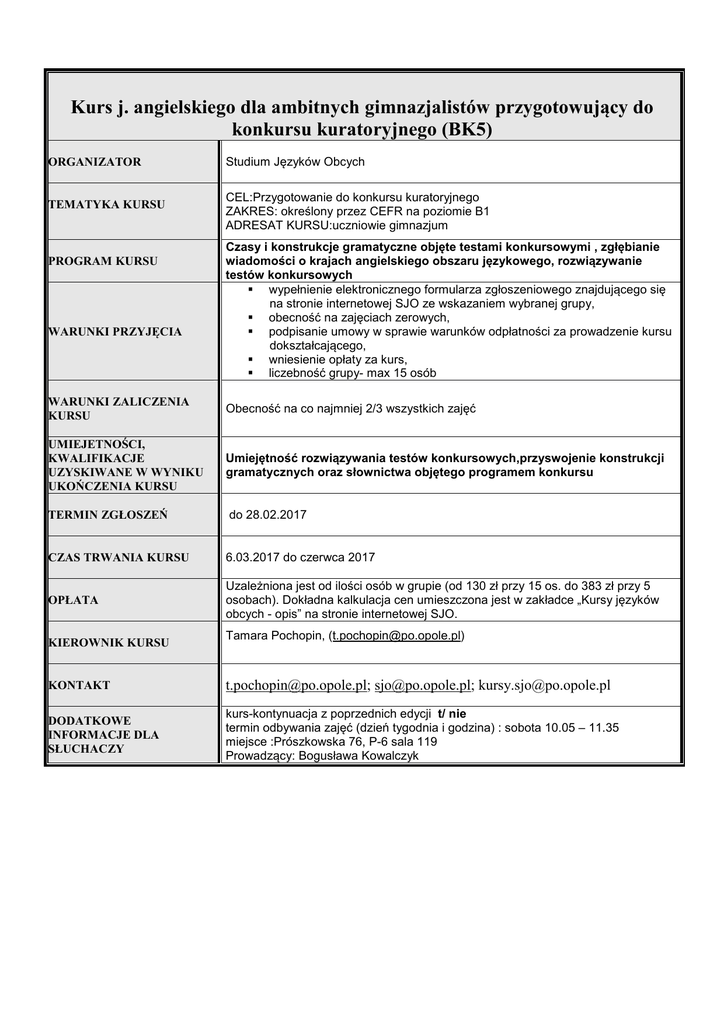 Kurs j. angielskiego dla ambitnych gimnazjalistów przygotowujący do konkursu kuratoryjnego (BK5) ORGANIZATOR TEMATYKA KURSU PROGRAM KURSU WARUNKI PRZYJĘCIA Studium Języków Obcych CEL:Przygotowanie do konkursu kuratoryjnego ZAKRES: określony przez CEFR na poziomie B1 ADRESAT KURSU:uczniowie gimnazjum Czasy i konstrukcje gramatyczne objęte testami konkursowymi , zgłębianie wiadomości o krajach angielskiego obszaru językowego, rozwiązywanie testów konkursowych wypełnienie elektronicznego formularza zgłoszeniowego znajdującego się na stronie internetowej SJO ze wskazaniem wybranej grupy, obecność na zajęciach zerowych, podpisanie umowy w sprawie warunków odpłatności za prowadzenie kursu dokształcającego, wniesienie opłaty za kurs, liczebność grupy- max 15 osób WARUNKI ZALICZENIA KURSU Obecność na co najmniej 2/3 wszystkich zajęć UMIEJETNOŚCI, KWALIFIKACJE UZYSKIWANE W WYNIKU UKOŃCZENIA KURSU Umiejętność rozwiązywania testów konkursowych,przyswojenie konstrukcji gramatycznych oraz słownictwa objętego programem konkursu TERMIN ZGŁOSZEŃ do 28.02.2017 CZAS TRWANIA KURSU 6.03.2017 do czerwca 2017 OPŁATA Uzależniona jest od ilości osób w grupie (od 130 zł przy 15 os. do 383 zł przy 5 osobach). Dokładna kalkulacja cen umieszczona jest w zakładce „Kursy języków obcych - opis” na stronie internetowej SJO. KIEROWNIK KURSU Tamara Pochopin, ([email protected]) KONTAKT [email protected]; [email protected]; [email protected] DODATKOWE INFORMACJE DLA SŁUCHACZY kurs-kontynuacja z poprzednich edycji t/ nie termin odbywania zajęć (dzień tygodnia i godzina) : sobota 10.05 – 11.35 miejsce :Prószkowska 76, P-6 sala 119 Prowadzący: Bogusława Kowalczyk