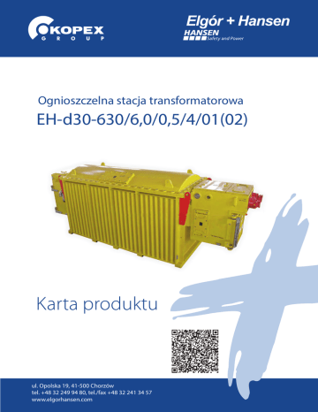Ognioszczelna stacja transformatorowa EH-d30-630/6,0/0,5/4/01(02) Karta produktu ul. Opolska 19, 41-500 Chorzów tel. +48 32 249 94 80, tel./fax +48 32 241 34 57 www.elgorhansen.com CECHY CHARAKTERYSTYCZNE Stacja transformatorowa typu EH-d30-630/6,0/0,5/4/01 (EH-d30-630/6,0/0,5/4/02) jest elektrycznym urządzeniem zasilającym w wykonaniu przeciwwybuchowym i zgodnie z polskimi przepisami wykonawczymi Prawa Geologicznego i Górniczego może być instalowana w podziemnych wyrobiskach górniczych kopalń niemetanowych i metanowych ze stopniem zagrożenia metanowego „a”, „b”, „c” oraz w wyrobiskach klasy „A” i „B” zagrożenia wybuchem pyłu węglowego. Konstrukcja opracowana została zgodnie z wymaganiami dyrektywy 94/9/WE (ATEX). Certyfikat zgodności predestynuje stosowanie stacji w pomieszczeniach z atmosferą wybuchową grupy I kategorii M2. Zastosowane zabezpieczenia elektroenergetyczne oraz przyjęty system sterowania i współpracy z blokadami technologicznymi z wykorzystaniem obwodów iskrobezpiecznych, pozwalają na bezpieczną współpracę z urządzeniami zasilającymi maszyny górnicze. Stacja transformatorowa przystosowana jest do podłączenia układu transmisji danych umożliwiającego odczyt informacji technologicznych i ich przesył na powierzchnię kopalni (np. do dyspozytora). Układ transmisji danych umożliwia między innymi przesył informacji na temat wartości prądów i napięć odpływów oraz informacji o stanach zakłóceniowych. Ognioszczelna stacja transformatorowa wyposażona jest także w wewnętrzny układ transmisji danych, za pomocą którego informacje o aktualnym stanie pracy podzespołów stacji transformatorowej, są przesyłane magistralą cyfrową oraz wizualizowane na jego wyświetlaczu. Na wyświetlaczu można obserwować parametry pracy stacji transformatorowej, stan zabezpieczeń i przekaźników oraz wartości mierzonych wielkości elektrycznych. BUDOWA Stacja transformatorowa składa się z trzech zasadniczych segmentów budowy ognioszczelnej: • g órnego napięcia, z trzema ognioszczelnymi przedziałami wyposażonymi w odłącznik izolacyjny; zabezpieczenie nadmiarowoprądowe oraz łącznik główny i przyłączowy • t ransformatora, w której umieszczono transformator suchy, • d olnego napięcia z dwoma komorami ognioszczelnymi wyposażonymi w uziemnik szybki, obwody kontroli i sterowania, zabezpieczenia upływowe oraz nadmiarowo-prądowe oraz przyłączowy Segmenty są bezpośrednio ze sobą połączone przy pomocy ognioszczelnych złączy kołnierzowych, a ich współpraca zapewnia prawidłowe działanie w układzie stacji transformatorowej. Budowa segmentowa stacji z podziałem na komory i przedziały ognioszczelne połączone z sobą zapewnia: • s eparację ogólnokopalnianej sieci rozdzielczej z instalacjami oddziałowymi, • z asilanie odbiorników w kopalnianych instalacjach oddziałowych, • o chronę od skutków zwarć i przeciążeń po stronie górnego i dolnego napięcia, • o chronę od skutków pracy przy obniżonym stanie izolacji po stronie dolnego napięcia. Stacja transformatorowa może być instalowana w pomieszczeniach przewietrzanych prądem powietrza odprowadzanego do szybu wydechowego lub w pomieszczeniach z wentylacją odrębną. Stacja jest przystosowana do transportu kołowego (po szynach) lub z wykorzystaniem kolejki podwieszanej. Do podwieszania na kolejce służą uchwyty transportowe stacji wyróżnione kolorem czerwonym oraz specjalne strzemiona, które nie są standardowym wyposażeniem stacji. OPIS DZIAŁANIA Stacja transformatorowa wyposażona jest w cztery odpływy po stronie DN, które zapewniają zasilanie odbiorników napięciem 500V. Każdy z odpływów wyposaony jest w zabezpieczenie nadmiarowo-prądowe, chroniące od skutków zwarcia, przeciążenia i asymetrii obciążeń. Ochrona od skutków pracy przy obniżonej i/lub uszkodzonej izolacji zasilanej instalacji realizowana przez zabezpieczenie upływowe - blokujące i centralne. Łącznik po stronie GN, na który działają wszystkie zabezpieczenia stacji, załącza transformator główny. Odłącznik izolacyjny po stronie GN pozwala na uzyskanie widocznej bezpiecznej przerwy izolacyjnej. W takim położeniu odłącznika, dzięki zastosowaniu blokady, istnieje możliwość otwarcia przedziałów aparaturowych w stanie beznapięciowym. www.elgorhansen.com Ognioszczelna stacja transformatorowa EH-d30-630/6,0/0,5/4/01(02) DANE TECHNICZNE Moc znamionowa 630kVA Napięcie znamionowe: pierwotne 6000V wtórne 525V Zakres regulacji przekładni (w stanie beznapięciowym) ± 5% Prąd znamionowy: pierwotny 60,6A wtórny 692,8A Grupa połączeń Dyn5 (Yyn0) Napięcie zwarcia 4,5% Straty biegu jałowego 1800W Straty obciążeniowe 4200W Częstotliwość znamionowa 50Hz Chłodzenie AN Zwarciowa zdolność łączenia (6kV) 10 kA, cosφ=0,2 Klasa izolacji transformatora H Maksymalna temperatura otoczenia + 40° C Ilość odpływów 4 Prąd ciągły pojedynczego odpływu ≤400A Masa bez zestawu kołowego ~6000kg z zestawem kołowym ~6500kg Prześwit zestawu kołowego 130 mm SCHEMAT URZĄDZENIA P23 500V V Q21 K22 A F23.1 F24.2 T Q11 6kV 500V F24.1 K11 lub A F23 .2 F12 T12 F11 500V A F23.3 Q11 – odłącznik izolacyjny F24.1 – centralne zabezpieczenie upływowe F12 – wkładka bezpiecznikowa Q21 – uziemnik szybki T12 – transformator potrzeb własnych K22 – łącznik pomocniczy K11 – łącznik strony GN F24.2 – przekaźnik upływowo blokujący F11 – wtórny przekaźnik nadmiarowopradowy F23.1, F23.2, F23.3, F23.4 – przekaźnik nadmiarowoprądowy T – transformator suchy 500V A F23.4 ul. Opolska 19, 41-500 Chorzów tel. +48 32 249 94 80, tel./fax +48 32 241 34 57 www.elgorhansen.com Ognioszczelna stacja transformatorowa EH-d30-630/6,0/0,5/4/01(02) RYSUNEK WYMIAROWY ZNAK DOPUSZCZENIA GX-119/09 CECHA BUDOWY PRZECIWWYBUCHOWEJ I M2 Ex d I 1453 Certyfikat badania typu KDB 09ATEX143X ul. Grabowa 1, 40-172 Katowice tel. +48 32 604