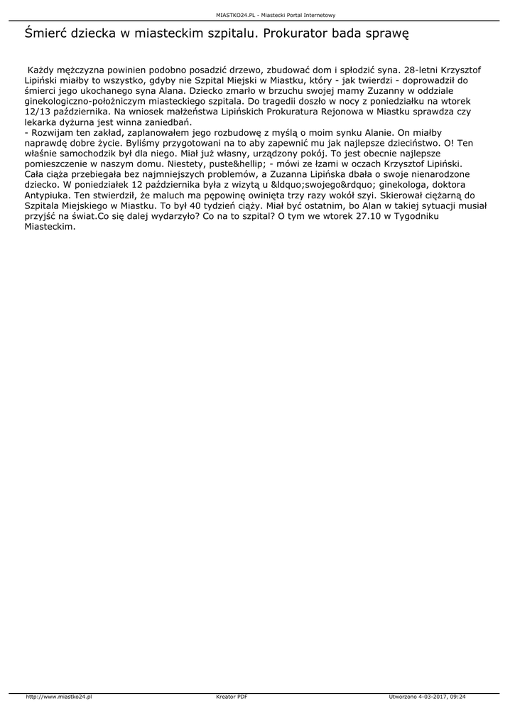 MIASTKO24.PL - Miastecki Portal Internetowy Śmierć dziecka w miasteckim szpitalu. Prokurator bada sprawę Każdy mężczyzna powinien podobno posadzić drzewo, zbudować dom i spłodzić syna. 28-letni Krzysztof Lipiński miałby to wszystko, gdyby nie Szpital Miejski w Miastku, który - jak twierdzi - doprowadził do śmierci jego ukochanego syna Alana. Dziecko zmarło w brzuchu swojej mamy Zuzanny w oddziale ginekologiczno-położniczym miasteckiego szpitala. Do tragedii doszło w nocy z poniedziałku na wtorek 12/13 października. Na wniosek małżeństwa Lipińskich Prokuratura Rejonowa w Miastku sprawdza czy lekarka dyżurna jest winna zaniedbań. - Rozwijam ten zakład, zaplanowałem jego rozbudowę z myślą o moim synku Alanie. On miałby naprawdę dobre życie. Byliśmy przygotowani na to aby zapewnić mu jak najlepsze dzieciństwo. O! Ten właśnie samochodzik był dla niego. Miał już własny, urządzony pokój. To jest obecnie najlepsze pomieszczenie w naszym domu. Niestety, puste… - mówi ze łzami w oczach Krzysztof Lipiński. Cała ciąża przebiegała bez najmniejszych problemów, a Zuzanna Lipińska dbała o swoje nienarodzone dziecko. W poniedziałek 12 października była z wizytą u “swojego” ginekologa, doktora Antypiuka. Ten stwierdził, że maluch ma pępowinę owinięta trzy razy wokół szyi. Skierował ciężarną do Szpitala Miejskiego w Miastku. To był 40 tydzień ciąży. Miał być ostatnim, bo Alan w takiej sytuacji musiał przyjść na świat.Co się dalej wydarzyło? Co na to szpital? O tym we wtorek 27.10 w Tygodniku Miasteckim. http://www.miastko24.pl Kreator PDF Utworzono 4-03-2017, 09:24