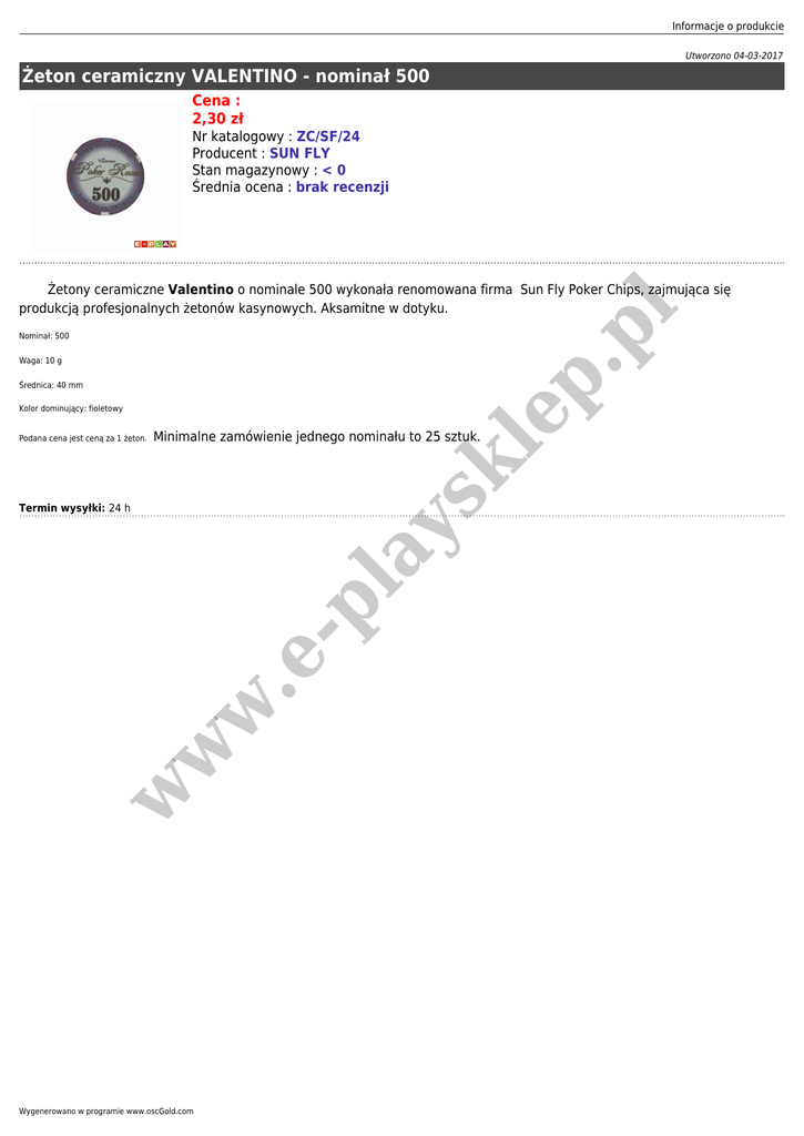 Informacje o produkcie Utworzono 04-03-2017 Żeton ceramiczny VALENTINO - nominał 500 Cena : 2,30 zł Nr katalogowy : ZC/SF/24 Producent : SUN FLY Stan magazynowy : < 0 Średnia ocena : brak recenzji p. pl Żetony ceramiczne Valentino o nominale 500 wykonała renomowana firma Sun Fly Poker Chips, zajmująca się produkcją profesjonalnych żetonów kasynowych. Aksamitne w dotyku. Nominał: 500 Waga: 10 g Średnica: 40 mm Podana cena jest ceną za 1 żeton. ay sk le Kolor dominujący: fioletowy Minimalne zamówienie jednego nominału to 25 sztuk. w w w .e - pl Termin wysyłki: 24 h Wygenerowano w programie www.oscGold.com