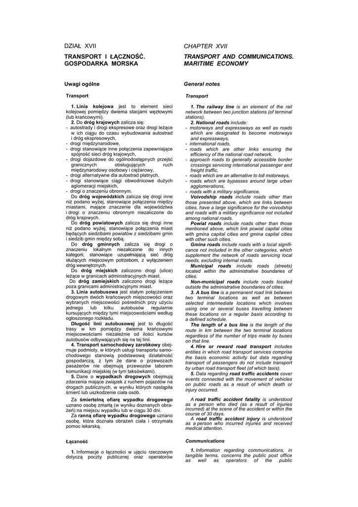 DZIAŁ XVII CHAPTER XVII TRANSPORT I ŁĄCZNOŚĆ. GOSPODARKA MORSKA TRANSPORT AND COMMUNICATIONS. MARITIME ECONOMY Uwagi ogólne General notes Transport Transport 1. Linia kolejowa jest to element sieci kolejowej pomiędzy dwiema stacjami węzłowymi (lub krańcowymi). 2. Do dróg krajowych zalicza się: - autostrady i drogi ekspresowe oraz drogi leżące w ich ciągu do czasu wybudowania autostrad i dróg ekspresowych, - drogi międzynarodowe, - drogi stanowiące inne połączenia zapewniające spójność sieci dróg krajowych, - drogi dojazdowe do ogólnodostępnych przejść granicznych obsługujących ruch międzynarodowy osobowy i ciężarowy, - drogi alternatywne dla autostrad płatnych, - drogi stanowiące ciągi obwodnicowe dużych aglomeracji miejskich, - drogi o znaczeniu obronnym. Do dróg wojewódzkich zalicza się drogi inne niż podano wyżej, stanowiące połączenia między miastami, mające znaczenie dla województwa i drogi o znaczeniu obronnym niezaliczone do dróg krajowych. Do dróg powiatowych zalicza się drogi inne niż podano wyżej, stanowiące połączenia miast będących siedzibami powiatów z siedzibami gmin i siedzib gmin między sobą. Do dróg gminnych zalicza się drogi o znaczeniu lokalnym niezaliczone do innych kategorii, stanowiące uzupełniającą sieć dróg służących miejscowym potrzebom, z wyłączeniem dróg wewnętrznych. Do dróg miejskich zaliczono drogi (ulice) leżące w granicach administracyjnych miast. Do dróg zamiejskich zaliczono drogi leżące poza granicami administracyjnymi miast. 3. Linia autobusowa jest stałym połączeniem drogowym dwóch krańcowych miejscowości oraz wybranych miejscowości pośrednich przy użyciu jednego lub kilku autobusów regularnie kursujących między tymi miejscowościami według ogłoszonego rozkładu. Długość linii autobusowej jest to długość trasy w km pomiędzy dwiema krańcowymi miejscowościami niezależnie od ilości kursów autobusów odbywających się na tej linii. 4. Transport samochodowy zarobkowy obejmuje podmioty, w których usługi transportu samochodowego stanowią podstawową działalność gospodarczą, z tym że dane o przewozach pasażerów nie obejmują przewozów taborem komunikacji miejskiej (w tym taksówkami). 5. Dane o wypadkach drogowych obejmują zdarzenia mające związek z ruchem pojazdów na drogach publicznych, w wyniku których nastąpiła śmierć lub uszkodzenie ciała osób. 1. The railway line is an element of the rail network between two junction stations (of terminal stations). 2. National roads include: - motorways and expressways as well as roads which are designated to become motorways and expressways, - international roads, - roads which are other links ensuring the efficiency of the national road network, - approach roads to generally accessible border crossings servicing international passenger and freight traffic, - roads which are an alternative to toll motorways, - roads which are bypasses around large urban agglomerations, - roads with a military significance. Voivodship roads include roads other than those presented above, which are links between cities, have a large significance for the voivodship and roads with a military significance not included among national roads. Powiat roads include roads other than those mentioned above, which link powiat capital cities with gmina capital cities and gmina capital cities with other such cities. Gmina roads include roads with a local significance not included in the other categories, which supplement the network of roads servicing local needs, excluding internal roads. Municipal roads include roads (streets) located within the administrative boundaries of cities. Non-municipal roads include roads located outside the administrative boundaries of cities. 3. A bus line is a permanent road link between two terminal locations as well as between selected intermediate locations which involves using one or several buses travelling between these locations on a regular basis according to a defined schedule. The length of a bus line is the length of the route in km between the two terminal locations regardless of the number of trips made by buses on that line. 4. Hire or reward road transport includes entities in which road transport services comprise the basis economic activity but data regarding transport of passengers do not include transport by urban road transport fleet (of which taxis). 5. Data regarding road traffic accidents cover events connected with the movement of vehicles on public roads as a result of which death or injury occurred. Za śmiertelną ofiarę wypadku drogowego uznano osobę zmarłą (w wyniku doznanych obrażeń) na miejscu wypadku lub w ciągu 30 dni. Za ranną ofiarę wypadku drogowego uznano osobę, która doznała obrażeń ciała i otrzymała pomoc lekarską. A road traffic accident fatality is understood as a person who died (as a result of injuries incurred) at the scene of the accident or within the course of 30 days. A road traffic accident injury is understood as a person who incurred injuries and received medical attention. Łączność Communications 1. Informacje o łączności w ujęciu rzeczowym dotyczą poczty publicznej oraz operatorów 1. Information regarding communications, in tangible terms, concerns the public post office as well as operators of the public telekomunikacyjnych sieci publicznej, tj. sieci służącej do świadczenia usług telekomunikacyjnych (z wy-łączeniem sieci wewnętrznej – sieci eksploatowanej przez podmioty wyłącznie na własne potrzeby lub założonej w budynkach niemieszkalnych usytuowanych na terenie jednej nieruchomości gruntowej). 2. Placówki pocztowe obejmują placówki pocztowe, agencje, pośrednictwa, oddziały i kioski, a do 2001 r. – uwzględniane były również placówki usług telekomunikacyjnych. 3. Usługi łączności obejmują usługi opłacone, wolne od opłat i służbowe. Dane dotyczące przesyłek listowych ob