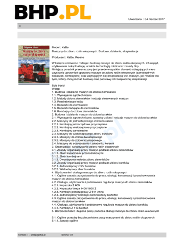 Utworzono : 04 marzec 2017 > Model : KaBe Maszyny do zbioru roślin okopowych. Budowa, działanie, eksploatacja Producent : KaBe, Krosno W książce omówiono rodzaje i budowę maszyn do zbioru roślin okopowych, ich napęd, użytkowanie i eksploatację, a także technologię robót oraz zasady bhp. Niniejszy poradnik przeznaczony jest przede wszystkim dla osób ubiegających się o uzyskanie uprawnień operatora maszyn do zbioru roślin okopowych (samojezdnych kopaczek, kombajnów) oraz zajmujących się eksploatacją ww. maszyn, jak również dla tych, którzy chcą poznać budowę oraz podstawy ich bezpiecznej eksploatacji. Spis treści Wstęp 1. Budowa i działanie maszyn do zbioru ziemniaków 1.1. Wymagania agrotechniczne 1.2. Metody zbioru ziemniaków i rodzaje stosowanych maszyn 1.3. Rozdrabniacze łętów 1.4. Kopaczki do ziemniaków 1.5. Kopaczki ładujące do ziemniaków 1.6. Kombajny do zbioru ziemniaków 2. Budowa i działanie maszyn do zbioru buraków 2.1. Wymagania agrotechniczne, sposoby zbioru i rodzaje maszyn do zbioru buraków 2.2. Maszyny do jednoetapowego zbioru buraków 2.2.1. Kombajny jednorzędowe przyczepiane 2.2.2. Kombajny wielorzędowe przyczepiane 2.2.3. Kombajny samojezdne 2.3. Maszyny do wieloetapowego zbioru buraków 2.3.1. Maszyny do zbioru dwuetapowego 2.3.2. Maszyny do zbioru trzyetapowego 2.4. Maszyny do oczyszczania i załadunku korzeni 3. Organizacja i wykonywanie zbioru roślin okopowych 3.1. Zasady organizacji pracy maszyn podczas zbioru ziemniaków 3.1.1. Zbiór kopaczkami przenośnikowymi 3.1.2. Zbiór kombajnami 3.1.3. Dwuetapowa metoda zbioru ziemniaków 3.2. Zasady organizacji pracy maszyn podczas zbioru buraków 3.2.1. Jednoetapowy zbiór buraków 3.2.2. Wieloetapowy zbiór buraków 4. Użytkowanie i obsługa maszyn do zbioru roślin okopowych 4.1. Ogólne zasady przygotowania do pracy, obsługi, konserwacji i przechowywania maszyn do zbioru ziemniaków 4.2. Obsługa, użytkowanie i podstawowe regulacje maszyn do zbioru ziemniaków 4.2.1. Kopaczka Z 609 4.2.2. Kopaczka Wega 1400/1600 Z 4.2.3. Kombajn jednorzędowy Z 644 Anna 4.2.4. Jednorzędowy kombajn ziemniaczany Kartoffel 4.3. Ogólne zasady przygotowania do pracy, obsługi, konserwacji i przechowywania maszyn do zbioru buraków 4.4. Obsługa, użytkowanie i podstawowe regulacje maszyn do zbioru buraków 4.4.1. Kombajn Z 413 Neptun 5. Bezpieczeństwo i higiena pracy podczas obsługi maszyn do zbioru roślin okopowych l .p P H B 5.1. Ogólne przepisy bezpieczeństwa pracy maszynami do zbioru roślin okopowych 5.1.1. Zasady ogólne kontakt : - [email protected] Strona 1/2 Utworzono : 04 marzec 2017 > 5.1.2. Główne zagrożenia 5.1.3. Nakazy i zakazy 5.1.4. Strefa zagrożenia 5.1.5. Bezpieczeństwo i ochrona zdrowia 5.1.6. Wymagania wobec personelu obsługującego i przeprowadzającego prace konserwacyjne 5.2. Przykładowe przepisy bezpieczeństwa pracy i obsługi maszyn do zbioru roślin okopowych 5.2.1. Kombajn jednorzędowy Z 644 Anna 5.2.2. Kombajn jednorzędowy Z 413 Neptun Cena : 32,00 zł Brutto ( 30,48 zł Netto) Dostępność: Produkt dostępny w naszym sklepie od 28 sierpieĹ 2015 P H l .p B kontakt : - [email protected] Strona 2/2