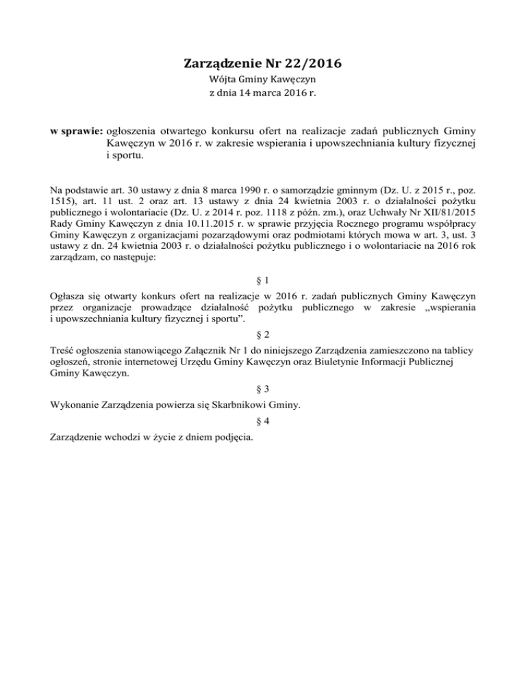 Zarządzenie Nr 22/2016 Wójta Gminy Kawęczyn z dnia 14 marca 2016 r. w sprawie: ogłoszenia otwartego konkursu ofert na realizacje zadań publicznych Gminy Kawęczyn w 2016 r. w zakresie wspierania i upowszechniania kultury fizycznej i sportu. Na podstawie art. 30 ustawy z dnia 8 marca 1990 r. o samorządzie gminnym (Dz. U. z 2015 r., poz. 1515), art. 11 ust. 2 oraz art. 13 ustawy z dnia 24 kwietnia 2003 r. o działalności poŜytku publicznego i wolontariacie (Dz. U. z 2014 r. poz. 1118 z późn. zm.), oraz Uchwały Nr XII/81/2015 Rady Gminy Kawęczyn z dnia 10.11.2015 r. w sprawie przyjęcia Rocznego programu współpracy Gminy Kawęczyn z organizacjami pozarządowymi oraz podmiotami których mowa w art. 3, ust. 3 ustawy z dn. 24 kwietnia 2003 r. o działalności poŜytku publicznego i o wolontariacie na 2016 rok zarządzam, co następuje: §1 Ogłasza się otwarty konkurs ofert na realizacje w 2016 r. zadań publicznych Gminy Kawęczyn przez organizacje prowadzące działalność poŜytku publicznego w zakresie „wspierania i upowszechniania kultury fizycznej i sportu”. §2 Treść ogłoszenia stanowiącego Załącznik Nr 1 do niniejszego Zarządzenia zamieszczono na tablicy ogłoszeń, stronie internetowej Urzędu Gminy Kawęczyn oraz Biuletynie Informacji Publicznej Gminy Kawęczyn. §3 Wykonanie Zarządzenia powierza się Skarbnikowi Gminy. §4 Zarządzenie wchodzi w Ŝycie z dniem podjęcia. Załącznik Nr 1 do Zarządzenia Nr 22/2016 Wójta Gminy Kawęczyn z dn. 14 marca 2016 r. Na podstawie art. 30 ustawy z dnia 8 marca 1990 r. o samorządzie gminnym (Dz. U. z 2015 r., poz. 1515), art. 11 ust. 2 oraz art. 13 ustawy z dnia 24 kwietnia 2003 r. o działalności poŜytku publicznego i wolontariacie (Dz. U. z 2014 r. poz. 1118 z późn. zm.), oraz Uchwały Nr XII/81/2015 Rady Gminy Kawęczyn z dnia 10.11.2015 r. w sprawie przyjęcia Rocznego programu współpracy Gminy Kawęczyn z organizacjami pozarządowymi oraz podmiotami których mowa w art. 3, ust. 3 ustawy z dn. 24 kwietnia 2003 r. o działalności poŜytku publicznego i o wolontariacie na 2016 rok Wójt Gminy Kawęczyn ogłasza otwarty konkurs ofert dla organizacji pozarządowych oraz podmiotów wymienionych w art. 3 ust. 3 ww. ustawy na realizację zadań w zakresie „wspierania i upowszechniania kultury fizycznej i sportu”. Celem zadania jest wsparcie lub powierzenie uprawnionym podmiotom (wyłonionym w konkursie), realizacji zadań publicznych w dziedzinie kultury fizycznej i sportu. I. Rodzaj zadania i wysokość środków publicznych przeznaczonych na realizację zadania: 1. Organizacja XVIII Regionalnych Zawodów w Skokach przez Przeszkody oraz XIII Otwartych Mistrzostwa Gminy Kawęczyn w PowoŜeniu Zaprzęgami Konnymi – 25 000,00 zł W roku 2015 z budŜetu gminy na realizacje zadań: - „Upowszechnianie kultury fizycznej i sportu wśród mieszkańców Gminy Kawęczyn poprzez organizację i udział w imprezach i zawodach sportowych o zasięgu lokalnym i regionalnym” udzielono jednej dotacji na kwotę 65.000,00 zł. – na Organizacja XVII Regionalnych Zawodów w Skokach przez Przeszkody oraz XII Otwartych Mistrzostwa Gminy Kawęczyn w PowoŜeniu Zaprzęgami Konnymi nie udzielono dotacji. II. Zasady przyznawania dotacji 1. Warunkiem przystąpienia do konkursu jest złoŜenie lub przesłanie oferty do Urzędu Gminy Kawęczyn. Oferta powinna być zgodna ze wzorem określonym w rozporządzeniu Ministra Pracy i Polityki Społecznej z dnia 15 grudnia 2010 r. w sprawie wzoru oferty i ramowego wzoru umowy dotyczącego realizacji zadania publicznego oraz wzoru sprawozdania z wykonania tego zadania (Dz. U. z 2011 r. Nr 6, poz. 25) 2. Do oferty naleŜy dołączyć oświadczenie o nie prowadzeniu działalności gospodarczej w rozumieniu art. 9 ustawy o działalności poŜytku publicznego i o wolontariacie, potwierdzone kopie aktualnych dokumentów dotyczących rejestracji (w przypadku składania dokumentów wystawionych wcześniej niŜ 6 miesięcy przed upływem terminu składania ofert załącza się oświadczenie o aktualnej treści tych dokumentów), potwierdzoną za zgodność z oryginałem kopie aktualnego statutu. 3. W przypadku braków formalnych złoŜonej oferty, komisja konkursowa powiadamia oferenta o moŜliwości uzupełnienia oferty w ciągu trzech dni roboczych. Oferty złoŜone po terminie oraz niekompletne, po uwzględnieniu wcześniej wspomnianego terminu nie będą rozpatrywane. 4. ZłoŜenie oferty nie jest równoznaczne z przyznaniem dotacji. 5. Poszczególnym podmiotom moŜe być przyznana więcej niŜ jedna dotacja. Wysokość przyznanej dotacji moŜe być niŜsza, niŜ wnioskowana w ofercie. W takim przypadku wnioskodawca moŜe przyjąć zmniejszenie kosztorysu zadania lub wycofać swoją ofertę. 6. Dopuszcza się przyznanie więcej niŜ jednej dotacji na poszczególne zadania w ramach przydzielonych środków. 7. Decyzję o udzieleniu dotacji podejmuje Wójt Gminy na podstawie opinii komisji konkursowej. 8. Skład komisji oraz regulamin jej pracy ustala Wójt Gminy w drodze zarządzenia. 9. Decyzja Wójta Gminy jest ostateczna. 10. Wójt Gminy zastrzega moŜliwość nierozstrzygnięcia konkursu. III. Termin i warunki realizacji zadania 1. Zadanie winno być wykonane w okresie od momentu podpisania umowy do 31.07.2016 r. 2. Zadanie winno być zrealizowane z najwyŜszą starannością zgodnie z zawartą umową oraz obowiązującymi standardami i przepisami w zakresie opisanym w ofercie. 3. Warunki realizacji zadania: Zadanie polega na zorganizowaniu i przeprowadzeniu XVIII Regionalnych Zawodów w Skokach przez Przeszkody oraz XIII Otwartych Mistrzostwa Gminy Kawęczyn w PowoŜeniu Zaprzęgami Konnymi w dniu 29 maja 2016 roku w tym: - promocja przedsięwzięcia, - zabezpieczeniu sanitarno – higienicznym, - zabezpieczeniem weterynaryjnym, - ubezpieczeniu przedsięwzięcia i uczestników, - zakup nagród dla uczestników zadania (np: medale, puchary, statuetki oraz inne ) - koszty merytoryczne (bez