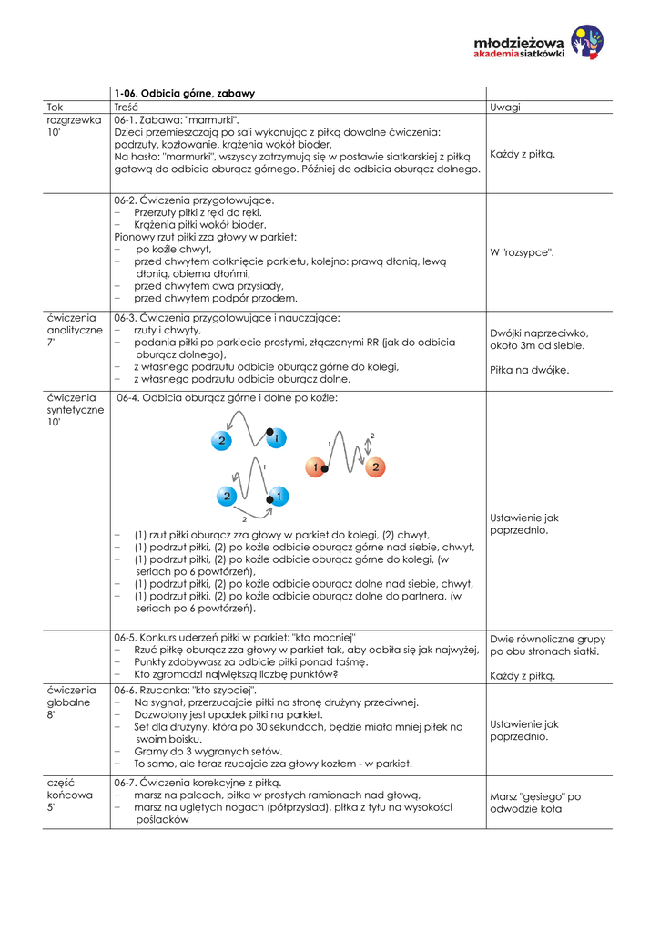 1-06. Odbicia górne, zabawy Tok Treść Uwagi rozgrzewka 10` 06