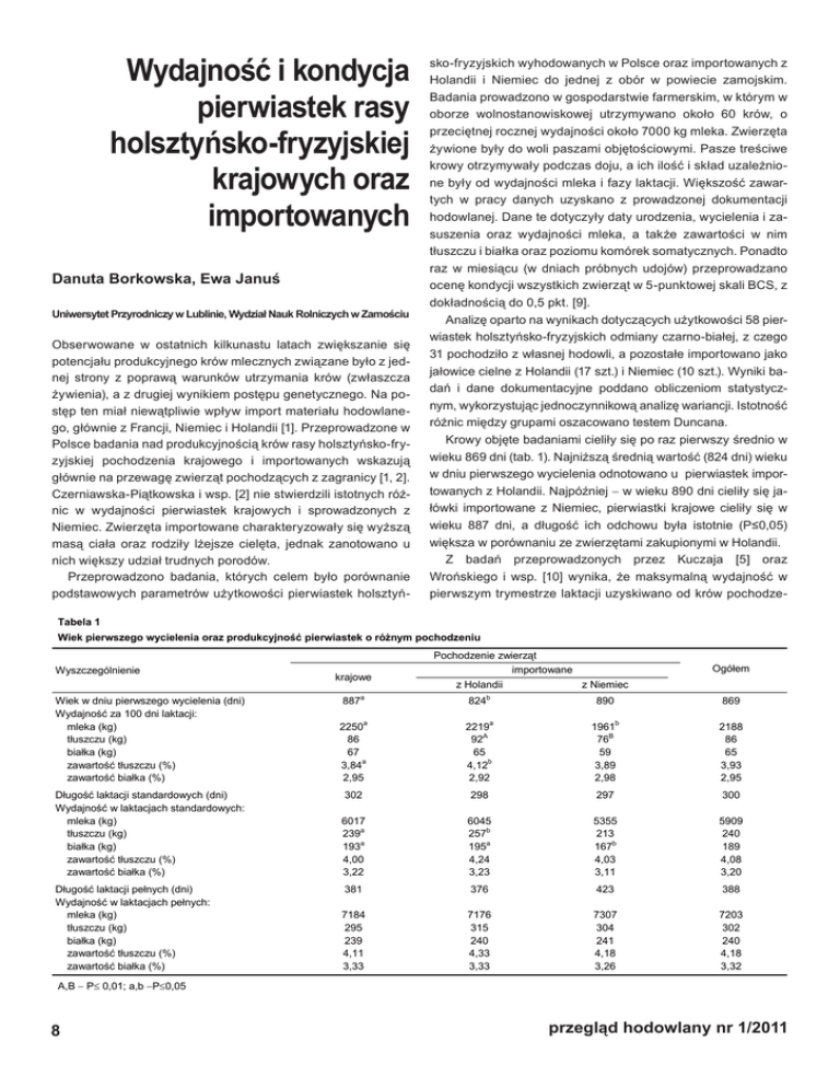 Wydajność i kondycja pierwiastek rasy holsztyńsko-fryzyjskiej krajowych oraz importowanych Danuta Borkowska, Ewa Januś Uniwersytet Przyrodniczy w Lublinie, Wydział Nauk Rolniczych w Zamościu Obserwowane w ostatnich kilkunastu latach zwiększanie się potencjału produkcyjnego krów mlecznych związane było z jednej strony z poprawą warunków utrzymania krów (zwłaszcza żywienia), a z drugiej wynikiem postępu genetycznego. Na postęp ten miał niewątpliwie wpływ import materiału hodowlanego, głównie z Francji, Niemiec i Holandii [1]. Przeprowadzone w Polsce badania nad produkcyjnością krów rasy holsztyńsko-fryzyjskiej pochodzenia krajowego i importowanych wskazują głównie na przewagę zwierząt pochodzących z zagranicy [1, 2]. Czerniawska-Piątkowska i wsp. [2] nie stwierdzili istotnych różnic w wydajności pierwiastek krajowych i sprowadzonych z Niemiec. Zwierzęta importowane charakteryzowały się wyższą masą ciała oraz rodziły lżejsze cielęta, jednak zanotowano u nich większy udział trudnych porodów. Przeprowadzono badania, których celem było porównanie podstawowych parametrów użytkowości pierwiastek holsztyń- sko-fryzyjskich wyhodowanych w Polsce oraz importowanych z Holandii i Niemiec do jednej z obór w powiecie zamojskim. Badania prowadzono w gospodarstwie farmerskim, w którym w oborze wolnostanowiskowej utrzymywano około 60 krów, o przeciętnej rocznej wydajności około 7000 kg mleka. Zwierzęta żywione były do woli paszami objętościowymi. Pasze treściwe krowy otrzymywały podczas doju, a ich ilość i skład uzależnione były od wydajności mleka i fazy laktacji. Większość zawartych w pracy danych uzyskano z prowadzonej dokumentacji hodowlanej. Dane te dotyczyły daty urodzenia, wycielenia i zasuszenia oraz wydajności mleka, a także zawartości w nim tłuszczu i białka oraz poziomu komórek somatycznych. Ponadto raz w miesiącu (w dniach próbnych udojów) przeprowadzano ocenę kondycji wszystkich zwierząt w 5-punktowej skali BCS, z dokładnością do 0,5 pkt. [9]. Analizę oparto na wynikach dotyczących użytkowości 58 pierwiastek holsztyńsko-fryzyjskich odmiany czarno-białej, z czego 31 pochodziło z własnej hodowli, a pozostałe importowano jako jałowice cielne z Holandii (17 szt.) i Niemiec (10 szt.). Wyniki badań i dane dokumentacyjne poddano obliczeniom statystycznym, wykorzystując jednoczynnikową analizę wariancji. Istotność różnic między grupami oszacowano testem Duncana. Krowy objęte badaniami cieliły się po raz pierwszy średnio w wieku 869 dni (tab. 1). Najniższą średnią wartość (824 dni) wieku w dniu pierwszego wycielenia odnotowano u pierwiastek importowanych z Holandii. Najpóźniej - w wieku 890 dni cieliły się jałówki importowane z Niemiec, pierwiastki krajowe cieliły się w wieku 887 dni, a długość ich odchowu była istotnie (P≤0,05) większa w porównaniu ze zwierzętami zakupionymi w Holandii. Z badań przeprowadzonych przez Kuczaja [5] oraz Wrońskiego i wsp. [10] wynika, że maksymalną wydajność w pierwszym trymestrze laktacji uzyskiwano od krów pochodze- Tabela 1 Wiek pierwszego wycielenia oraz produkcyjność pierwiastek o różnym pochodzeniu Wyszczególnienie Wiek w dniu pierwszego wycielenia (dni) Wydajność za 100 dni laktacji: mleka (kg) tłuszczu (kg) białka (kg) zawartość tłuszczu (%) zawartość białka (%) Długość laktacji standardowych (dni) Wydajność w laktacjach standardowych: mleka (kg) tłuszczu (kg) białka (kg) zawartość tłuszczu (%) zawartość białka (%) Długość laktacji pełnych (dni) Wydajność w laktacjach pełnych: mleka (kg) tłuszczu (kg) białka (kg) zawartość tłuszczu (%) zawartość białka (%) krajowe Pochodzenie zwierząt importowane z Holandii z Niemiec Ogółem 887a 824b 890 869 2250a 86 67 3,84a 2,95 2219a 92A 65 4,12b 2,92 1961b 76B 59 3,89 2,98 2188 86 65 3,93 2,95 302 298 297 300 6017 239a 193a 4,00 3,22 6045 257b 195a 4,24 3,23 5355 213 167b 4,03 3,11 5909 240 189 4,08 3,20 381 376 423 388 7184 295 239 4,11 3,33 7176 315 240 4,33 3,33 7307 304 241 4,18 3,26 7203 302 240 4,18 3,32 A,B - P≤ 0,01; a,b -P≤0,05 8 przegląd hodowlany nr 1/2011 nia krajowego. Zdaniem Wrońskiego i wsp. [10] wyniki uzyskiwane w poszczególnych odcinkach laktacji i próbnych udojach wskazują, że zastosowane żywienie uniemożliwiało ujawnienie się pełnych możliwości produkcyjnych zwierząt importowanych. Świadczyły o tym gorsze wyniki produkcyjne uzyskane przez te zwierzęta, w porównaniu z osiąganymi przez krowy z własnego chowu za pierwsze 100 dni laktacji. Także w badaniach własnych wykazano, że najwyższą wydajność za pierwsze 100 dni laktacji (2250 kg mleka) uzyskiwano od pierwiastek pochodzenia krajowego. Była ona wyższa od wydajności pierwiastek pochodzących z Holandii o 31 kg oraz od wydajności pierwiastek importowanych z Niemiec o 289 kg. Różnice pomiędzy średnimi wyliczonymi dla poszczególnych grup pierwiastek były statystycznie istotne przy P≤0,05. W zakresie wydajności tłuszczu najwyższą wartością w pierwszych 100 dniach po wycieleniu charakteryzowały się pierwiastki importowane z Holandii. Przeciętna wydajność tłuszczu tych zwierząt, wynosząca 92 kg, była o 6 kg wyższa w porównaniu z pierwiastkami krajowymi (różnica nieistotna) i o 16 kg w odniesieniu do pochodzących z Niemiec (P≤0,01). Mniejsze i statystycznie nieistotne różnice pomiędzy wyszcze- mleka (o 690 kg), tłuszczu (o 44 kg) i białka (o 28 kg) w porównaniu do pierwiastek importowanych z Holandii. Mleko to ponadto charakteryzowało się najniższą zawartością tłuszczu (4,03%) oraz białka (3,11%). Różnic tych nie potwierdzono statystycznie. Dla zwierząt importowanych z Niemiec wyliczono najwyższą średnią dotyczącą długości pełnej laktacji, co mogło świadczyć o problemach z zacieleniem w tej grupie pierwiastek. Analiza użytkowości zwierząt krajowych oraz importowanych, między