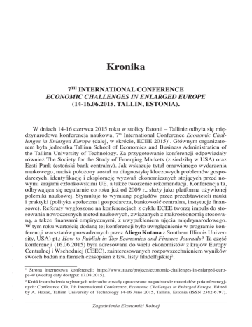 Kronika - - 7TH INTERNATIONAL CONFERENCE ECONOMIC CHALLENGES IN ENLARGED EUROPE (14-16.06.2015, TALLIN, ESTONIA). W dniach 14-16 czerwca 2015 roku w stolicy Estonii – Tallinie odbyła się międzynarodowa konferencja naukowa, 7th International Conference Economic Challenges in Enlarged Europe (dalej, w skrócie, ECEE 2015)1. Głównym organizatorem była jednostka Tallinn School of Economics and Business Administration of the Tallinn University of Technology. Za przygotowanie konferencji odpowiadały również The Society for the Study of Emerging Markets (z siedzibą w USA) oraz Eesti Pank (estoński bank centralny). Jak wskazuje tytuł omawianego wydarzenia naukowego, nacisk położony został na diagnostykę kluczowych problemów gospodarczych, identyfikację i eksplorację wyzwań ekonomicznych stojących przed nowymi krajami członkowskimi UE, a także tworzenie rekomendacji. Konferencja ta, odbywająca się regularnie co roku już od 2009 r., służy jako platforma ożywionej polemiki naukowej. Stymuluje to wymianę poglądów przez przedstawicieli nauki i praktyki (polityka społeczna i gospodarcza, bankowość centralna, instytucje finansowe). Referaty wygłoszone na konferencjach z cyklu ECEE tworzą impuls do stosowania nowoczesnych metod naukowych, związanych z makroekonomią stosowaną, a także finansami empirycznymi, z uwypukleniem ujęcia międzynarodowego. W tym roku wartością dodaną tej konferencji było uwzględnienie w programie konferencji warsztatów prowadzonych przez Aliego Kutana z Southern Illinois University, USA) pt.: How to Publish in Top Economics and Finance Journals? Ta część konferencji (16.06.2015) była adresowana do wielu ekonomistów z krajów Europy Centralnej i Wschodniej (CEEC), zainteresowanych rozpowszechnieniem wyników swoich badań na łamach czasopism z tzw. listy filadelfijskiej2. Strona internetowa konferencji: https://www.ttu.ee/projects/economic-challenges-in-enlarged-europe-4/ (według daty dostępu: 17.08.2015). 2 Krótkie omówienia wybranych referatów zostały opracowane na podstawie materiałów pokonferencyjnych: Conference CD, 7th International Conference, Economic Challenges in Enlarged Europe. Edited by A. Hazak, Tallinn University of Technology 14-16 June 2015, Tallinn, Estonia (ISSN 2382-6797). - - - 1 Zagadnienia Ekonomiki Rolnej Kronika Sesja plenarna (15.06.2015) prowadzona była przez Aaro Hazaka, reprezentującego Talinn Univerisity of Technology. Wykład inauguracyjny wygłosił Josef C. Brada (Professor Emeritus, Arizona State University, USA). Amerykański ekonomista zaprezentował wyniki badań empirycznych (współautorzy: Z. Drabek, J. Mendez i F. Marcos Perez) dotyczących oddziaływania korupcji na podejmowanie bezpośrednich inwestycji zagranicznych (foreign direct investment, FDI) przez korporacje międzynarodowe (multinational corporations, MNCs). Badacze poszukiwali odpowiedzi na pytania, jak „poziom korupcji” kraju goszczącego (host country) i kraju pochodzenia (home country), mierzony przez Transparency International corruption perception index, może oddziaływać na decyzje o podjęciu FDI przez MNC. Ekonomiści z zespołu J. Brady zaprezentowali model teoretyczny, a następnie, wykorzystując dane z 49 państw „home” i 167 „host” za lata 2005-2009, dokonali jego empirycznej weryfikacji (m.in. z zastosowaniem modeli tobitowych). Wzrost „poziomu korupcji” w państwach mogących potencjalnie przyjąć inwestycje bezpośrednie zmniejsza prawdopodobieństwo, a także wielkości inwestycji podejmowanych przez podmioty MNC. Należy także zauważyć, że korporacje międzynarodowe wypracowały techniki do radzenia sobie ze zjawiskiem korupcji, co stało się pewnego rodzaju ich „wartościową przewagą konkurencyjną”, umożliwiają zdobywanie nowych rynków. Uczestnicy konferencji mieli okazję zaprezentować wyniki swoich badań w ramach referatów, tematycznie przyporządkowanych do sesji roboczych, które tworzyły cztery bloki: makroekonomię (Macroeconomics), finanse (Finance), otoczenie gospodarcze (Economic Enviroment) i rynek pracy (Labour Market). W sumie, pierwszego dnia obrad konferencyjnych (15.06.2015) zaprezentowano 30 referatów w 10 sesjach, natomiast w drugim dniu (16.06.2015) przedstawiono 28 prezentacji podczas 9 sesji. W konferencji uczestniczyli naukowcy reprezentujący uczelnie akademickie, szkoły biznesu, instytuty badawcze, a także banki centralne i podmioty sektora prywatnego. Znaczna część uczestników pochodziła z krajów CEEC, w tym dosyć liczna była reprezentacja z Estonii. Biorąc pod uwagę kraje reprezentowane przez uczestników, konferencja ECEE 2015 miała wymiar dobitnie międzynarodowy, o czym wskazuje m. in. udział badaczy z USA, Chin czy Turcji. Wśród uczestników znalazło się również grono ekonomistów i finansistów z Polski, reprezentujących m. in. Szkołę Główną Handlową w Warszawie (SGH), Narodowy Bank Polski (NBP), Uniwersytet Warszawski, Uniwersytet Ekonomiczny w Poznaniu, Uniwersytet Warmińsko-Mazurski (UWM), Politechnikę Rzeszowską oraz Instytut Ekonomiki Rolnictwa i Gospodarki Żywnościowej − PIB (IERiGŻ-PIB). Oferowane są dosyć szerokie i interesujące możliwości publikacyjne, bowiem organizatorzy zaproponowali uczestnikom przesyłanie tzw. working papers do jednego z poniższych czasopism (z obowiązującą, relatywnie restrykcyjną procedurą publikacyjną): Emerging Markets Finance and Trade (EMFT); Eastern European Economic (EEE); Comparative Economic Studies (CES); Baltic Journal of Economic; (BJE); Baltic Journal of Management (BJM); Research in Economics and Business: Central and Eastern Europe (REB). Z wyjątkiem ostatniego periodyku, czasopisma te posiadają Impact Factor (IF). - - - - - 142 4(345) 2015 143 W sesjach z bloku o tematyce makroekonomicznej dominowały analizy związane z unijną polityką pieniężną, choć poruszane też były wybrane kwestie polityki fiskalnej (np. możliwości