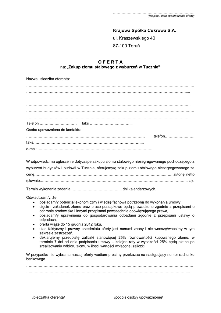 ………………………………………………………… (Miejsce i data sporządzenia oferty) Krajowa Spółka Cukrowa S.A. ul. Kraszewskiego 40 87-100 Toruń OFERTA na: „Zakup złomu stalowego z wyburzeń w Tucznie” Nazwa i siedziba oferenta: …………………………………………………………………………………………………………………….… ………………………………………………………………………………………………………………….... …………………………………………………………………………………………………………………….… ……………………………………………………………………………………………………………………. …………………….………………………………………………………………………………………………… ……………………………………………………………………………………………………………………. Telefon ………………………… faks …………………………….. Osoba upoważniona do kontaktu: …………………………………………………………………………………… telefon…………………… faks……………………………………………………………………………... e-mail:………………………………………………………………………………….. W odpowiedzi na ogłoszenie dotyczące zakupu złomu stalowego niesegregowanego pochodzącego z wyburzeń budynków i budowli w Tucznie, oferujemy/ę zakup złomu stalowego niesegregowanego za cenę…………………………………………………………………………………………….…….zł/tonę netto (słownie:……………………………………………………………………………………………………….. zł). Termin wykonania zadania ………………………………….. dni kalendarzowych. Oświadczam/y, że: · posiadam/y potencjał ekonomiczny i wiedzę fachową potrzebną do wykonania umowy, · cięcie i załadunek złomu oraz prace porządkowe będą prowadzone zgodnie z przepisami o ochronie środowiska i innymi przepisami powszechnie obowiązującego prawa, · posiadam/y uprawnienia do gospodarowania odpadami zgodnie z przepisami ustawy o odpadach, · oferta wiąże do 15 grudnia 2012 roku, · stan faktyczny i prawny przedmiotu oferty jest nam/mi znany i nie wnoszę/wnosimy w tym zakresie zastrzeżeń, · deklarujemy przedpłatę zaliczki stanowiącej 25% równowartości kupowanego złomu, w terminie 7 dni od dnia podpisania umowy – kolejne raty w wysokości 25% będą płatne po zrealizowaniu odbioru złomu w ilości wartości wpłaconej zaliczki W przypadku nie wybrania naszej oferty wadium prosimy przekazać na następujący numer rachunku bankowego ……………………………………………………………………………………………………………………… ….………………………………………………………………………………………………………………... /pieczątka oferenta/ /podpis osób/y upoważnionej/ Załączniki: 1. Oryginały lub poświadczone za zgodność z oryginałem przez osoby upoważnione do reprezentowania Oferenta z podaniem ich nazwisk oraz stanowisk służbowych, dokumenty (parafowanie każdej strony): § § § § Dowód wpłaty wadium, zaświadczenie o nadaniu numeru REGON, zaświadczenie o nadaniu numeru NIP, aktualny odpisu z Krajowego Rejestru Sądowego lub zaświadczenie o prowadzeniu działalności gospodarczej, wystawione nie wcześniej niż 6 miesięcy przed upływem terminu składania ofert, § aktualne zaświadczenie właściwego naczelnika urzędu skarbowego potwierdzające, że wykonawca nie zalega z opłaceniem podatków, opłat, wystawione nie wcześniej niż 3 miesiące przed upływem terminu do składania ofert, § dokumenty poświadczające posiadanie uprawnień do gospodarowania odpadami zgodnie z przepisami ustawy o odpadach oraz decyzje na prowadzenie działalności: odzysku, zbierania i transportu surowców wtórnych. /w przypadku, gdy oferent nie posiada zezwolenia na transport, winien złożyć oświadczenie, że podpisał umowę z podmiotem posiadającym decyzje na transport oraz dostarczyć kopie zezwolenia podmiotu na transport odpadów/.