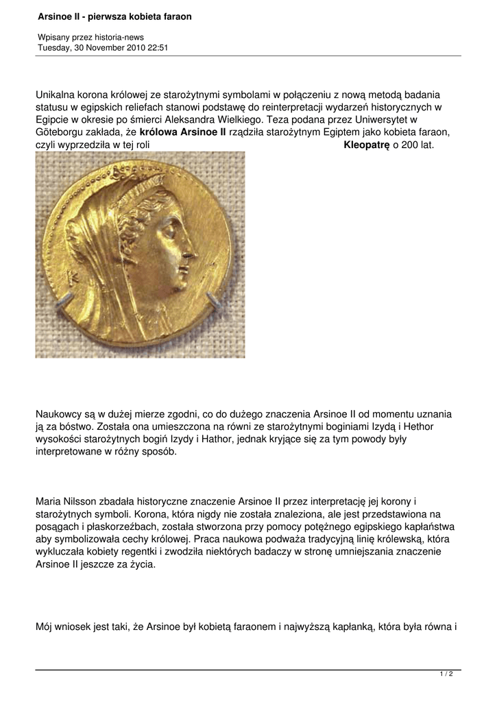 Arsinoe II - pierwsza kobieta faraon Wpisany przez historia-news Tuesday, 30 November 2010 22:51 Unikalna korona królowej ze starożytnymi symbolami w połączeniu z nową metodą badania statusu w egipskich reliefach stanowi podstawę do reinterpretacji wydarzeń historycznych w Egipcie w okresie po śmierci Aleksandra Wielkiego. Teza podana przez Uniwersytet w Göteborgu zakłada, że królowa Arsinoe II rządziła starożytnym Egiptem jako kobieta faraon, czyli wyprzedziła w tej roli Kleopatrę o 200 lat. Naukowcy są w dużej mierze zgodni, co do dużego znaczenia Arsinoe II od momentu uznania ją za bóstwo. Została ona umieszczona na równi ze starożytnymi boginiami Izydą i Hethor wysokości starożytnych bogiń Izydy i Hathor, jednak kryjące się za tym powody były interpretowane w różny sposób. Maria Nilsson zbadała historyczne znaczenie Arsinoe II przez interpretację jej korony i starożytnych symboli. Korona, która nigdy nie została znaleziona, ale jest przedstawiona na posągach i płaskorzeźbach, została stworzona przy pomocy potężnego egipskiego kapłaństwa aby symbolizowała cechy królowej. Praca naukowa podważa tradycyjną linię królewską, która wykluczała kobiety regentki i zwodziła niektórych badaczy w stronę umniejszania znaczenie Arsinoe II jeszcze za życia. Mój wniosek jest taki, że Arsinoe był kobietą faraonem i najwyższą kapłanką, która była równa i 1/2 Arsinoe II - pierwsza kobieta faraon Wpisany przez historia-news Tuesday, 30 November 2010 22:51 rządził wspólnie z bratem i mężem, i że była uznana za bóstwo podczas jej życia. To połączenie religii i polityki stało za jej wieloletnimi wpływami. Nie tylko Kleopatra chciała ponownie wykorzystać koronę Arsinoe. Jej męscy potomkowie – wszyscy o imieniu Ptolemeusz – używali tej korony jako szablonu dla nowych koron, które później składali bogini Hathor w uznaniu lokalnego duchowieństwa i dla zyskania wsparcia, gdy Egipt był w ogniu wojny domowej. Badanie Nilsson otwiera drogę do dalszych badań nad egipskimi koronami jako symbolami władzy i statusu, a także rozwoju sztuki w bardziej ogólnym sensie. Czytaj artykuł źródłowy 2/2