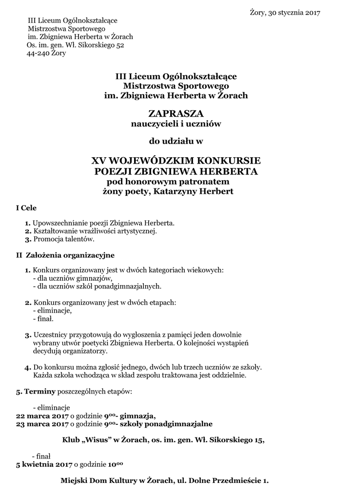 Żory, 30 stycznia 2017 III Liceum Ogólnokształcące Mistrzostwa Sportowego im. Zbigniewa Herberta w Żorach Os. im. gen. Wł. Sikorskiego 52 44-240 Żory III Liceum Ogólnokształcące Mistrzostwa Sportowego im. Zbigniewa Herberta w Żorach ZAPRASZA nauczycieli i uczniów do udziału w XV WOJEWÓDZKIM KONKURSIE POEZJI ZBIGNIEWA HERBERTA pod honorowym patronatem żony poety, Katarzyny Herbert I Cele 1. Upowszechnianie poezji Zbigniewa Herberta. 2. Kształtowanie wrażliwości artystycznej. 3. Promocja talentów. II Założenia organizacyjne 1. Konkurs organizowany jest w dwóch kategoriach wiekowych: - dla uczniów gimnazjów, - dla uczniów szkół ponadgimnazjalnych. 2. Konkurs organizowany jest w dwóch etapach: - eliminacje, - finał. 3. Uczestnicy przygotowują do wygłoszenia z pamięci jeden dowolnie wybrany utwór poetycki Zbigniewa Herberta. O kolejności wystąpień decydują organizatorzy. 4. Do konkursu można zgłosić jednego, dwóch lub trzech uczniów ze szkoły. Każda szkoła wchodząca w skład zespołu traktowana jest oddzielnie. 5. Terminy poszczególnych etapów: - eliminacje 22 marca 2017 o godzinie 900- gimnazja, 23 marca 2017 o godzinie 900- szkoły ponadgimnazjalne Klub „Wisus” w Żorach, os. im. gen. Wł. Sikorskiego 15, - finał 5 kwietnia 2017 o godzinie 1000 Miejski Dom Kultury w Żorach, ul. Dolne Przedmieście 1. 6. W przypadku mniejszej niż przewidywana liczby kandydatów, organizator zastrzega sobie prawo do rezygnacji z eliminacji, jednocześnie zobowiązuje się do poinformowania o zmianach zainteresowanych. 7. W przypadku dużej liczby kandydatów, organizator zastrzega sobie prawo do przeprowadzenia eliminacji w dodatkowym terminie, jednocześnie zobowiązuje się do poinformowania o zmianach zainteresowanych. 8. Warunkiem uczestnictwa w Konkursie jest przesłanie do dnia 15 marca 2017 załączonej karty uczestnika (również do pobrania na stronie szkoły) na adres: III Liceum Ogólnokształcące Mistrzostwa Sportowego im. Zbigniewa Herberta w Żorach os. im. gen. Wł. Sikorskiego 52 44-240 Żory lub pocztą elektroniczną: [email protected] Informacje i listy uczestników na stronie szkoły: www.zs3zory.aplus.pl Ewentualne pytania kierować drogą elektroniczną na adres [email protected] 9. Karty zgłoszenia nieczytelne lub niekompletne dyskwalifikują uczestnika. 10. Podczas Konkursu obowiązuje recytacja zadeklarowanego utworu. III Kryteria oceny 1. Oceny prezentacji na każdym etapie konkursu dokonuje jury powołane przez organizatora. 2. Ocena jury jest ostateczna i nie przysługuje od niej odwołanie. 4. Prezentacje oceniane będą pod względem doboru repertuaru, interpretacji utworu oraz kultury słowa. 5. Do finału zostanie zakwalifikowanych po 10-u uczestników z każdej kategorii. IV Nagrody Wszyscy finaliści wezmą udział w warsztatach scenicznych - 29.03.2017r., klub „Wisus” w Żorach. Przewidujemy również atrakcyjne nagrody rzeczowe. Z poważaniem Krystyna Ostrowska Dyrektor Zespołu Szkół Nr 3 w Żorach