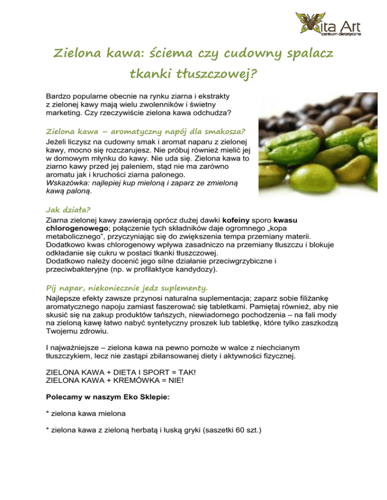 Zielona kawa: ściema czy cudowny spalacz tkanki tłuszczowej? Bardzo popularne obecnie na rynku ziarna i ekstrakty z zielonej kawy mają wielu zwolenników i świetny marketing. Czy rzeczywiście zielona kawa odchudza? Zielona kawa – aromatyczny napój dla smakosza? Jeżeli liczysz na cudowny smak i aromat naparu z zielonej kawy, mocno się rozczarujesz. Nie próbuj również mielić jej w domowym młynku do kawy. Nie uda się. Zielona kawa to ziarno kawy przed jej paleniem, stąd nie ma zarówno aromatu jak i kruchości ziarna palonego. Wskazówka: najlepiej kup mieloną i zaparz ze zmieloną kawą paloną. Jak działa? Ziarna zielonej kawy zawierają oprócz dużej dawki kofeiny sporo kwasu chlorogenowego; połączenie tych składników daje ogromnego „kopa metabolicznego”, przyczyniając się do zwiększenia tempa przemiany materii. Dodatkowo kwas chlorogenowy wpływa zasadniczo na przemiany tłuszczu i blokuje odkładanie się cukru w postaci tkanki tłuszczowej. Dodatkowo należy docenić jego silne działanie przeciwgrzybiczne i przeciwbakteryjne (np. w profilaktyce kandydozy). Pij napar, niekoniecznie jedz suplementy. Najlepsze efekty zawsze przynosi naturalna suplementacja; zaparz sobie filiżankę aromatycznego napoju zamiast faszerować się tabletkami. Pamiętaj również, aby nie skusić się na zakup produktów tańszych, niewiadomego pochodzenia – na fali mody na zieloną kawę łatwo nabyć syntetyczny proszek lub tabletkę, które tylko zaszkodzą Twojemu zdrowiu. I najważniejsze – zielona kawa na pewno pomoże w walce z niechcianym tłuszczykiem, lecz nie zastąpi zbilansowanej diety i aktywności fizycznej. ZIELONA KAWA + DIETA I SPORT = TAK! ZIELONA KAWA + KREMÓWKA = NIE! Polecamy w naszym Eko Sklepie: * zielona kawa mielona * zielona kawa z zieloną herbatą i łuską gryki (saszetki 60 szt.)